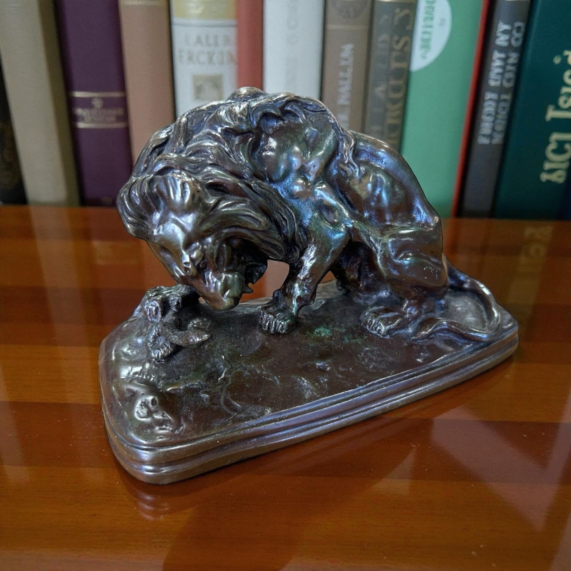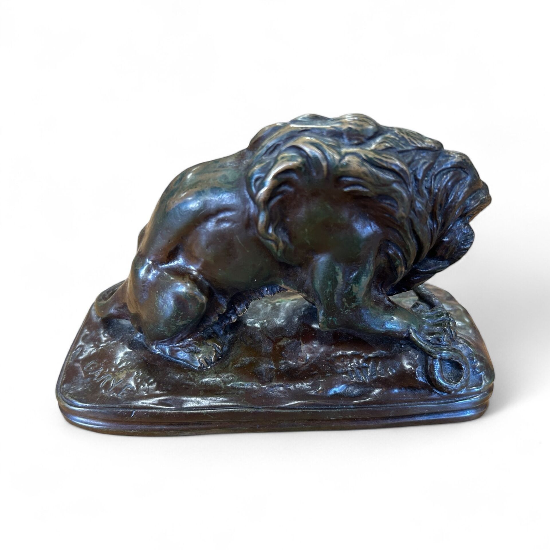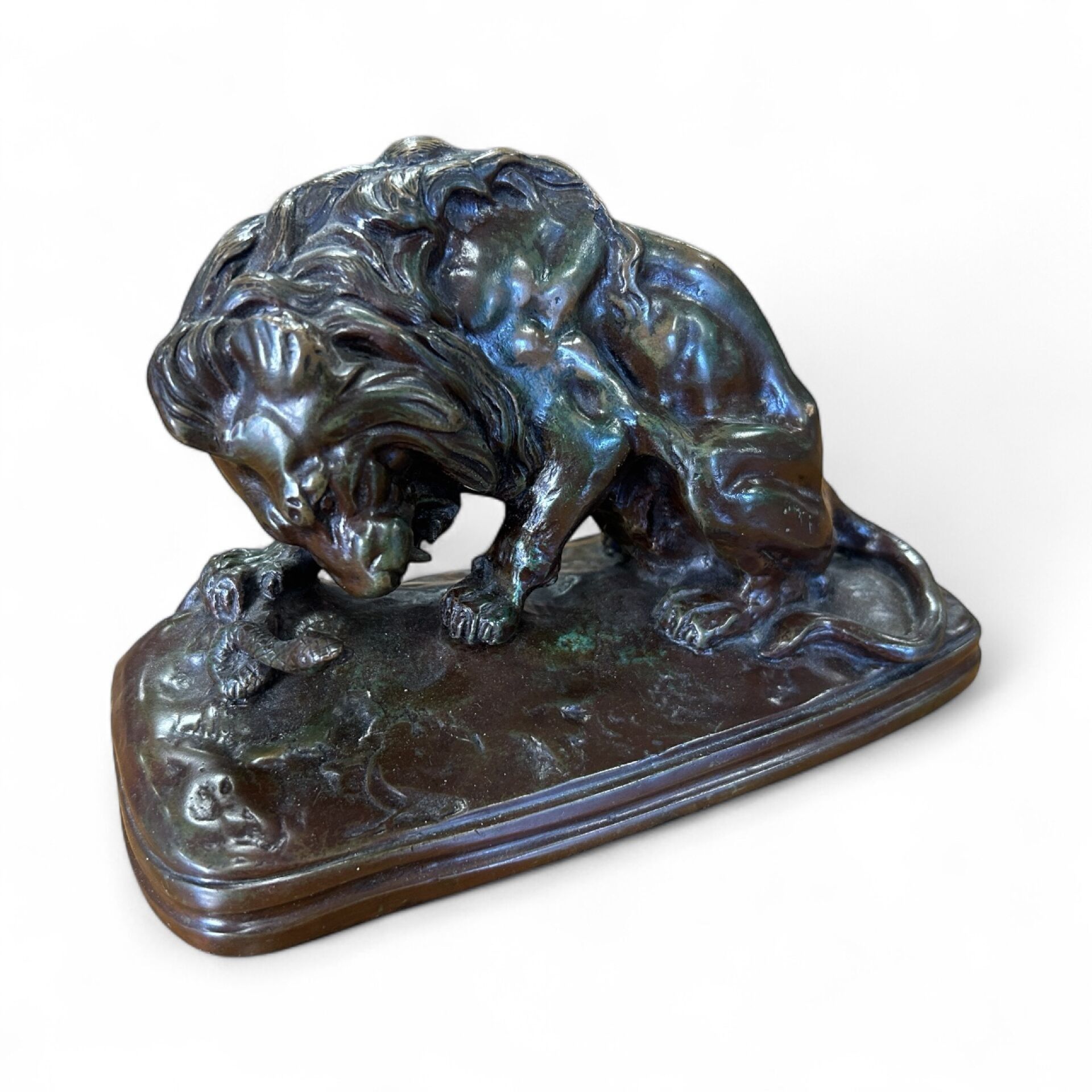 * Antoine Louis BARYE ( 1795 - 1875 ), after. "Lion attacking a snake". Bronze sculpture with brown and greenish patina (patina wear in places). Signed on the terrace. H. 12,2 cm L. 20,5 cm