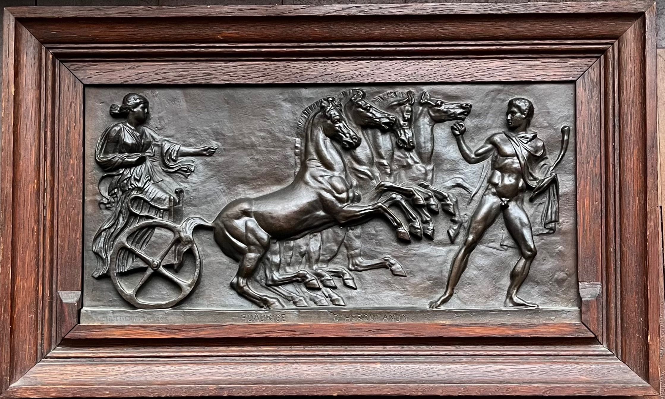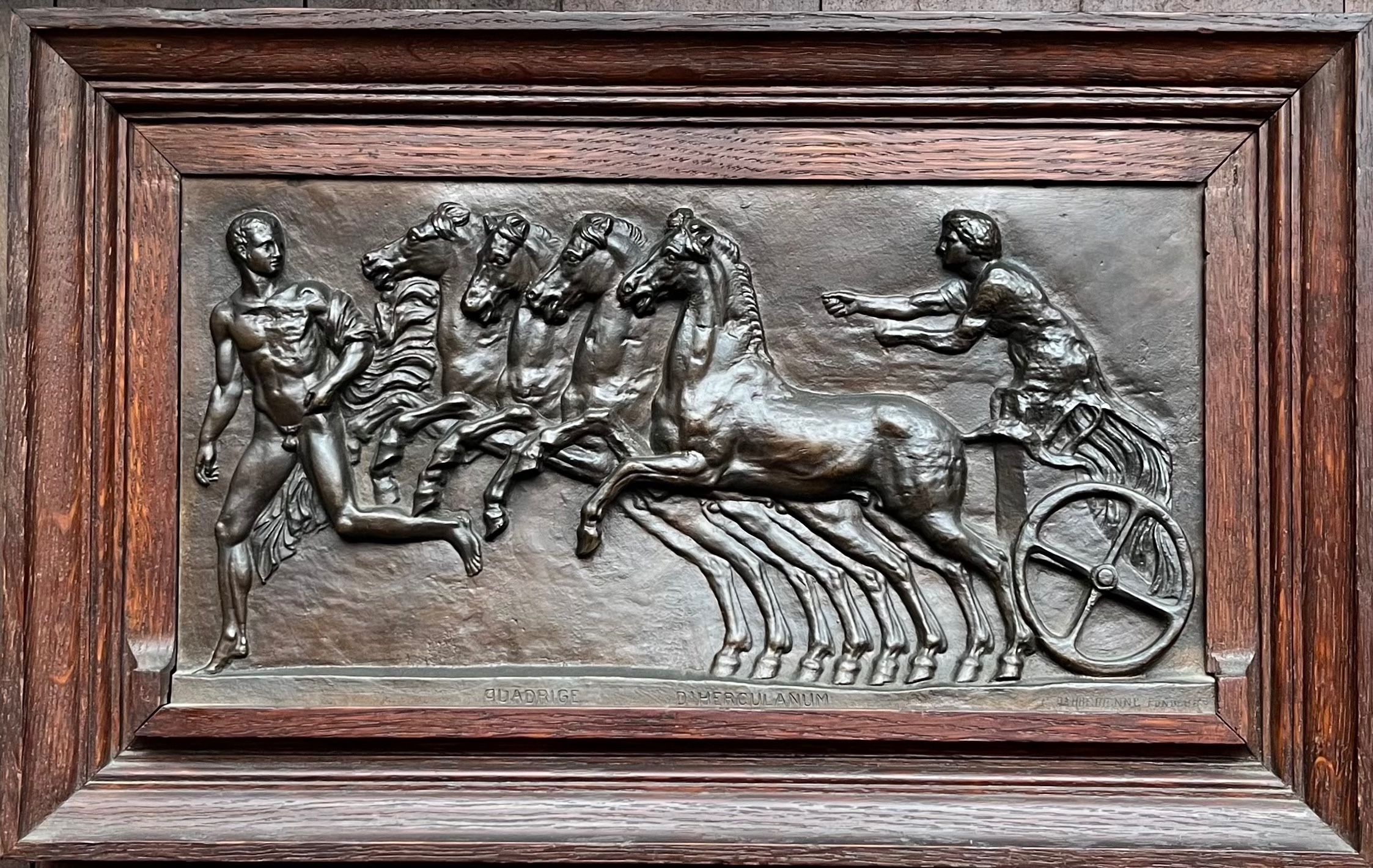 Ferdinand BARBEDIENNE (1810-1892) Pair of low relief bronze plaques with brown patina "Quadriga of Herculaneum", signed F. Barbedienne Fondeur, 17 x 34.5 cm
