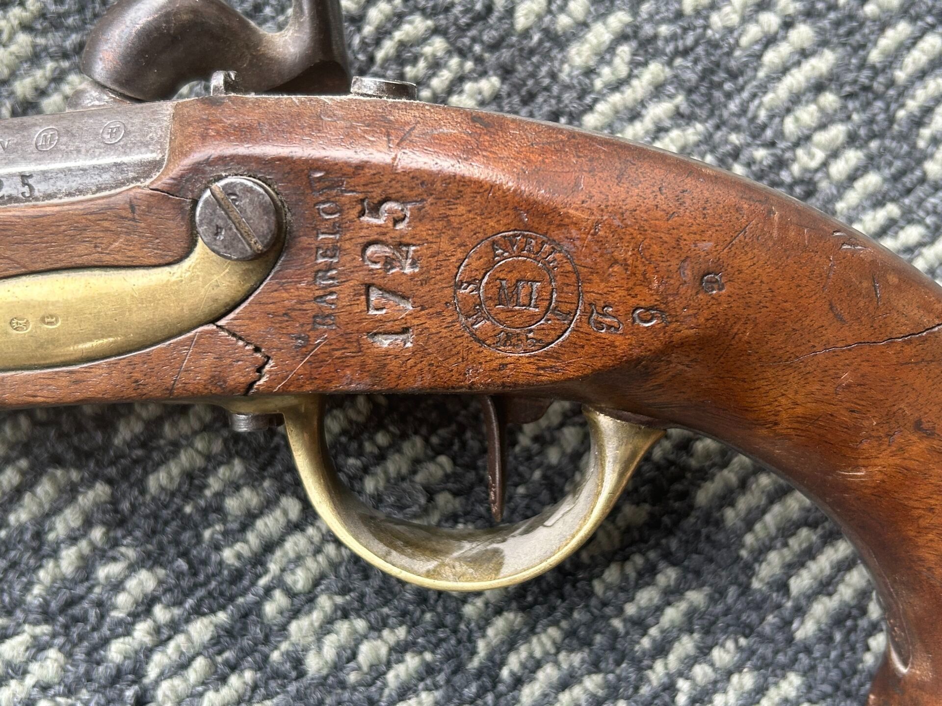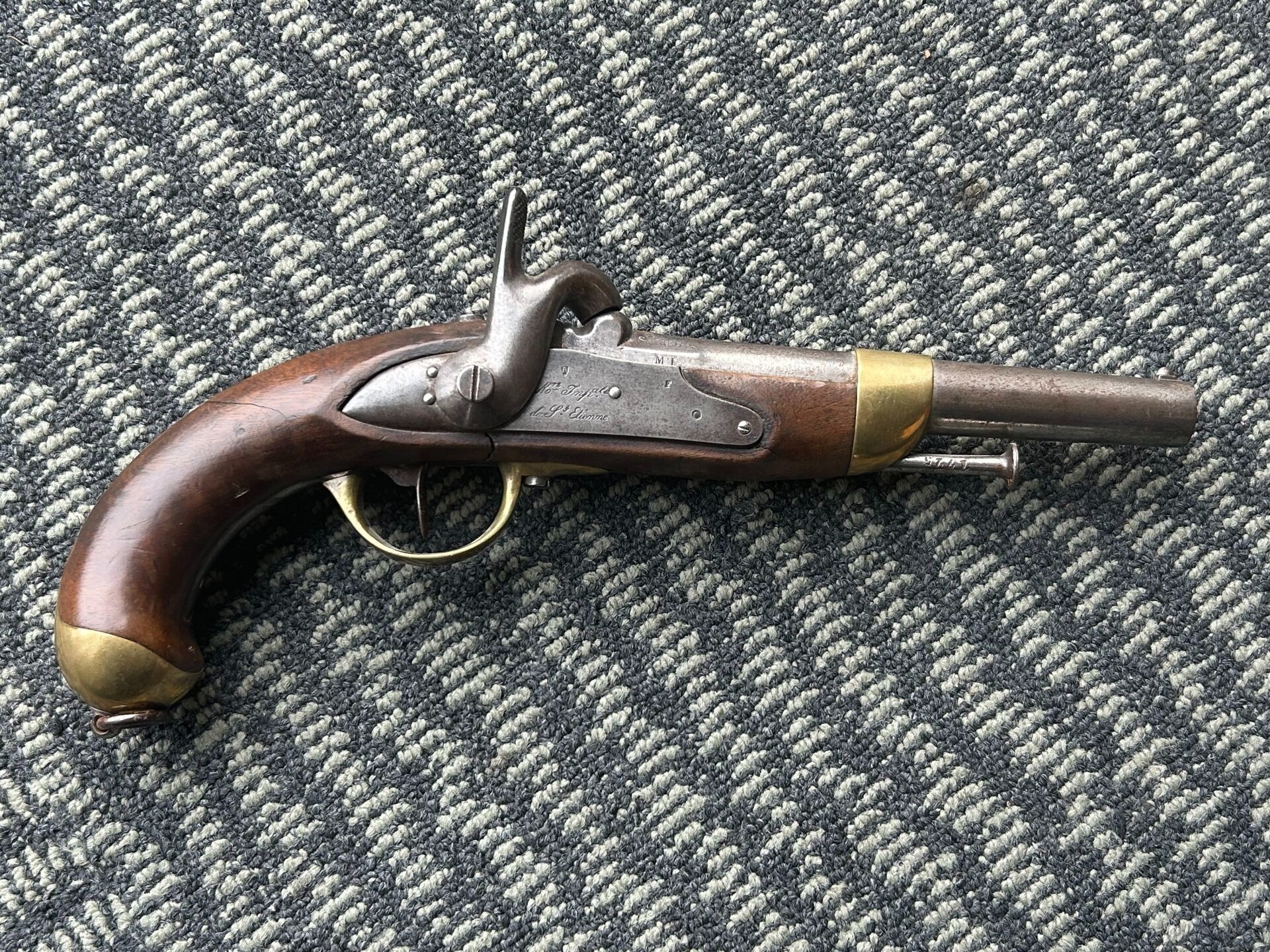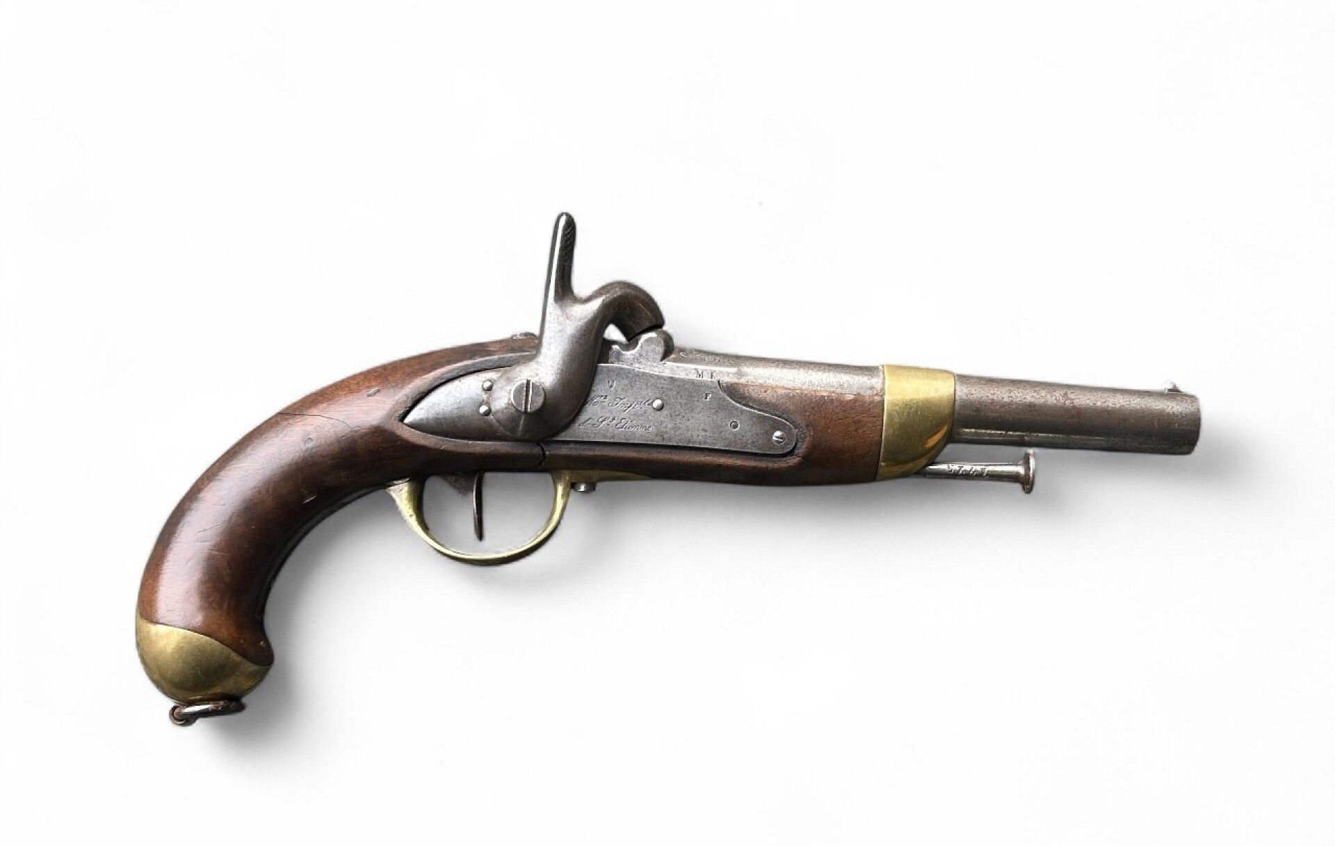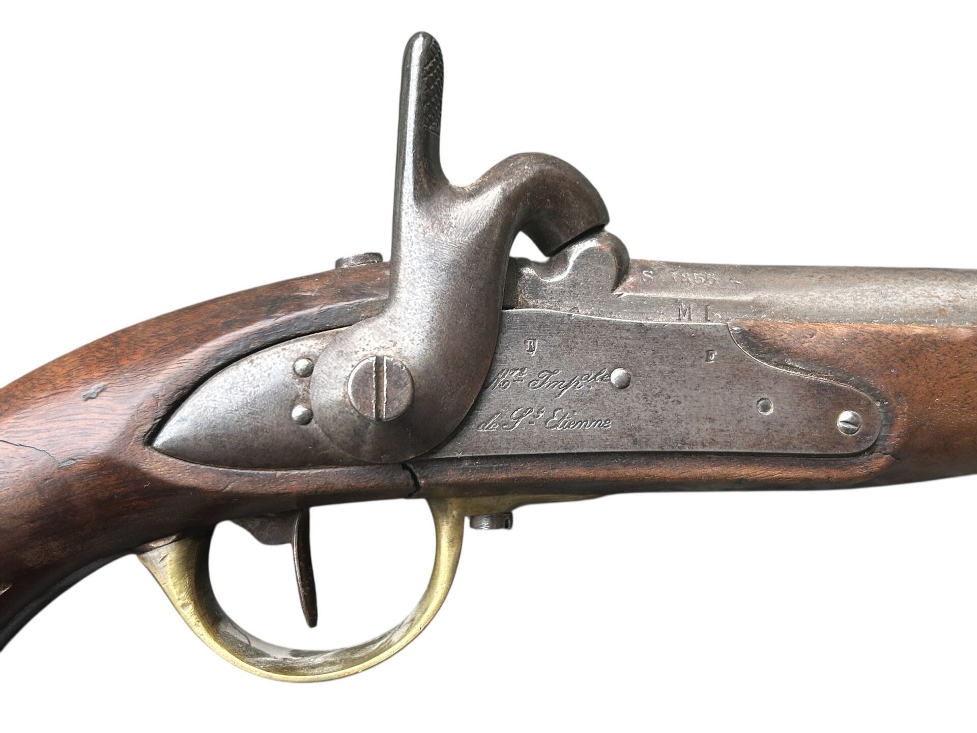 * Second Empire cavalry pistol for collection, Model 1822. Manufacture Impériale de Saint-Étienne. Dated April 1855, walnut, brass and steel stock. Point out cracks. Functional mechanism. Length 35,5 cm.