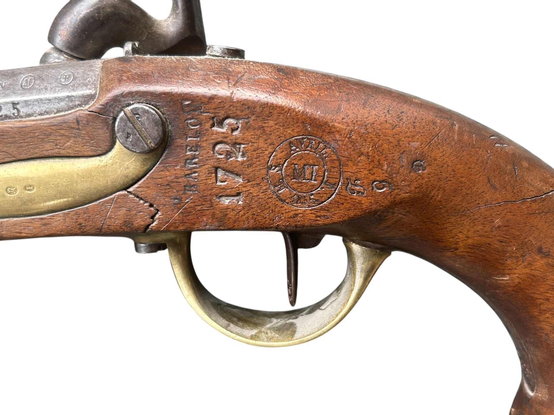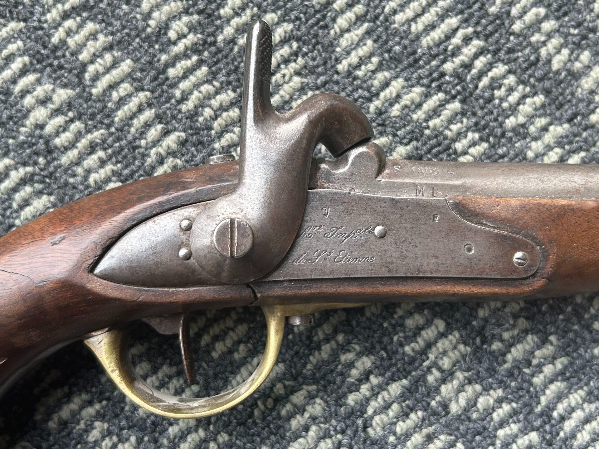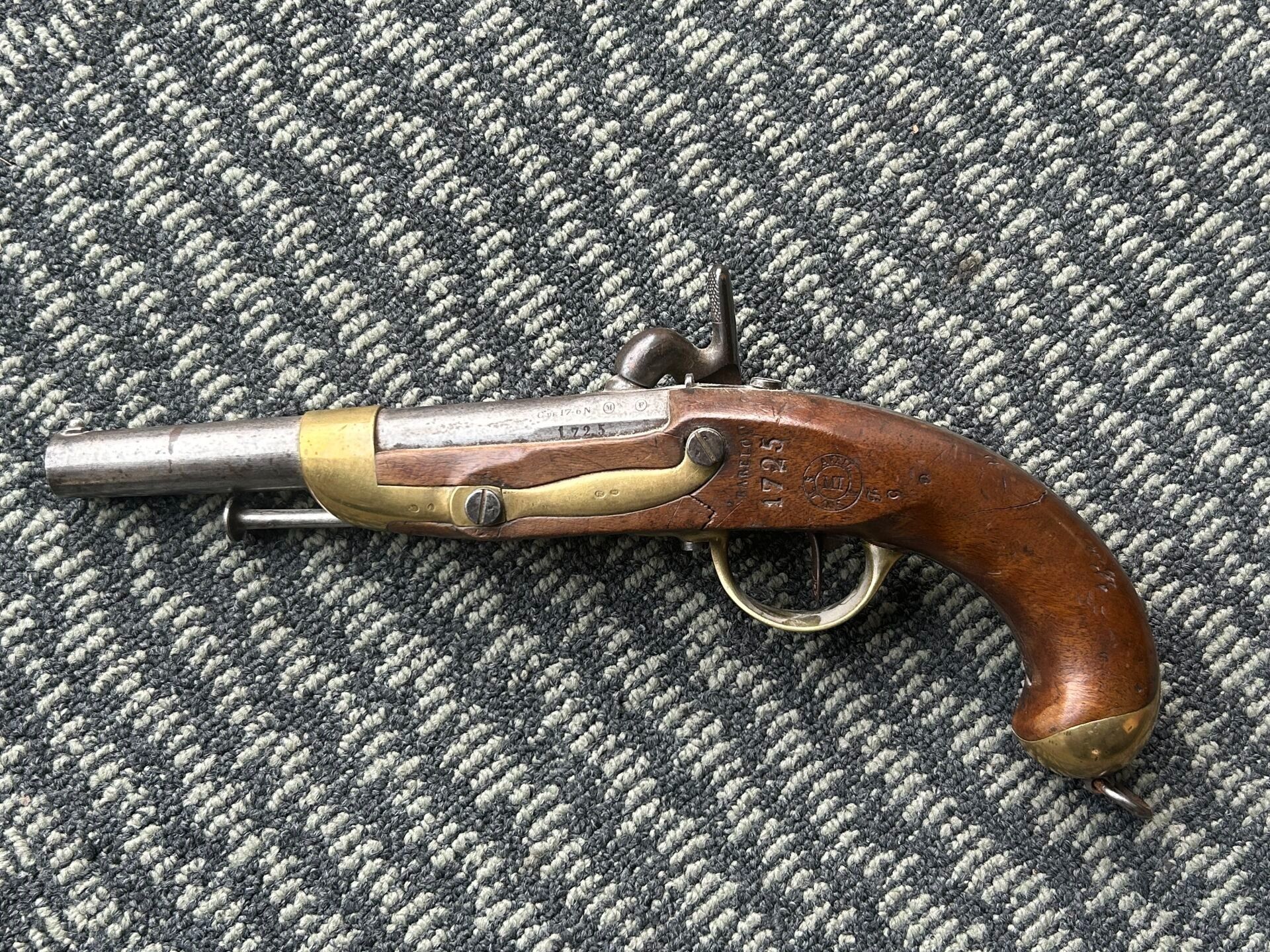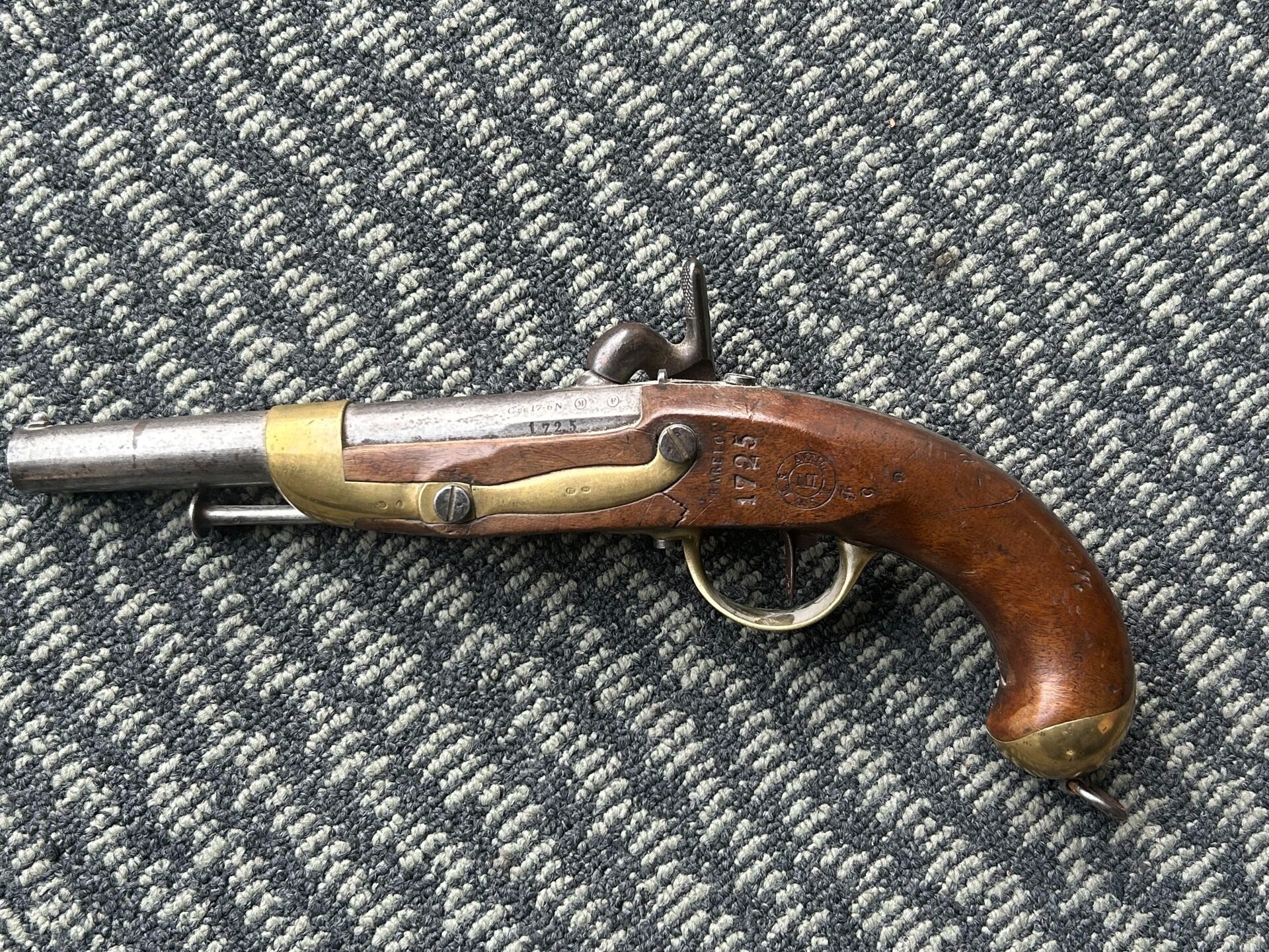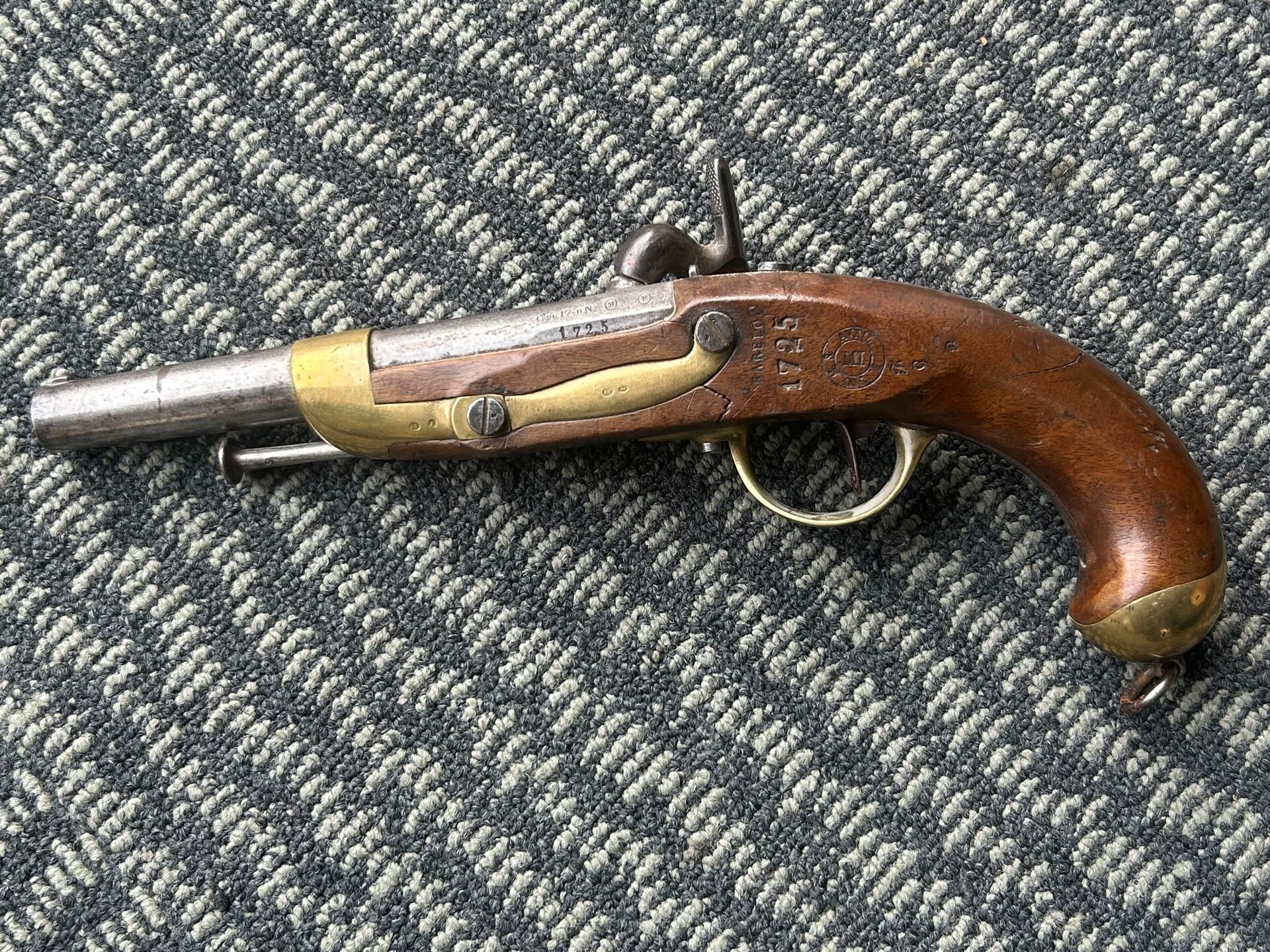 * Second Empire cavalry pistol for collection, Model 1822. Manufacture Impériale de Saint-Étienne. Dated April 1855, walnut, brass and steel stock. Point out cracks. Functional mechanism. Length 35,5 cm.