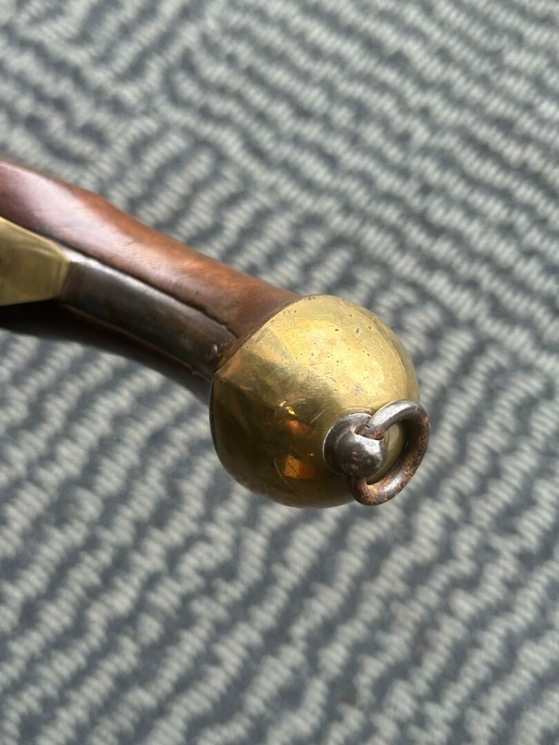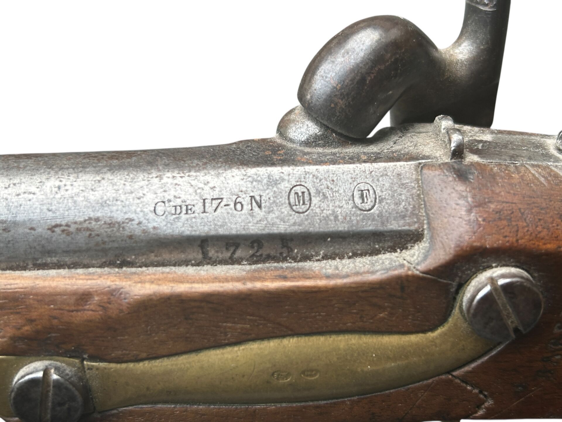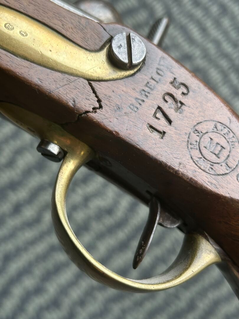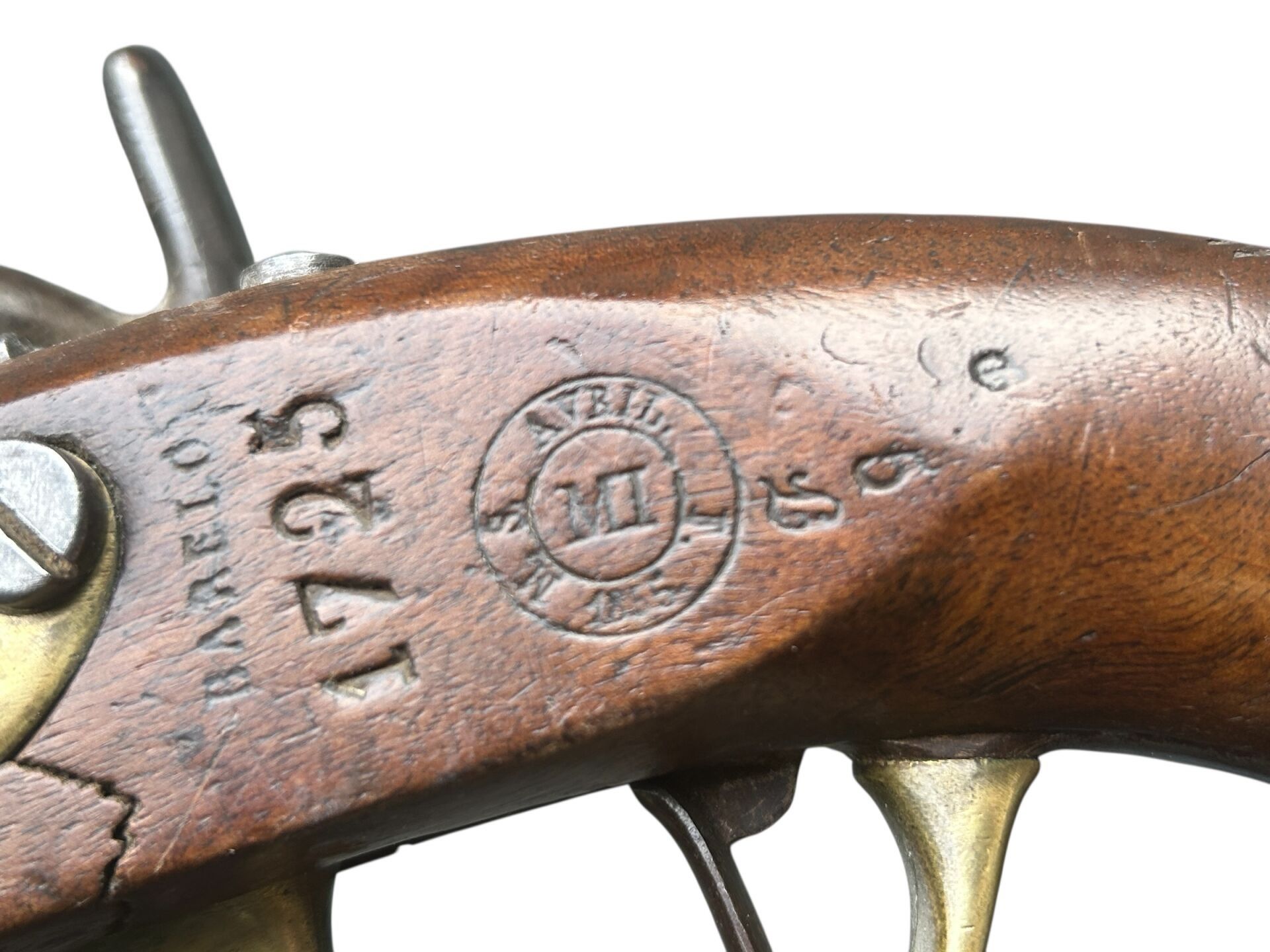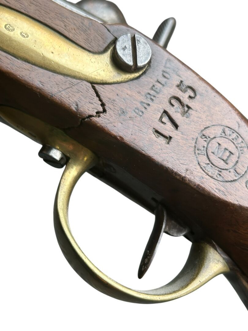 * Second Empire cavalry pistol for collection, Model 1822. Manufacture Impériale de Saint-Étienne. Dated April 1855, walnut, brass and steel stock. Point out cracks. Functional mechanism. Length 35,5 cm.