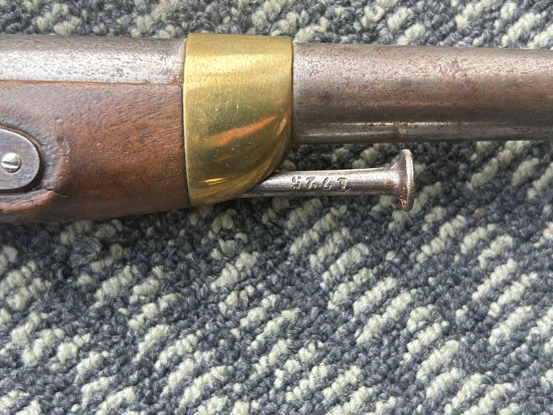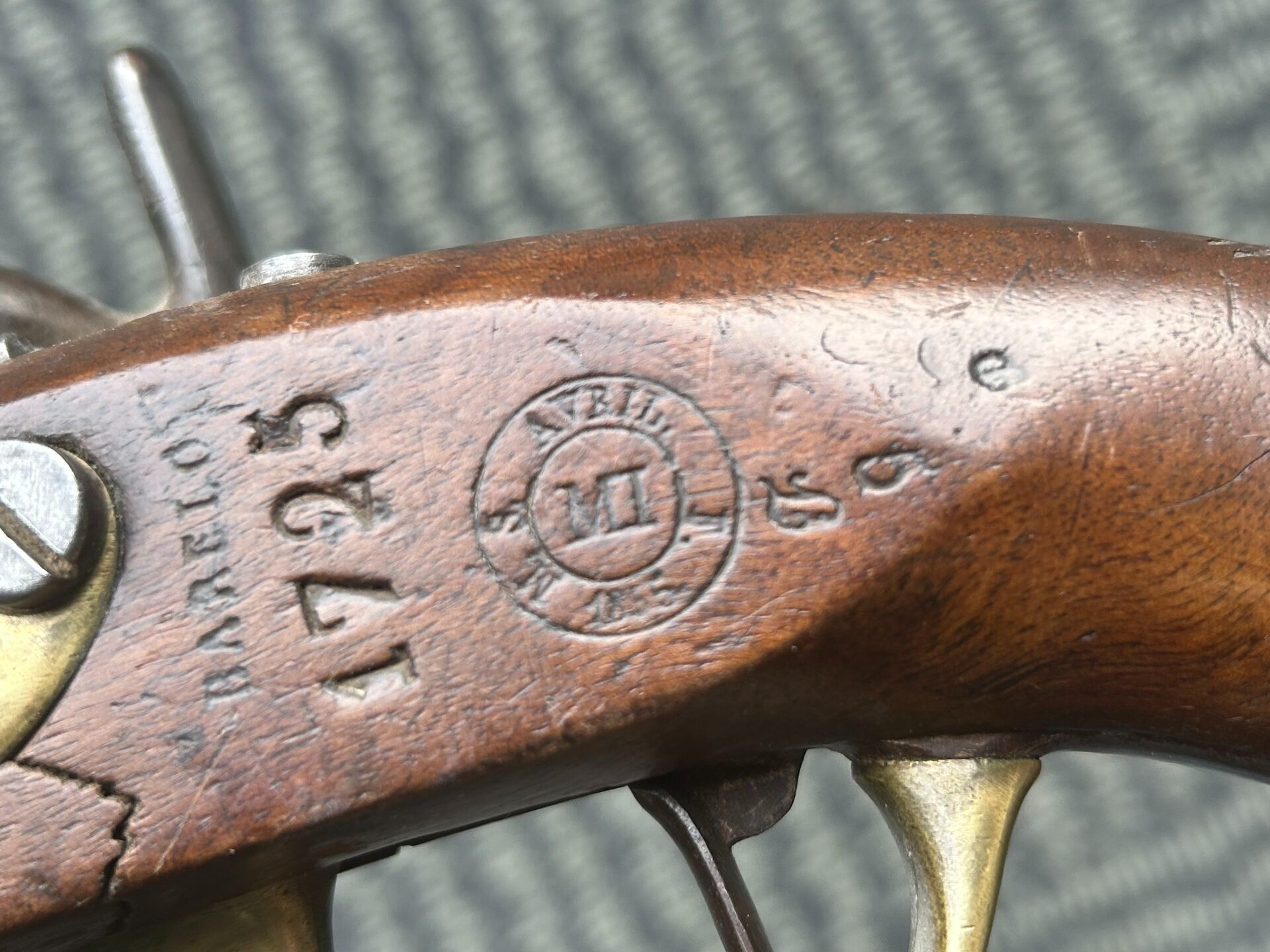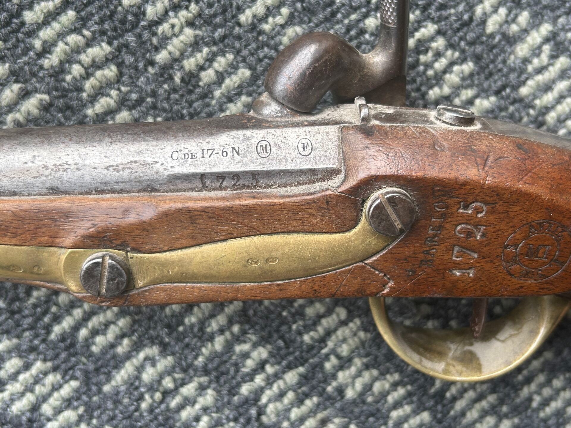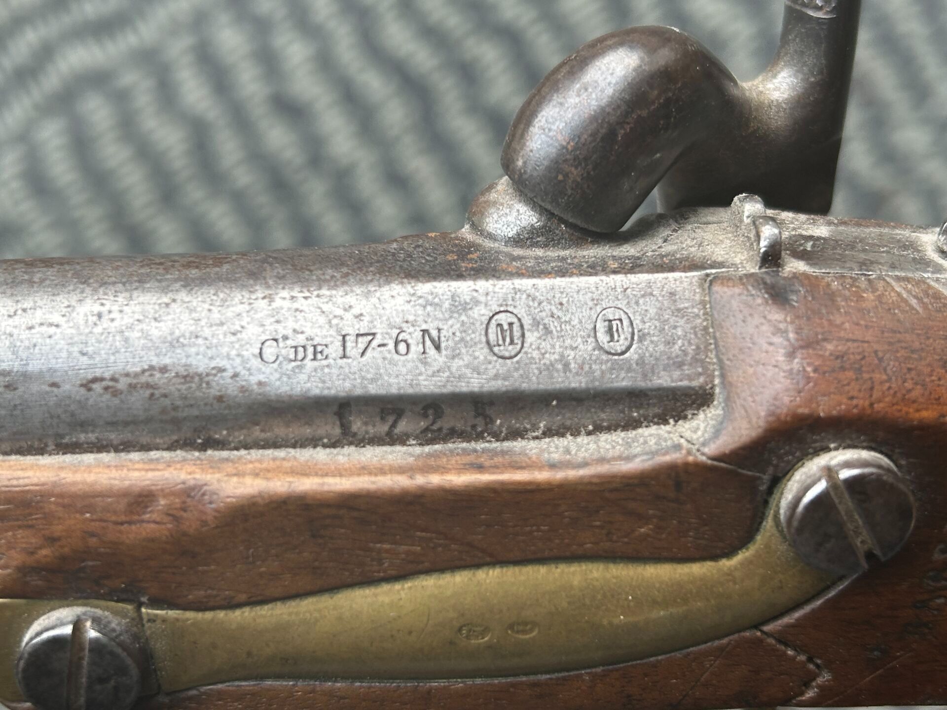 * Second Empire cavalry pistol for collection, Model 1822. Manufacture Impériale de Saint-Étienne. Dated April 1855, walnut, brass and steel stock. Point out cracks. Functional mechanism. Length 35,5 cm.