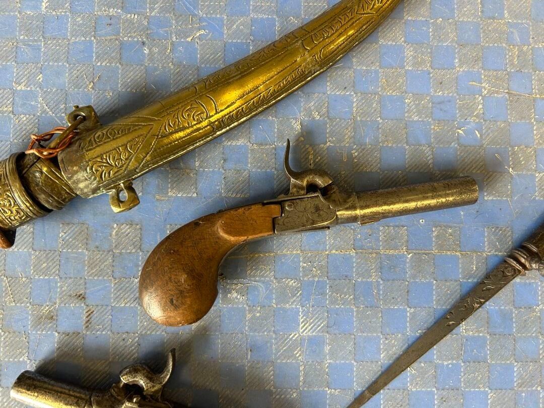 * Lot of two small 19th century pistols, a stylus (accidents) and a Middle Eastern dagger with gilt brass scabbard (as is).