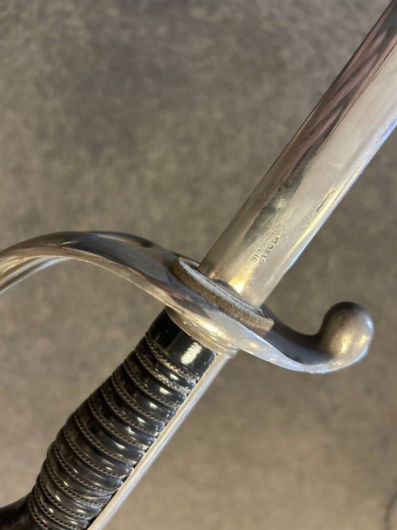 * Infantry officer's sabre model 1882, nickel-plated metal and horn frame, three-prong hilt, watermarked black horn spindle, straight blade with full-length groove from the French manufacture in Saint Etienne, nickel-plated iron scabbard with one strap and symmetrical stinger. Blade length: 84.5 cm