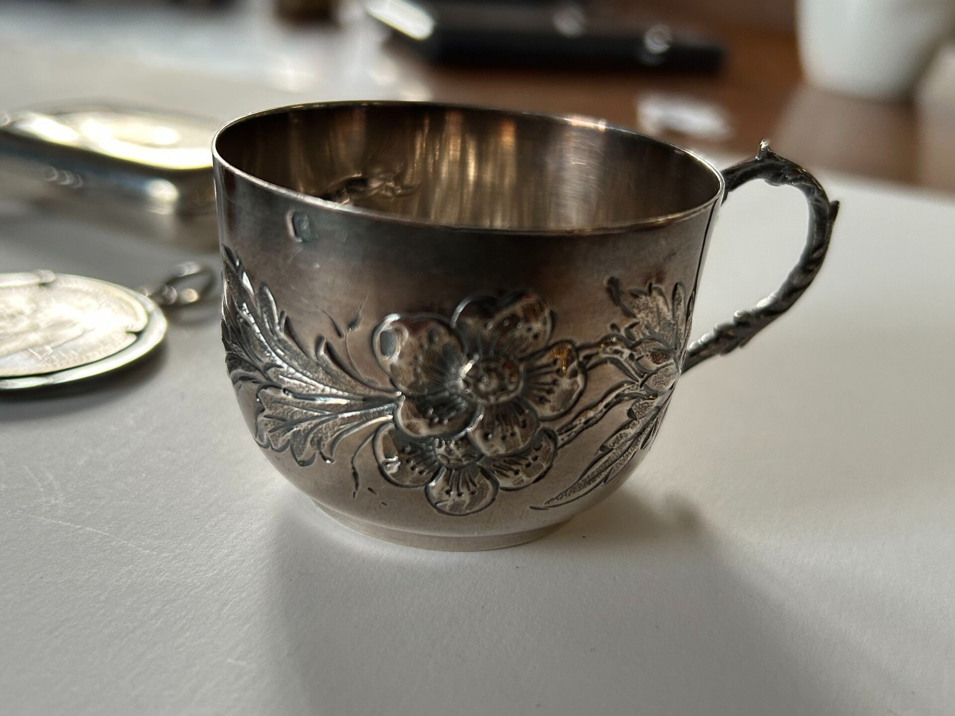 Set comprising a 925 thousandths silver mug with floral deco…