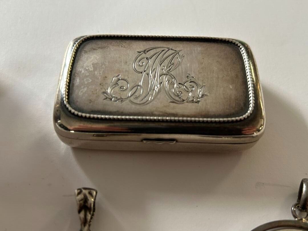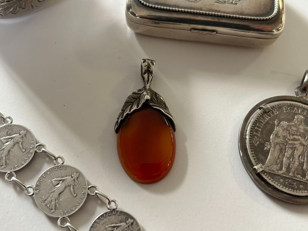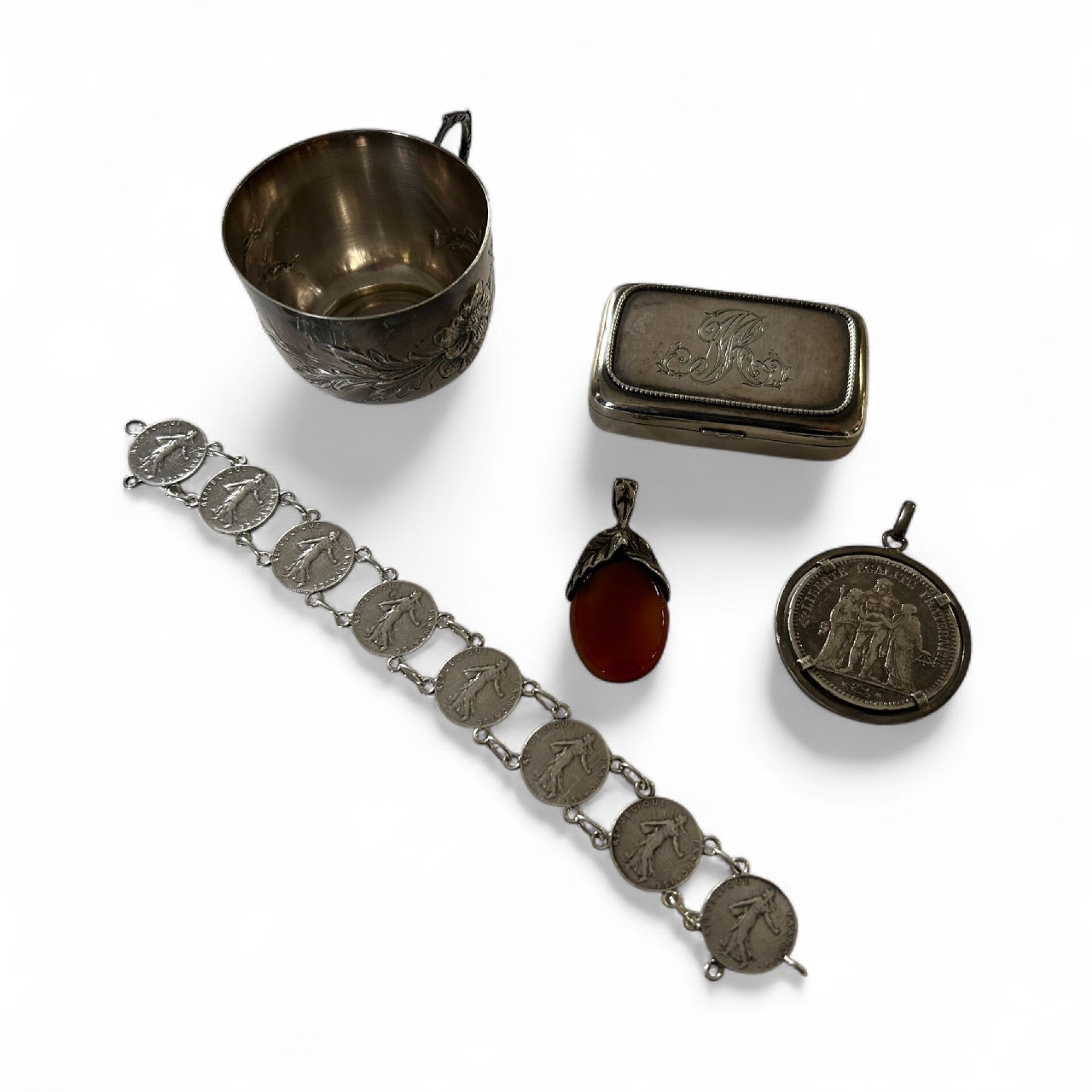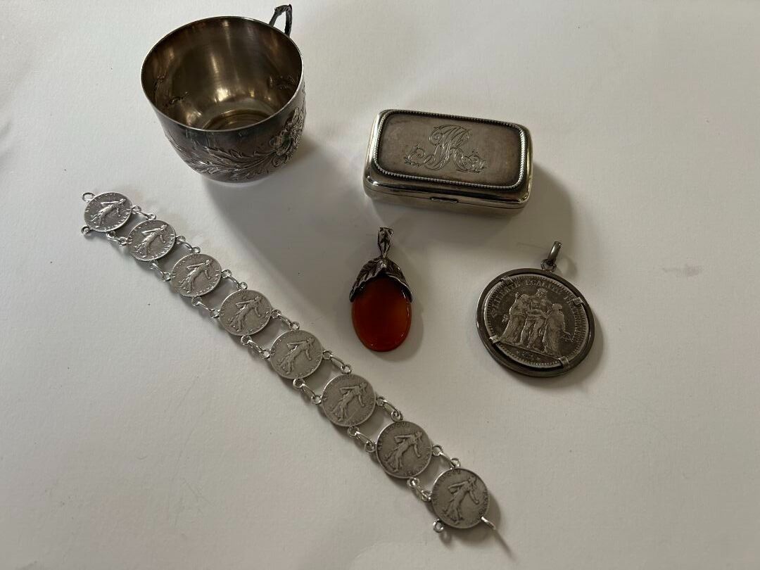 Set comprising a 925 thousandths silver mug with floral decoration, a 5 franc coin mounted as a pendant on a 925 thousandths silver frame, a silver bracelet adorned with 8 50 centime silver coins and a 925 thousandths English silver box. P. 140.99 g