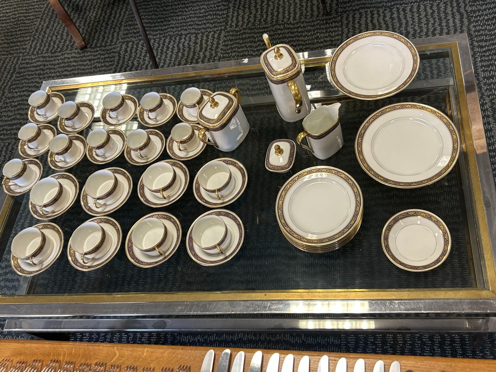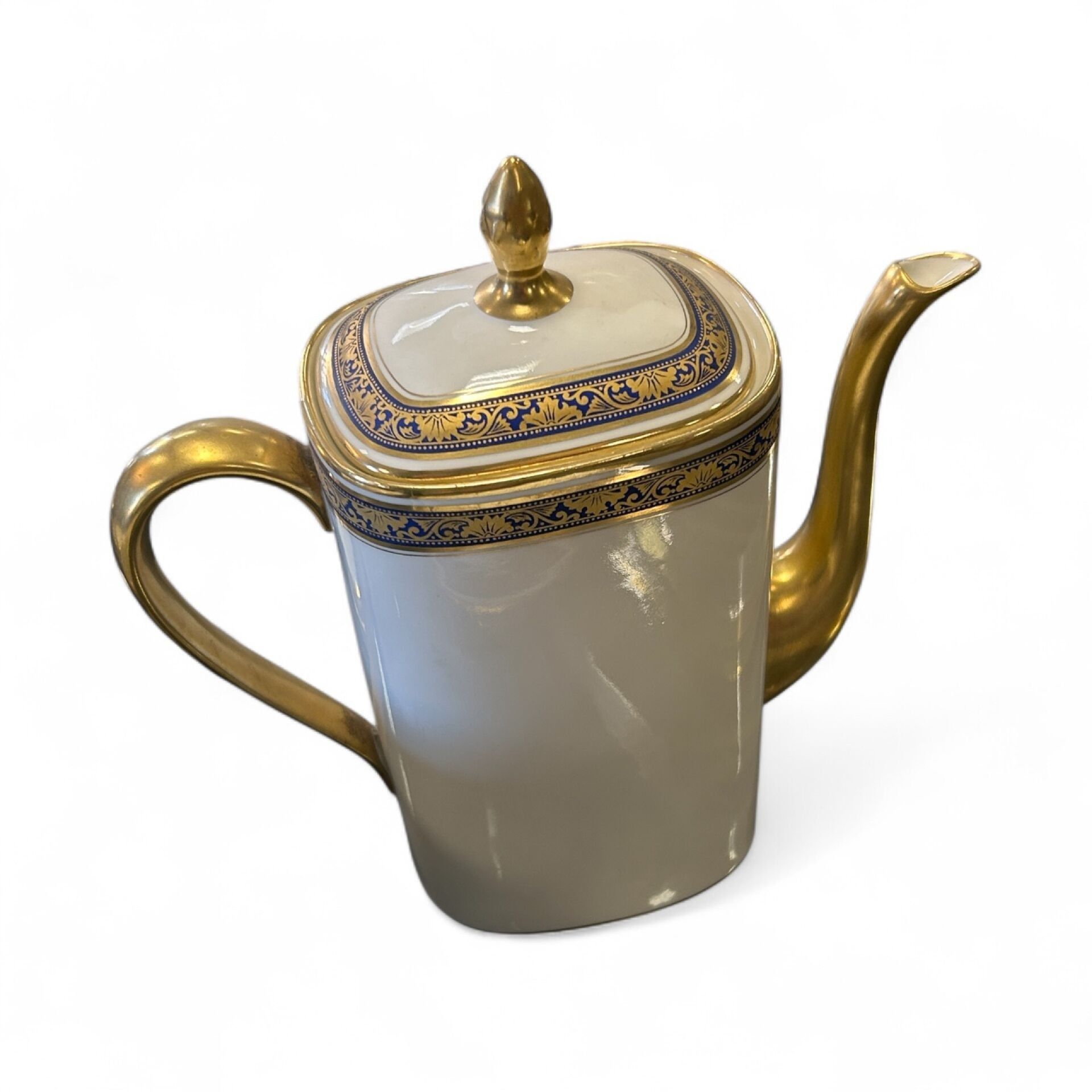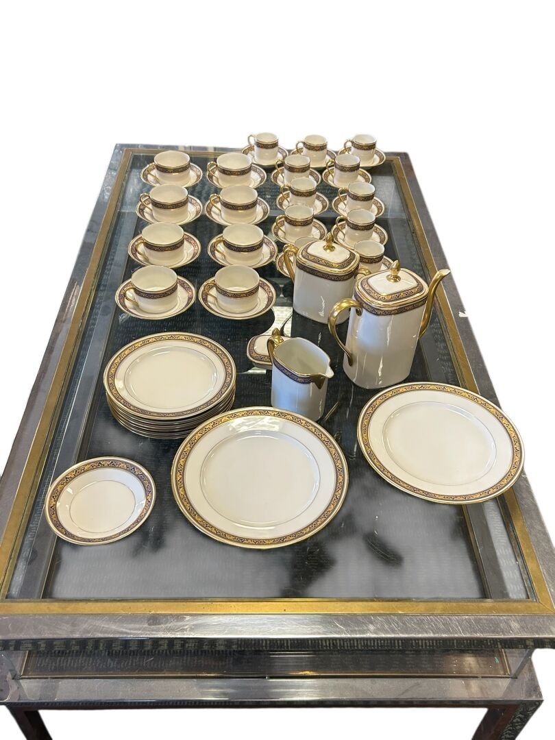 * REYNAUD in LIMOGES, white porcelain service with royal blue and gilt frieze comprising 8 tea cups and saucers, 11 coffee cups and saucers, a coffee pot, a sugar bowl, a milk jug, 6 dessert plates, 2 serving bowls on pedestal.