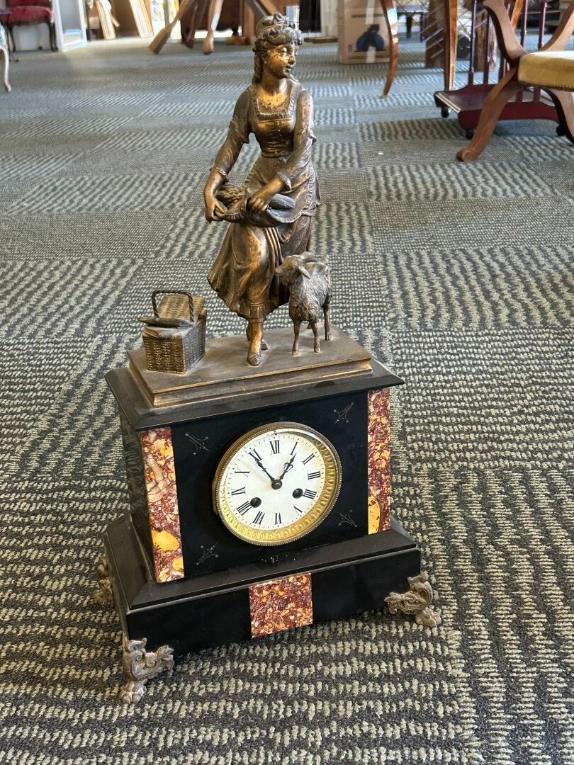 * A black and red griotte marble clock topped by a regule depicting a shepherdess and her goat. Height 53cm