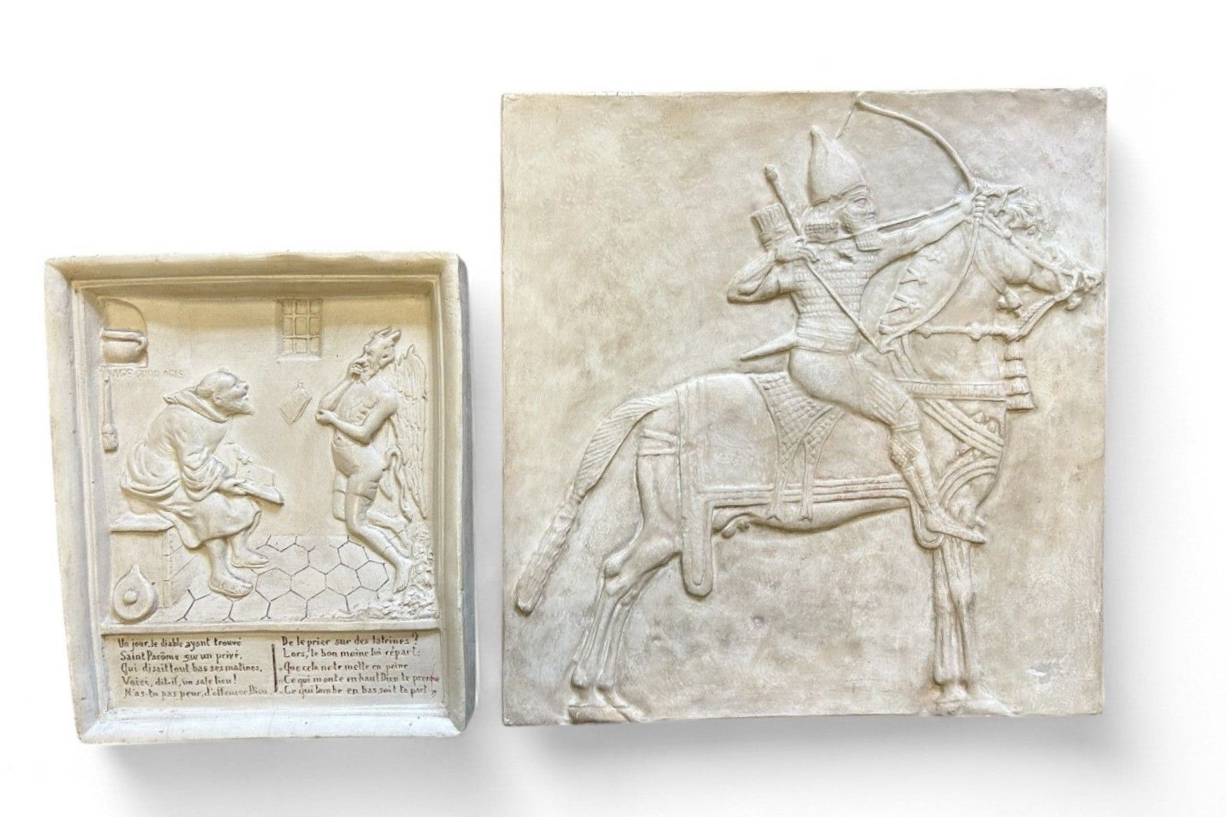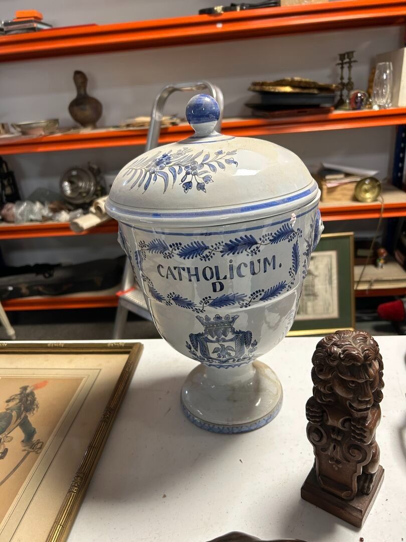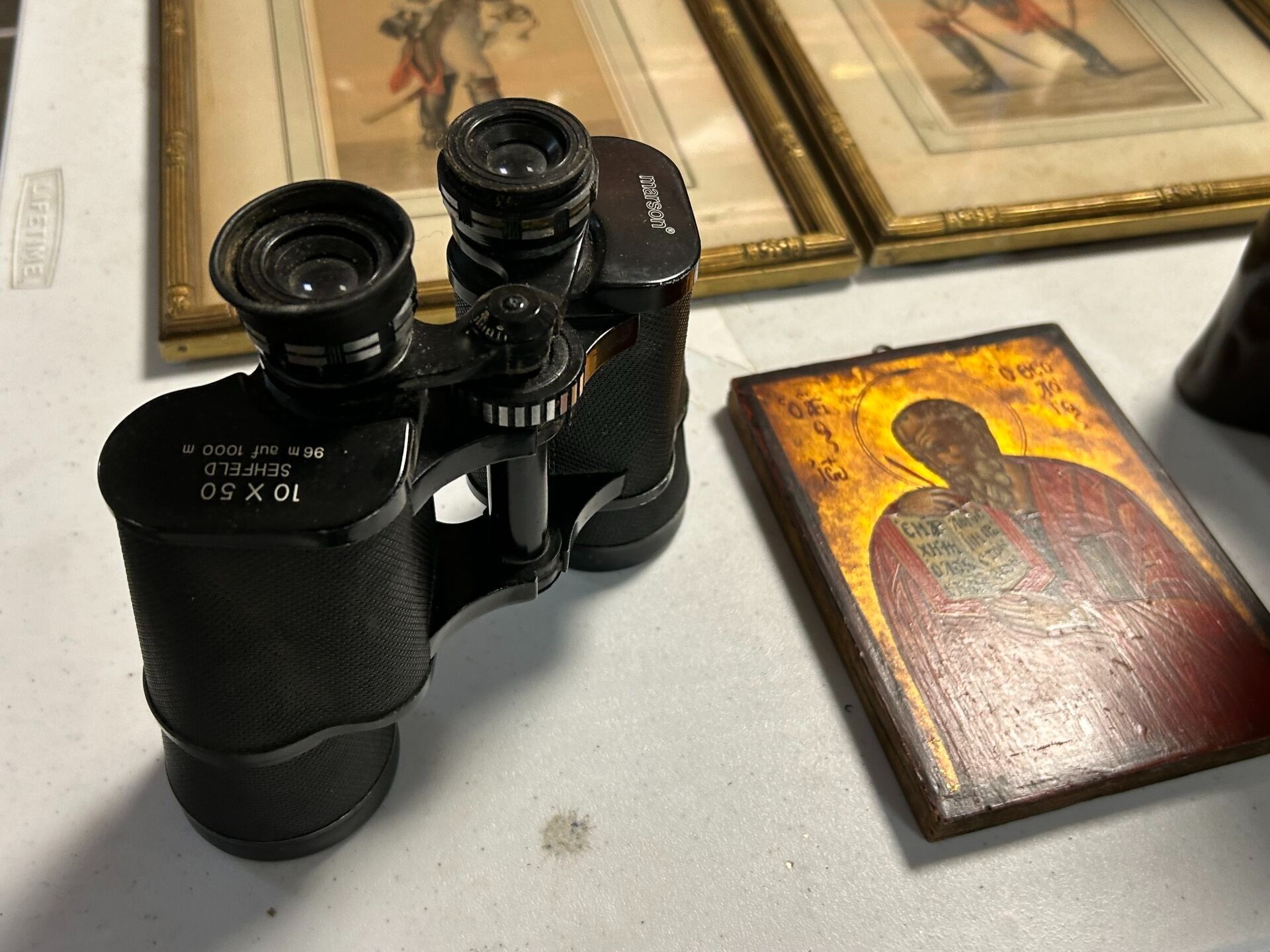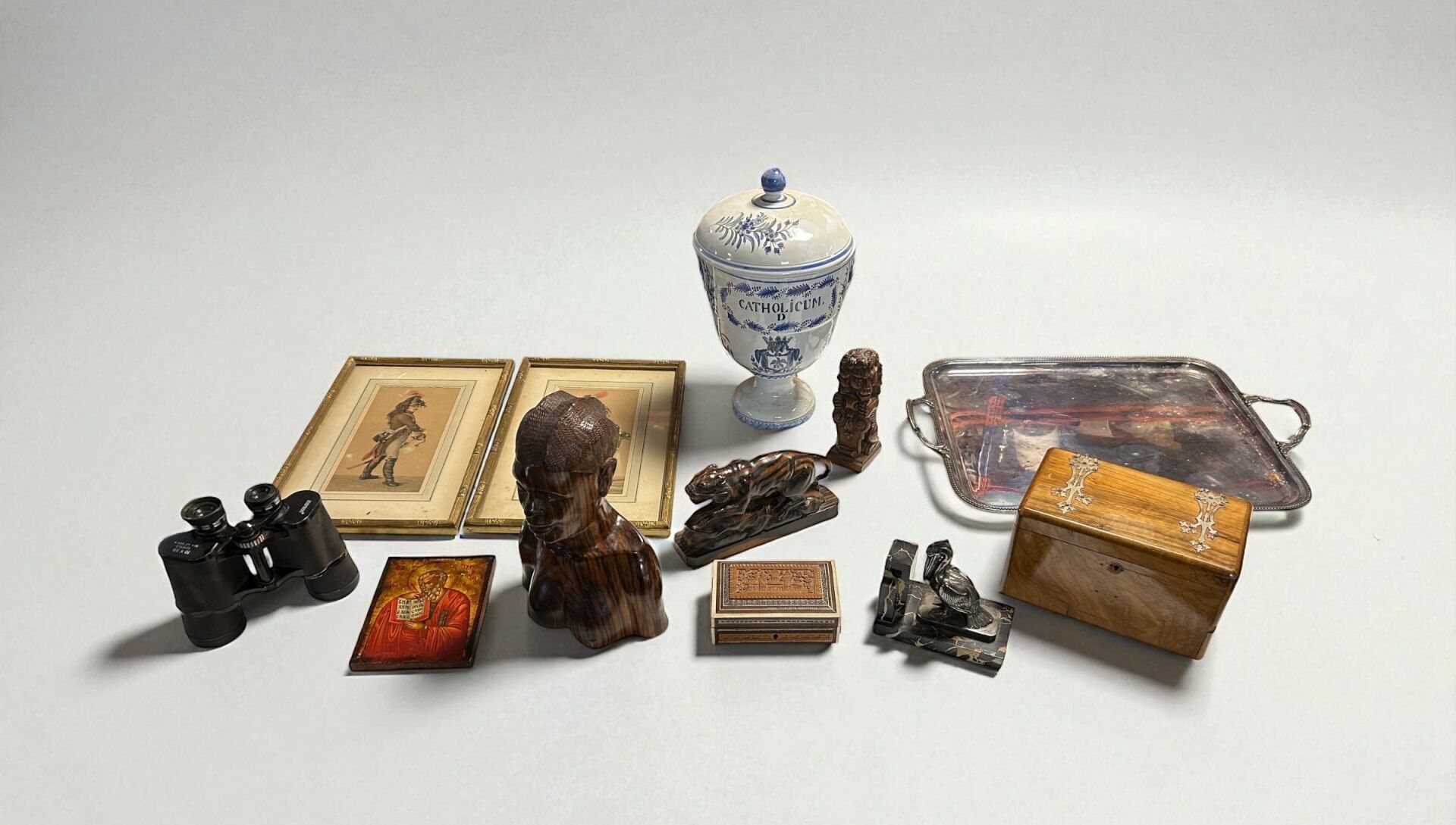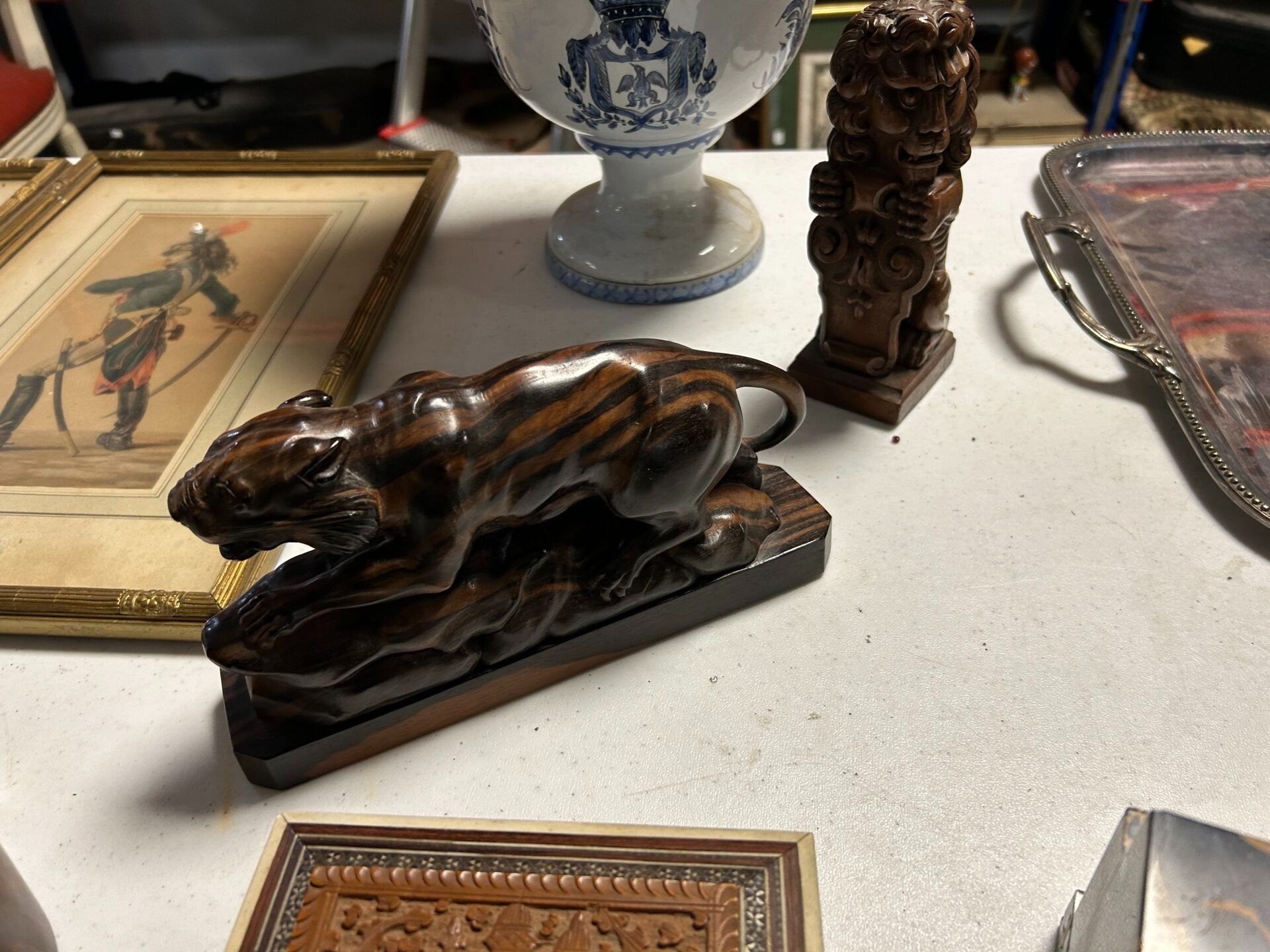 * Lot of decorative and miscellaneous items including a covered earthenware medicine jar with "CATHOLICUM" inscribed in a cartouche, two polychrome engravings depicting hussars, two plaster plates including a reproduction of the Louvre, a book-press element signed FRECOURT, a stylized bronze dolphin, a pair of binoculars branded MARSON 10 x 50, a drawing signed G.Darde sculptor, a bust of an African and a tiger in exotic wood, a modern icon, two boxes including one from the Far East, a silver-plated metal tray and a mahogany writing case.