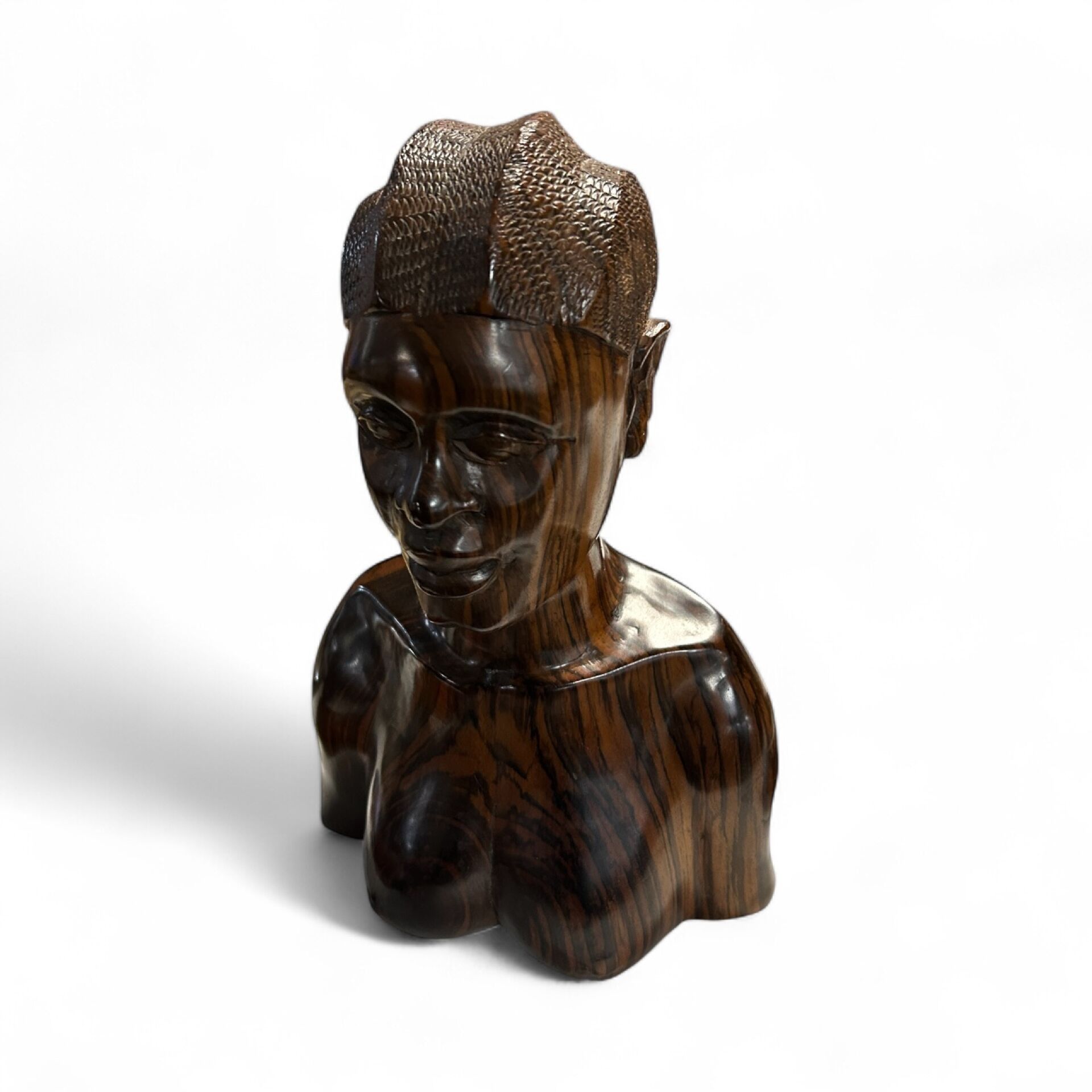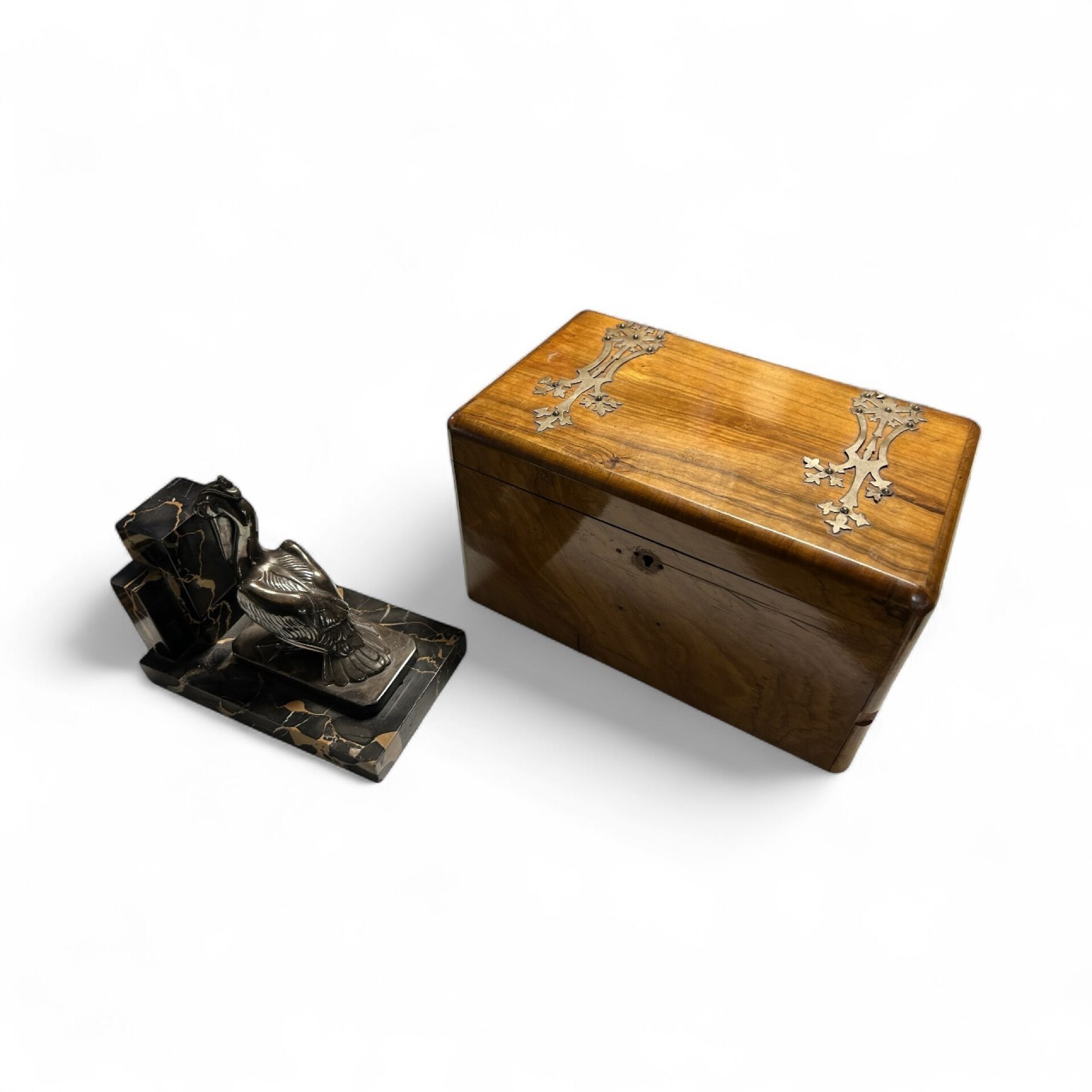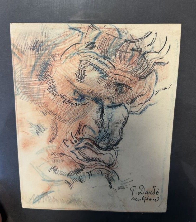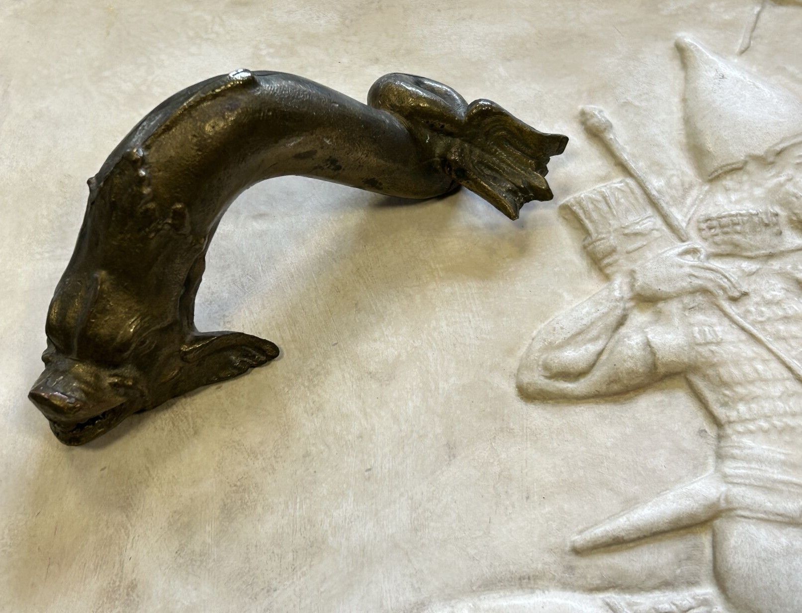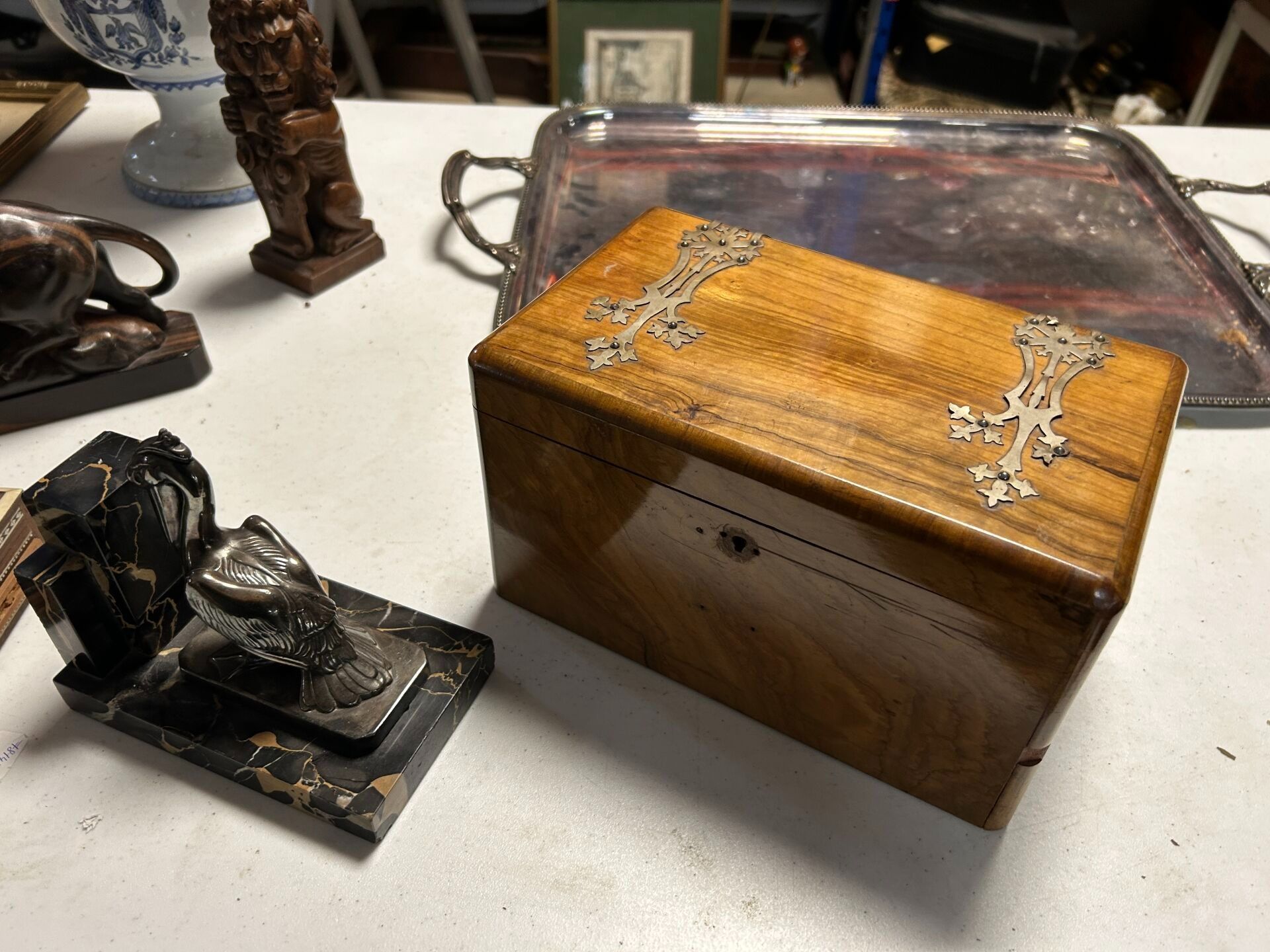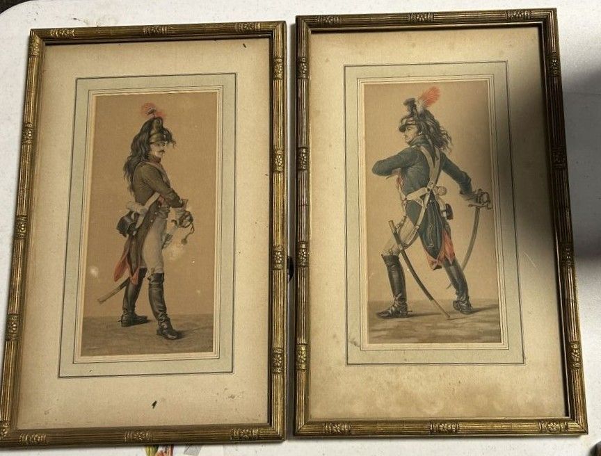 * Lot of decorative and miscellaneous items including a covered earthenware medicine jar with "CATHOLICUM" inscribed in a cartouche, two polychrome engravings depicting hussars, two plaster plates including a reproduction of the Louvre, a book-press element signed FRECOURT, a stylized bronze dolphin, a pair of binoculars branded MARSON 10 x 50, a drawing signed G.Darde sculptor, a bust of an African and a tiger in exotic wood, a modern icon, two boxes including one from the Far East, a silver-plated metal tray and a mahogany writing case.