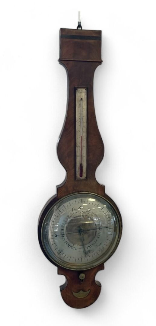* Barometer Mercury thermometer in flame mahogany veneer by Bunton Duai Pelletier in Paris, Restoration period. H. 100 cm (mercury tube intact)
