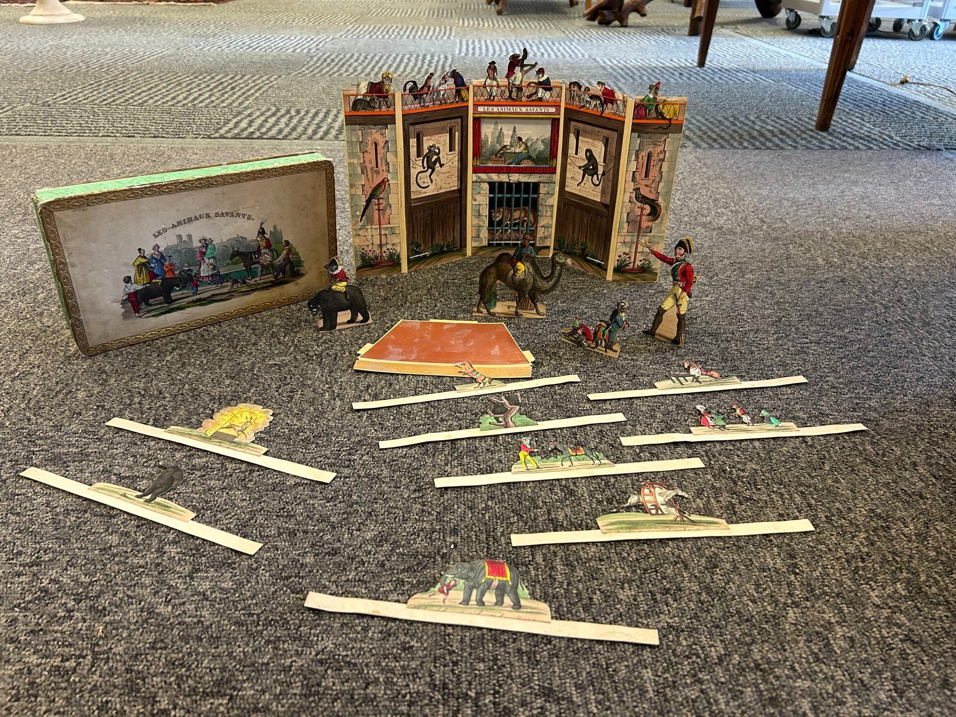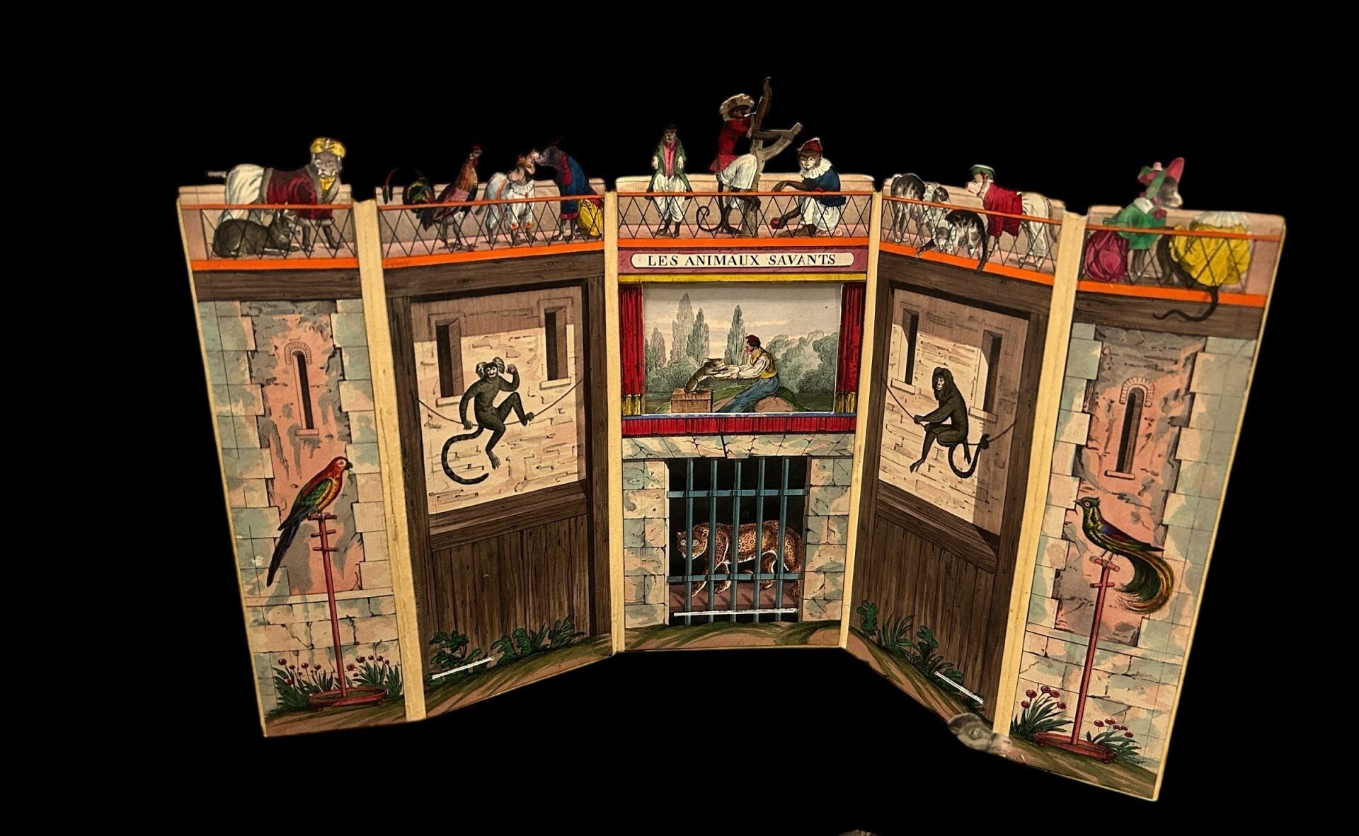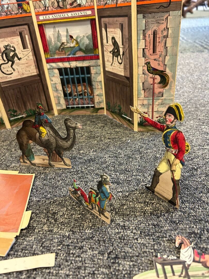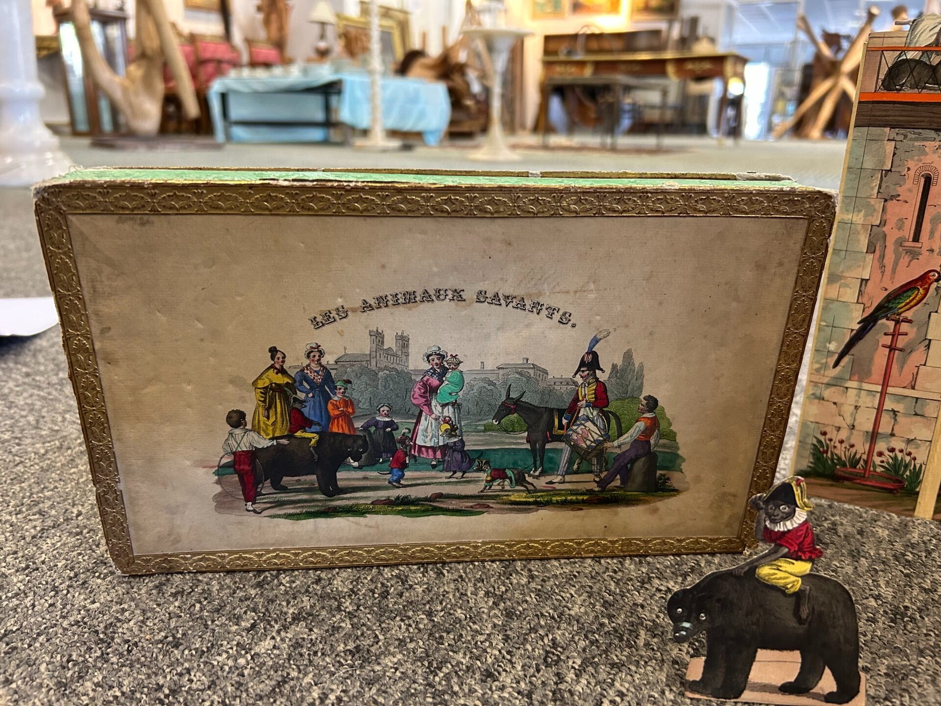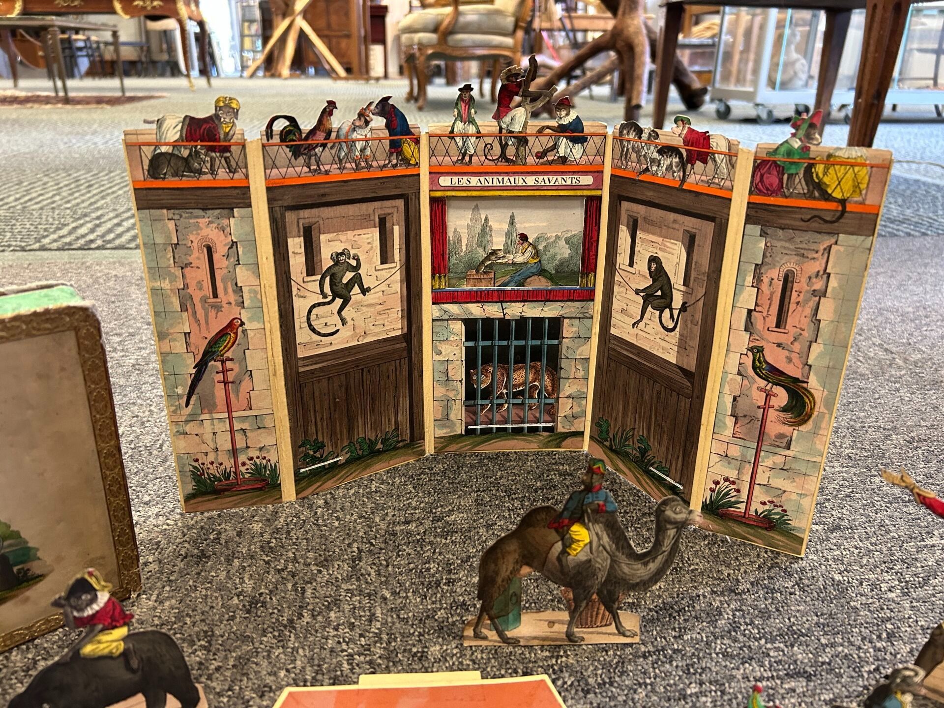 Antique toy - Les animaux savants, Polychrome cut-out picture theatre in the style of Epinal imagery, some paper figures with slides. Height of the theatre. 27 cm Length. 43 cm