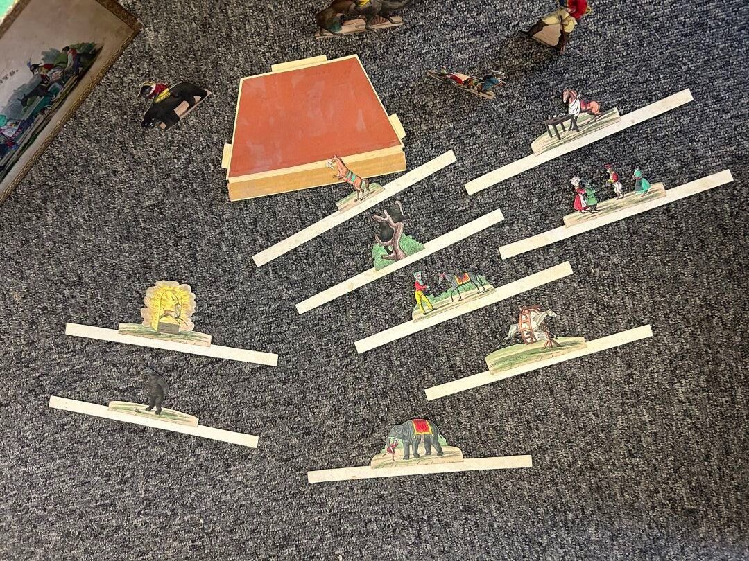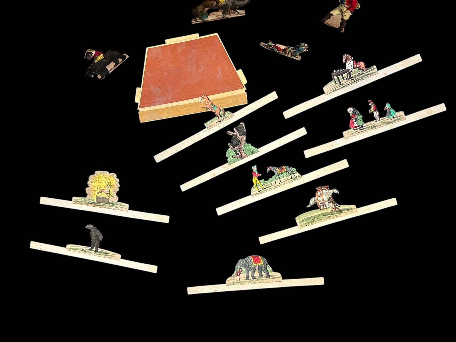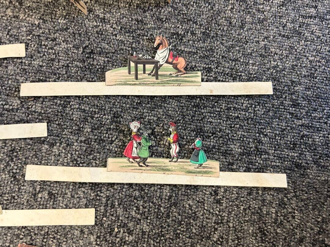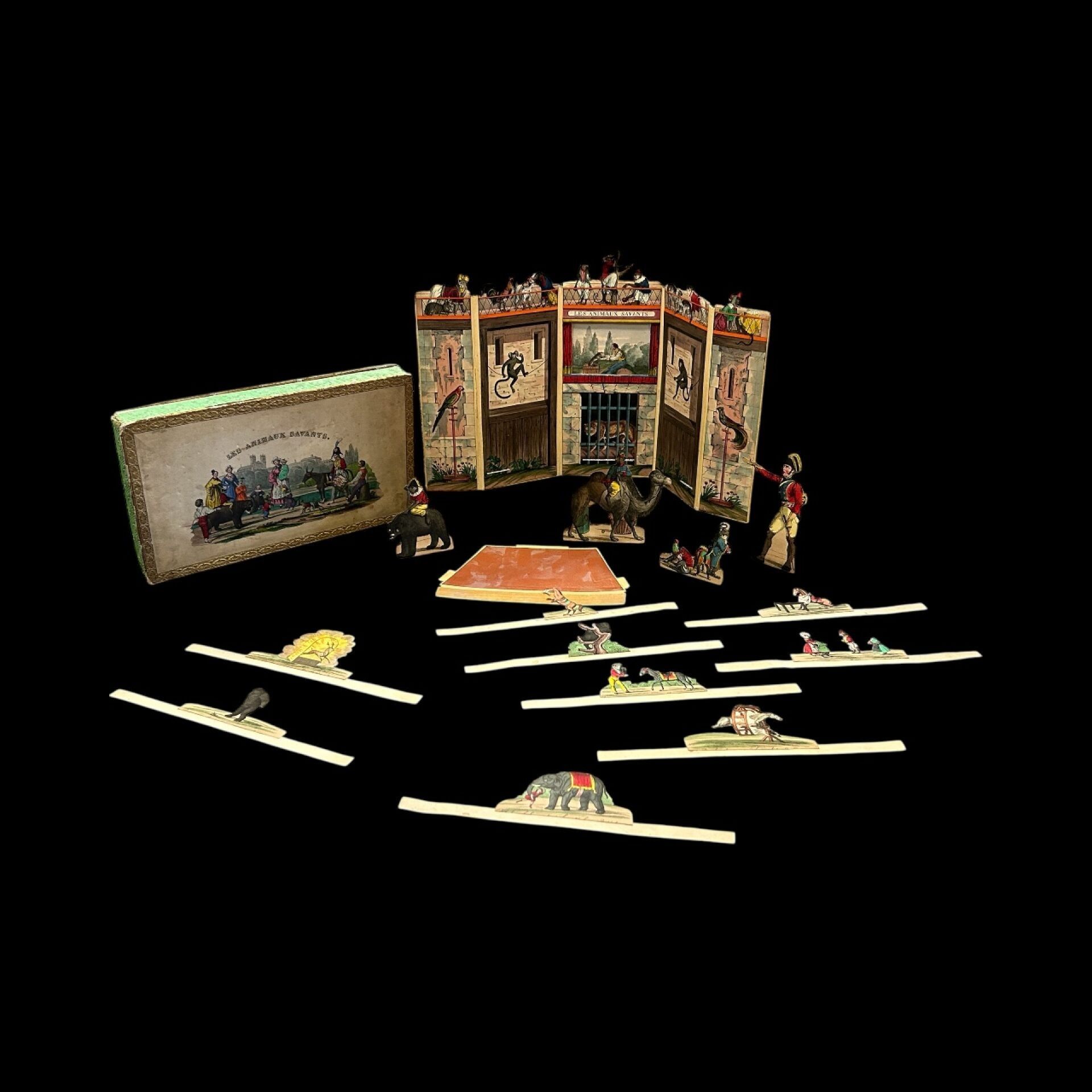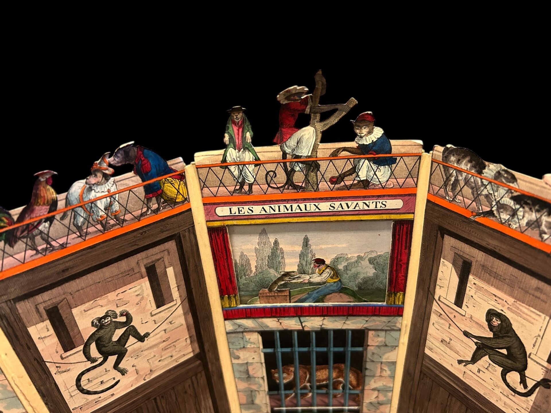 Antique toy - Les animaux savants, Polychrome cut-out picture theatre in the style of Epinal imagery, some paper figures with slides. Height of the theatre. 27 cm Length. 43 cm