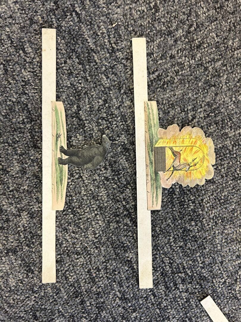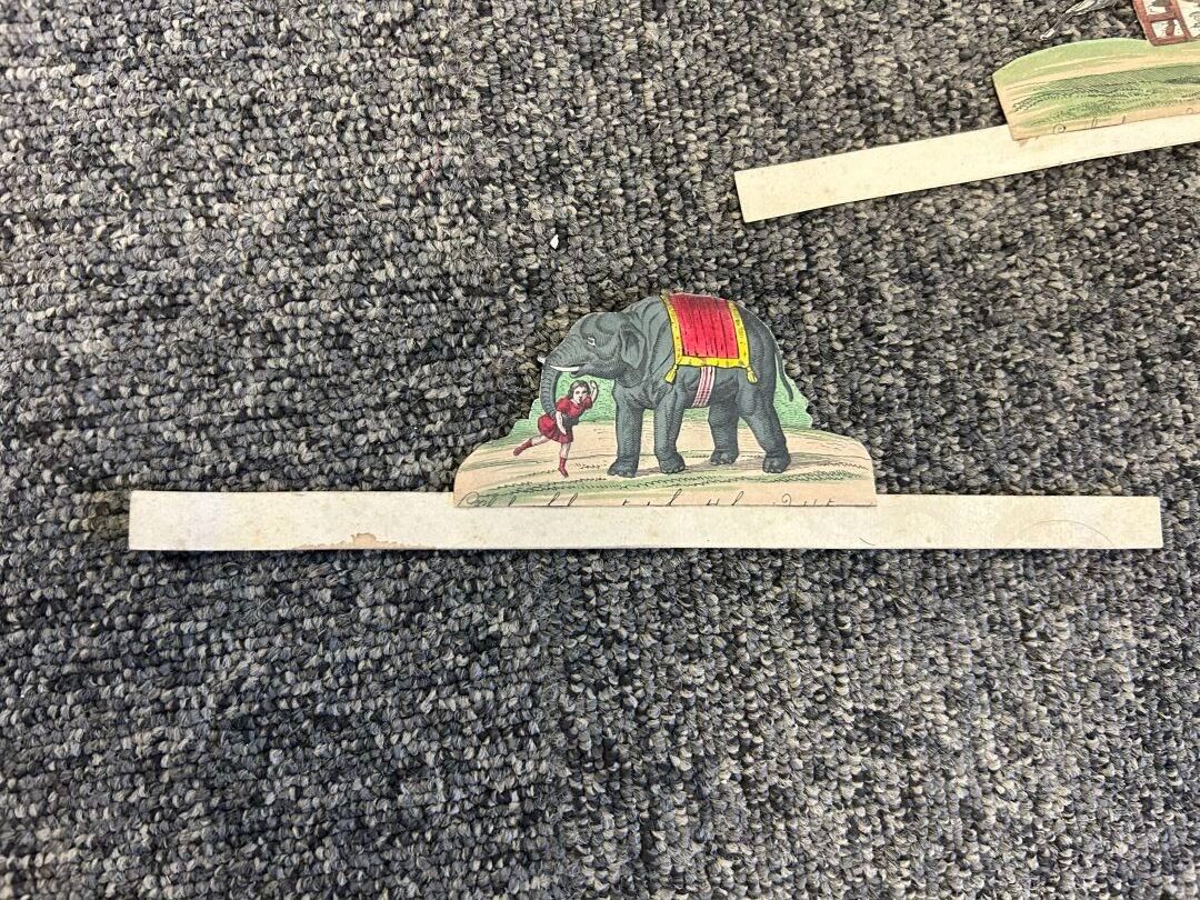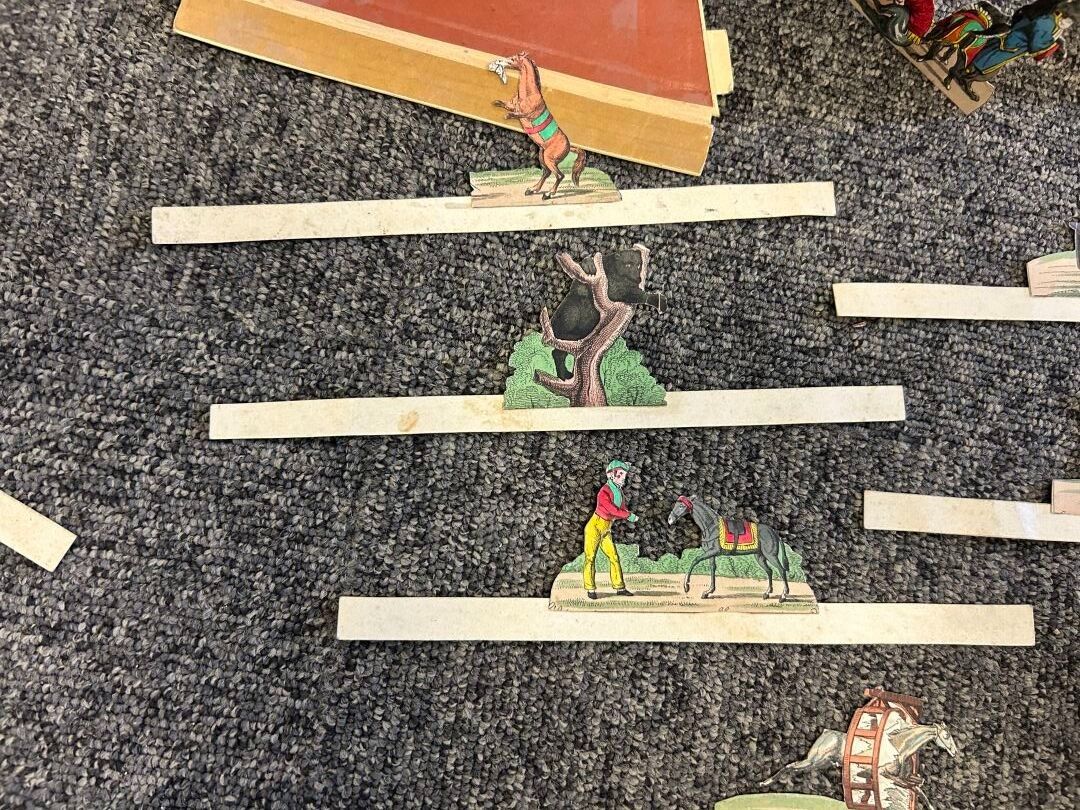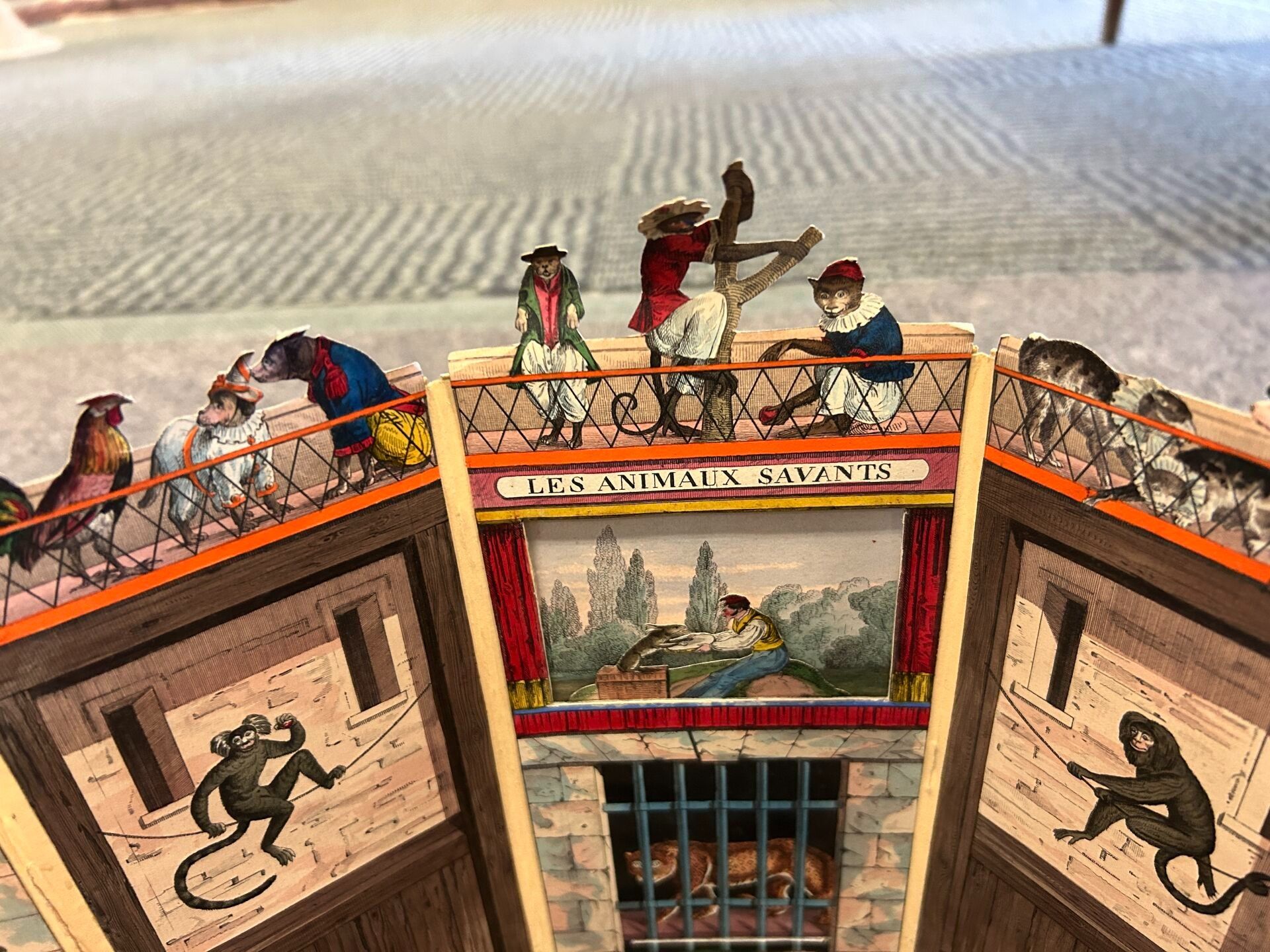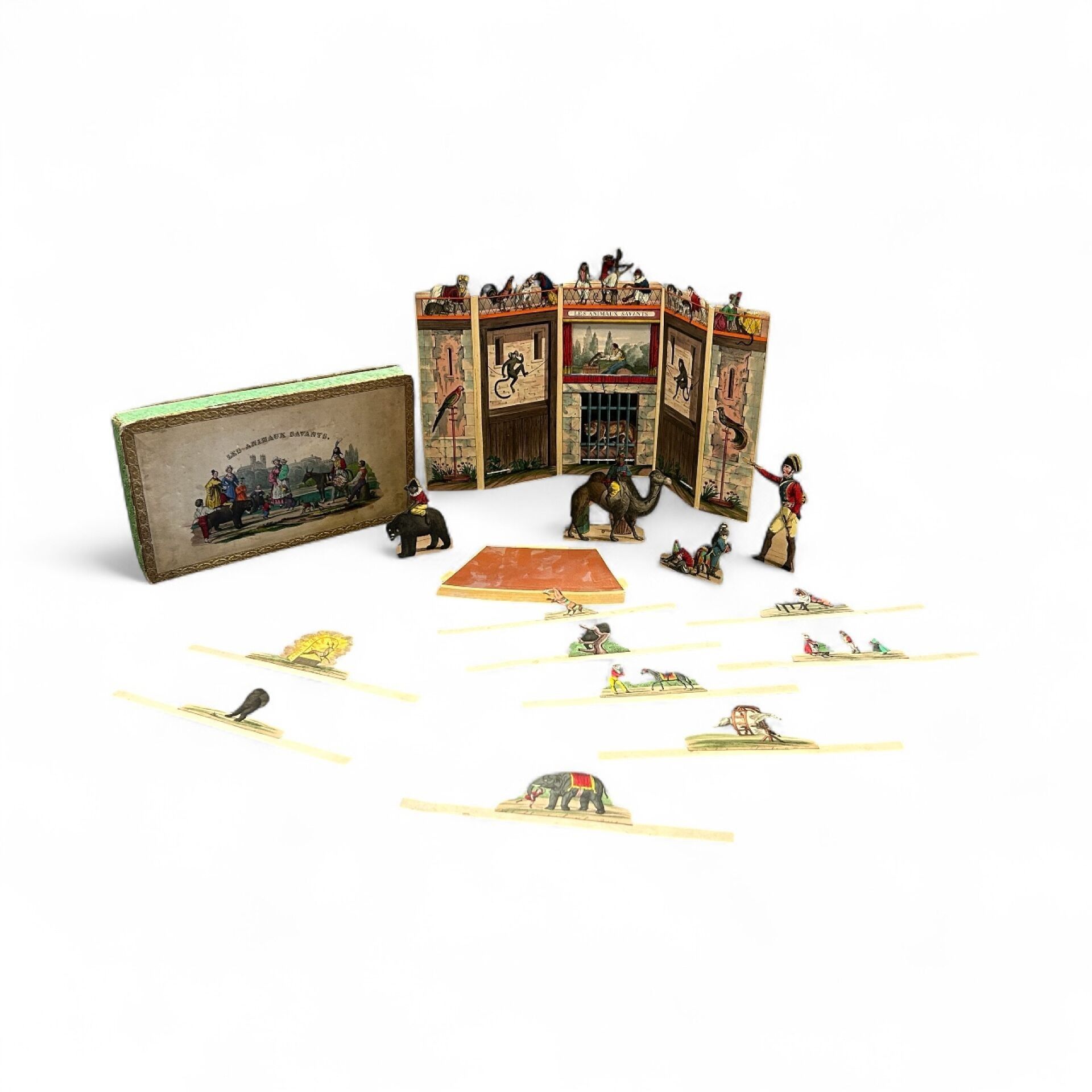 Antique toy - Les animaux savants, Polychrome cut-out picture theatre in the style of Epinal imagery, some paper figures with slides. Height of the theatre. 27 cm Length. 43 cm