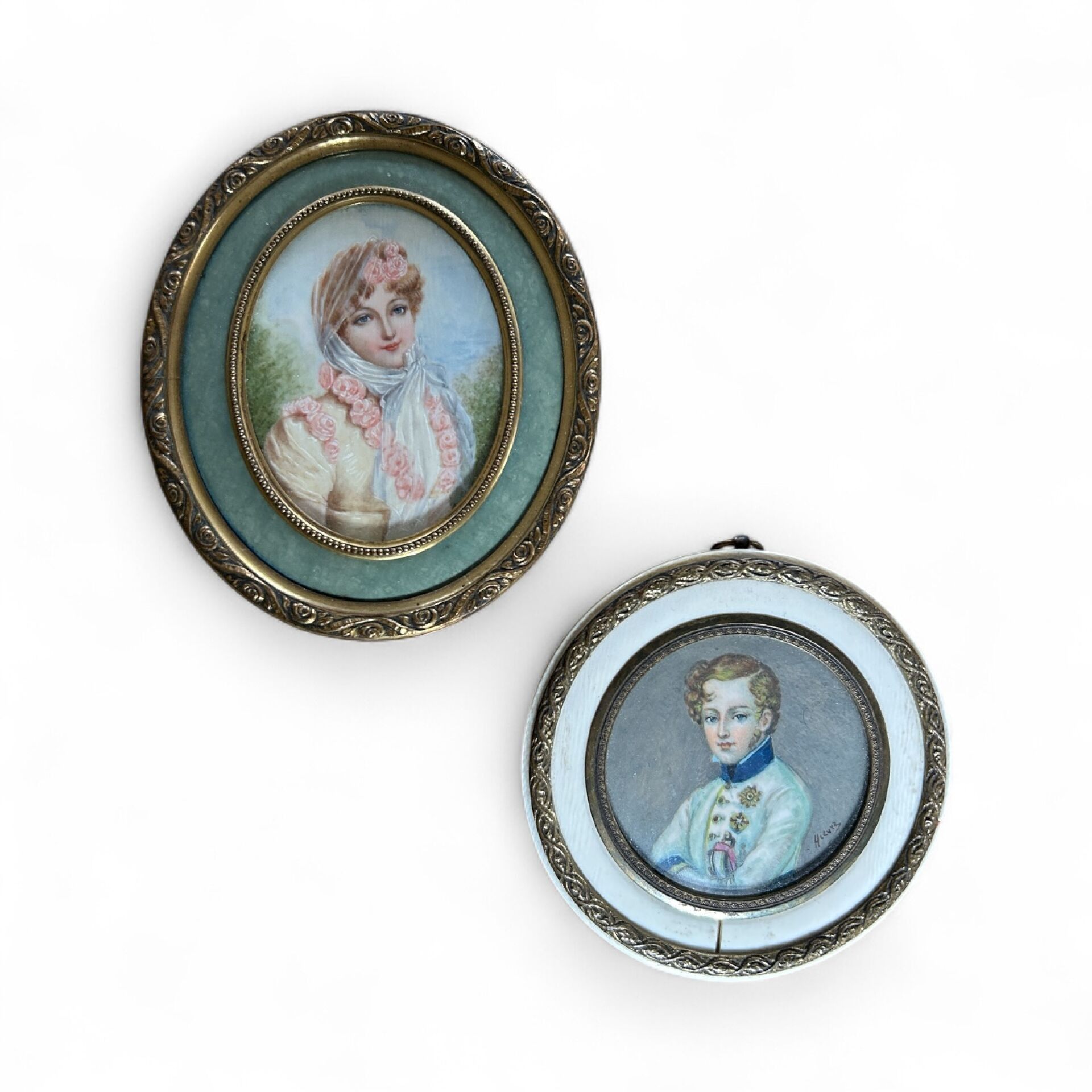Miniature depicting the Aiglon, framed in brass and bakelite, Late 19th century. D. 5.5 cm on view A portrait of the Duchess of Alba, framed in brass, circa 1930. D. 7 x 5 cm on view