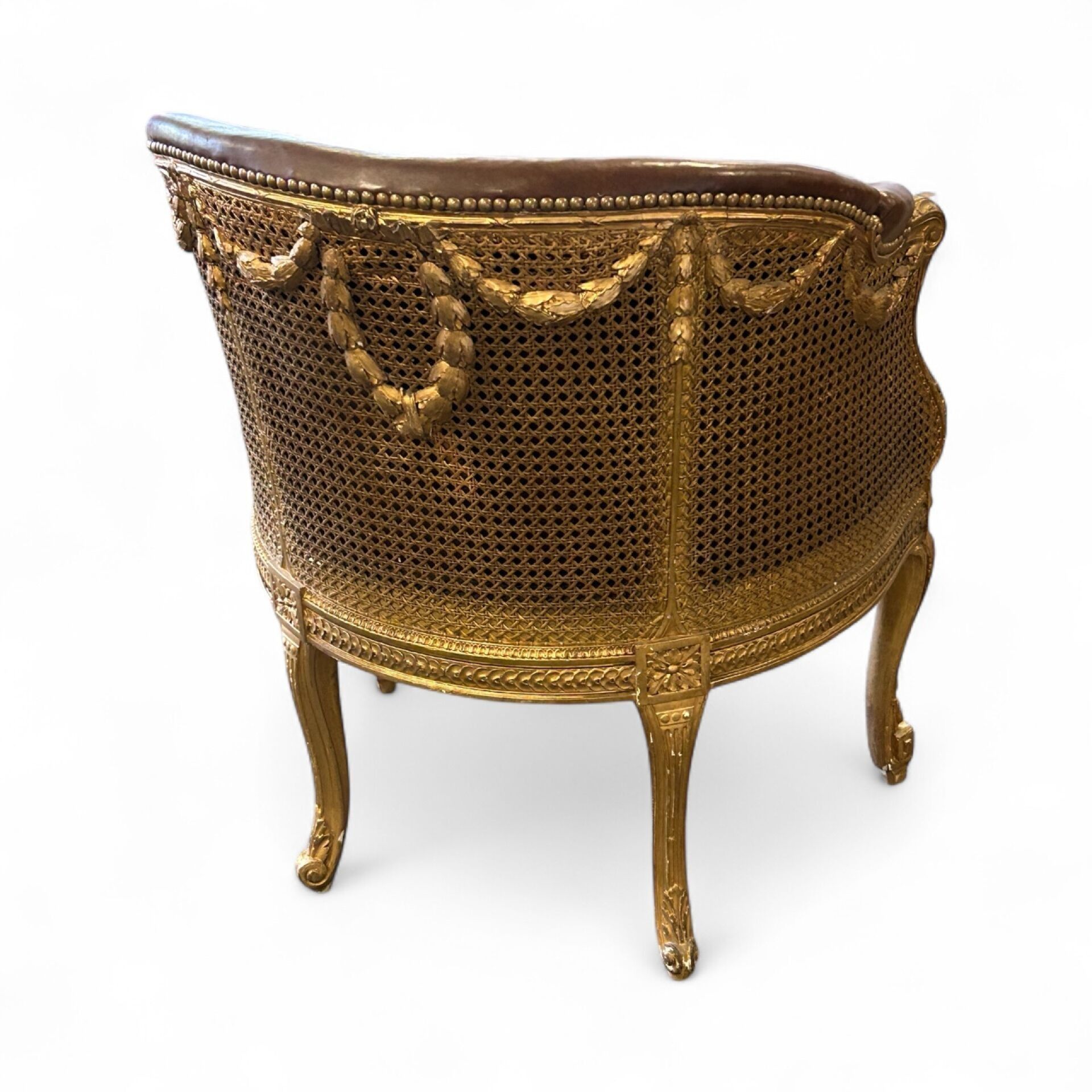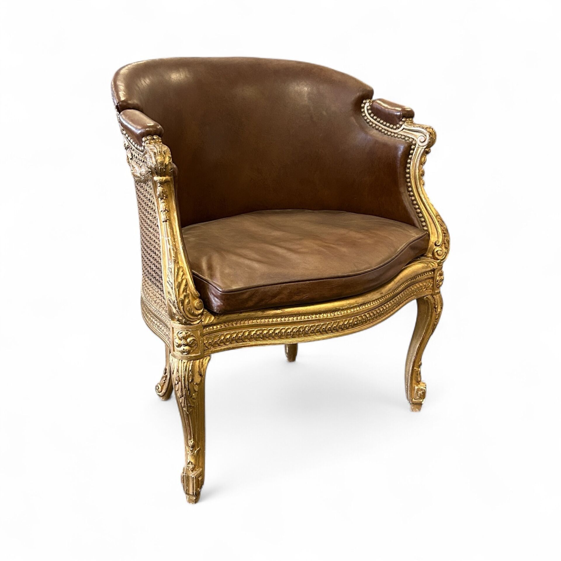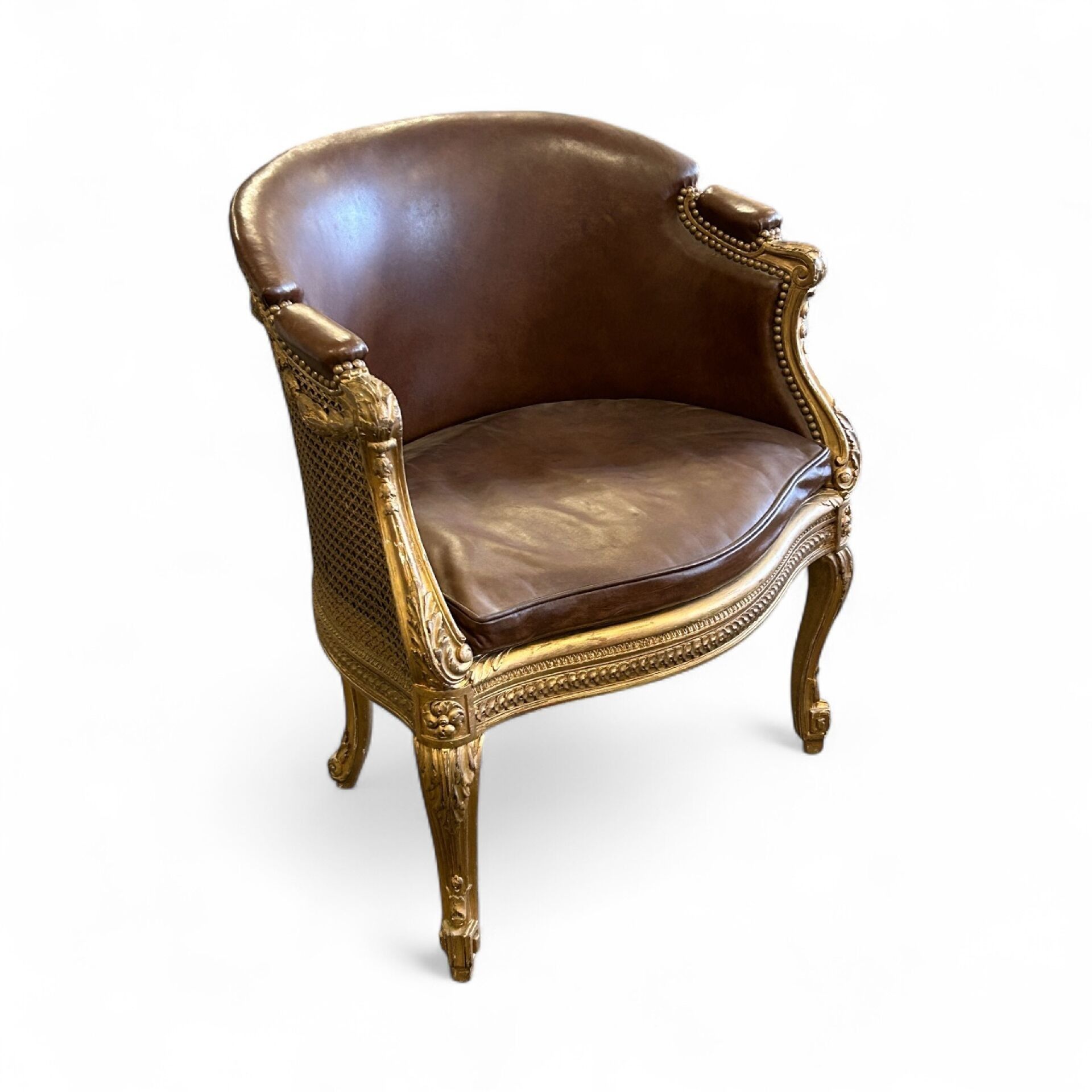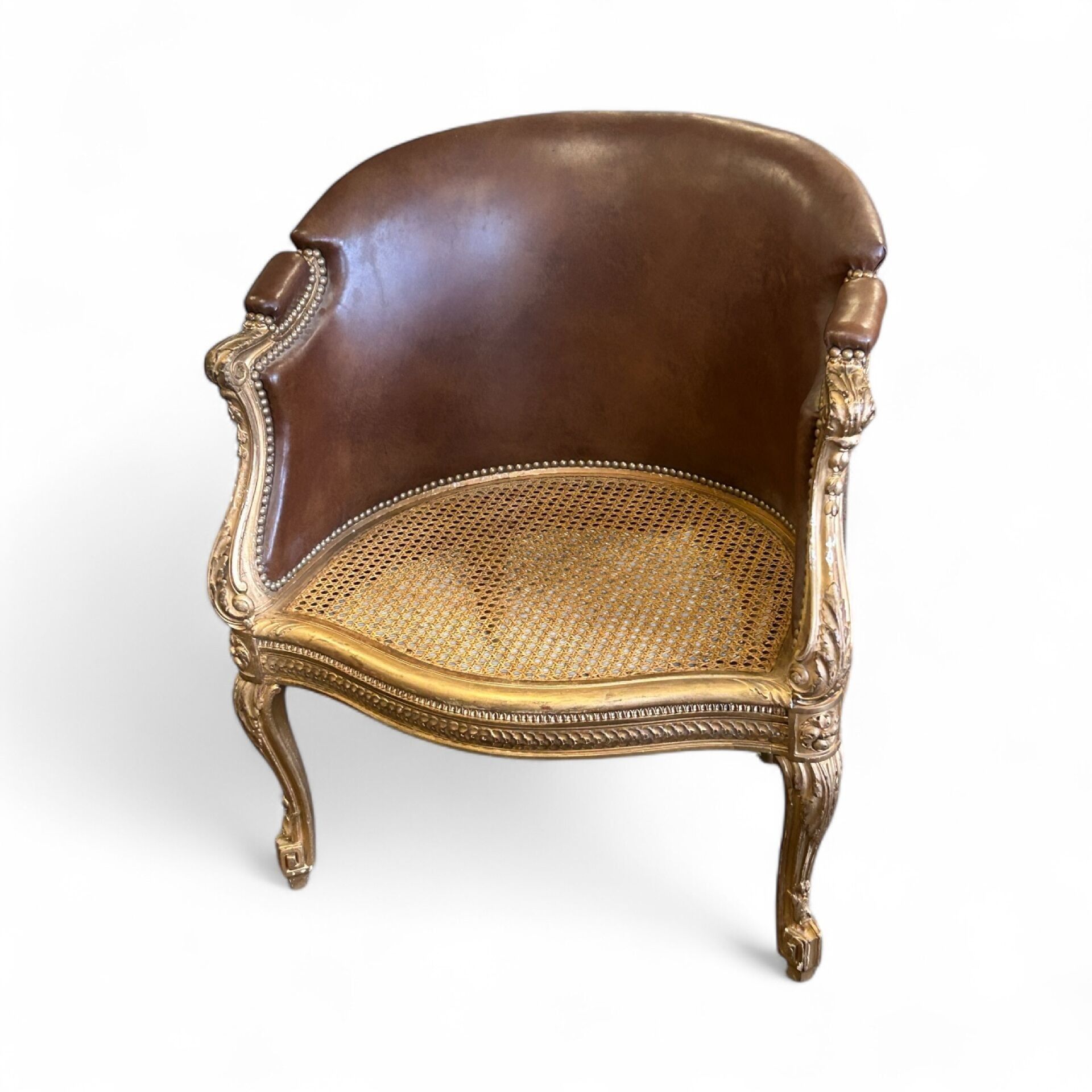 Carved and gilt wood (repainted) Bergère with caned back and seat and imitation leather upholstery, Transition style, Work circa 1900. Height 78 cm Width 66 cm