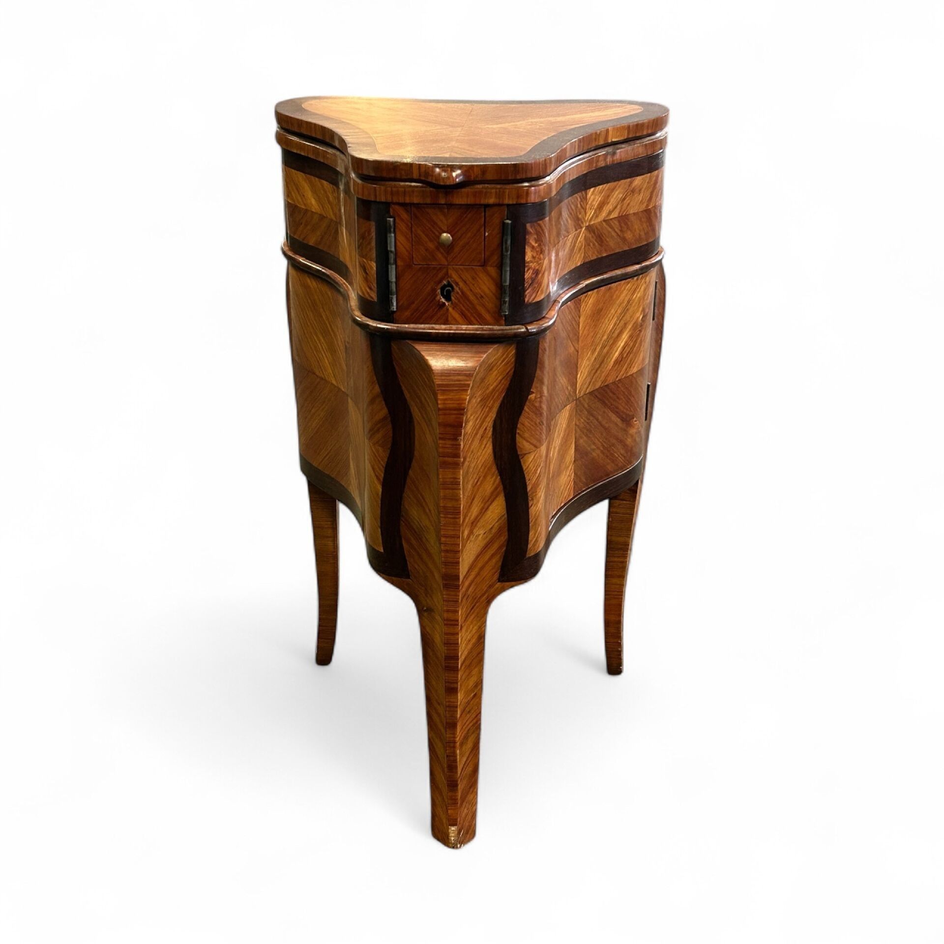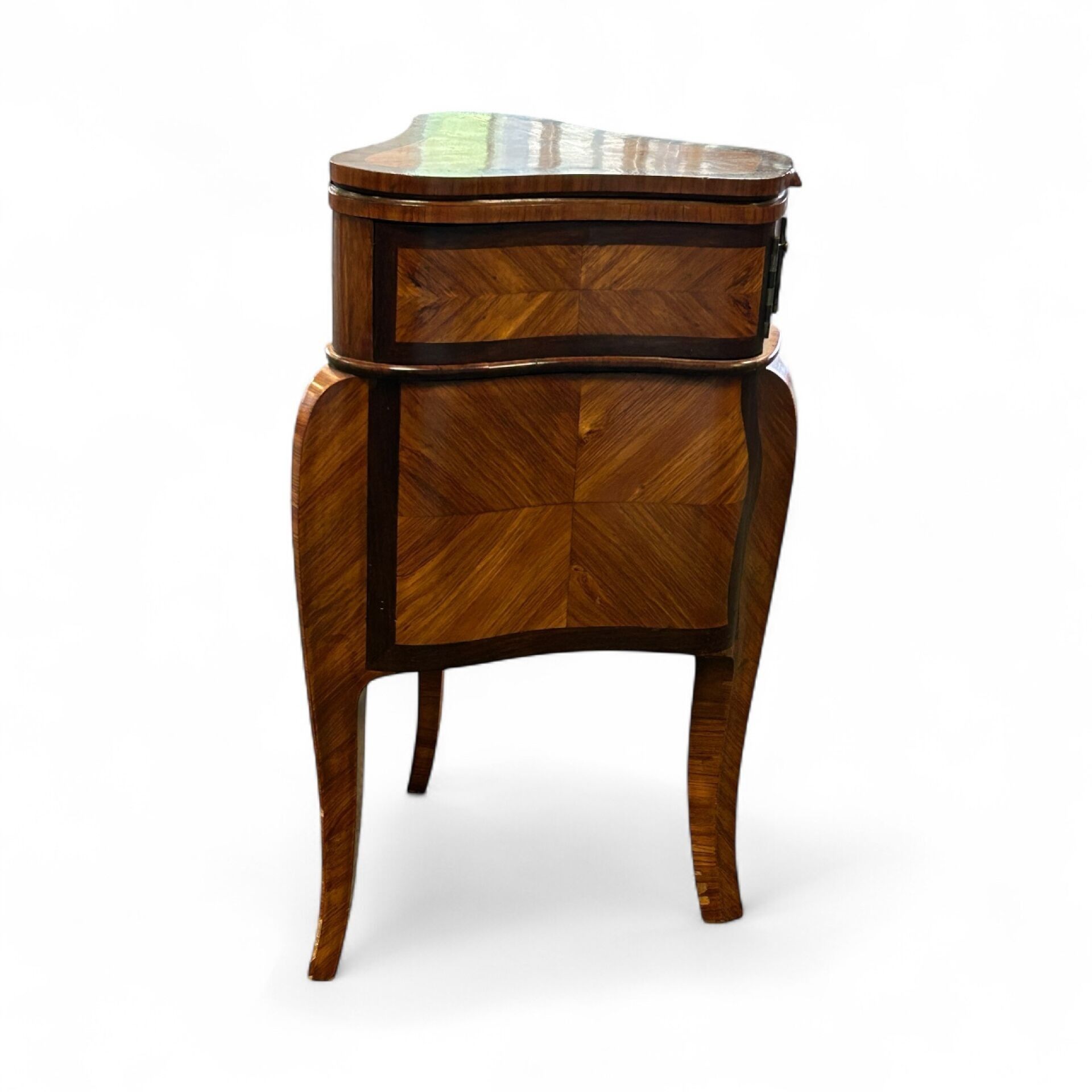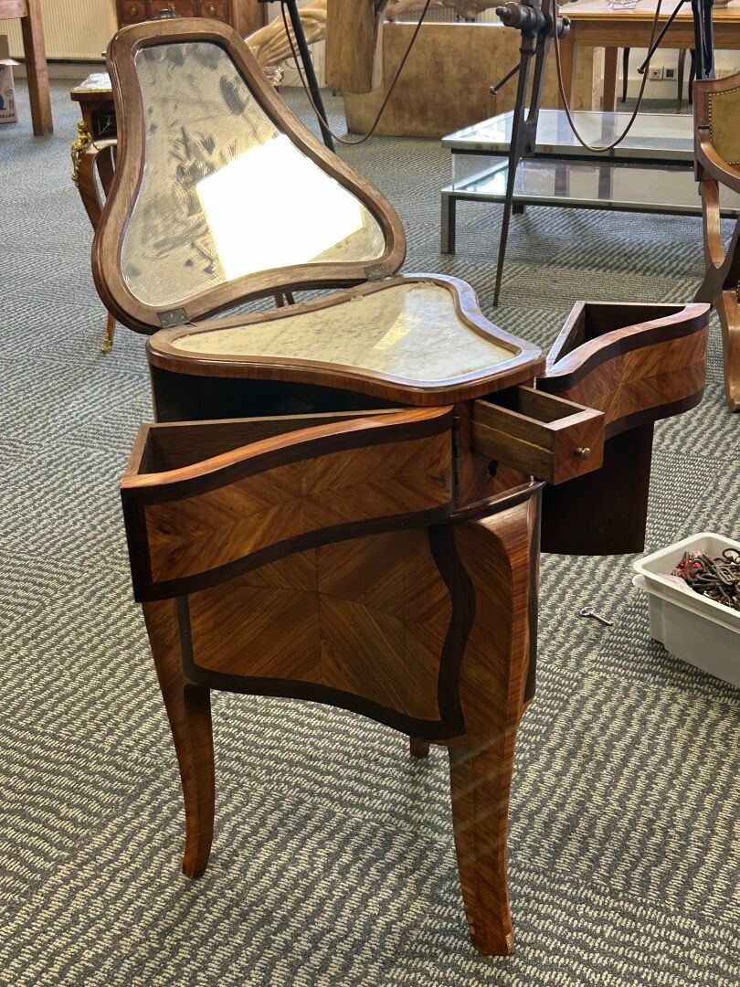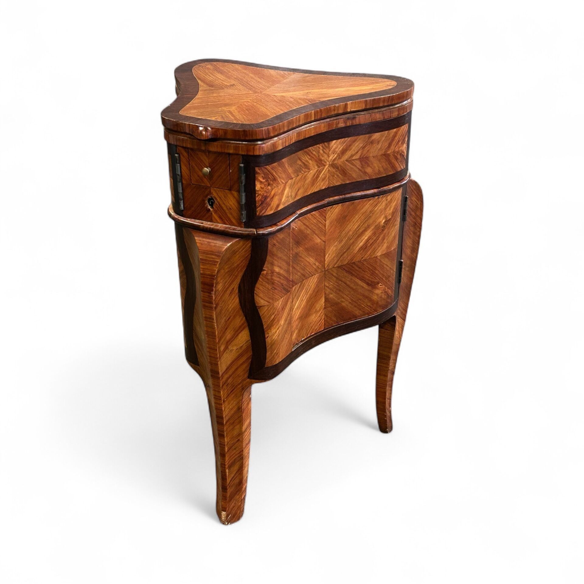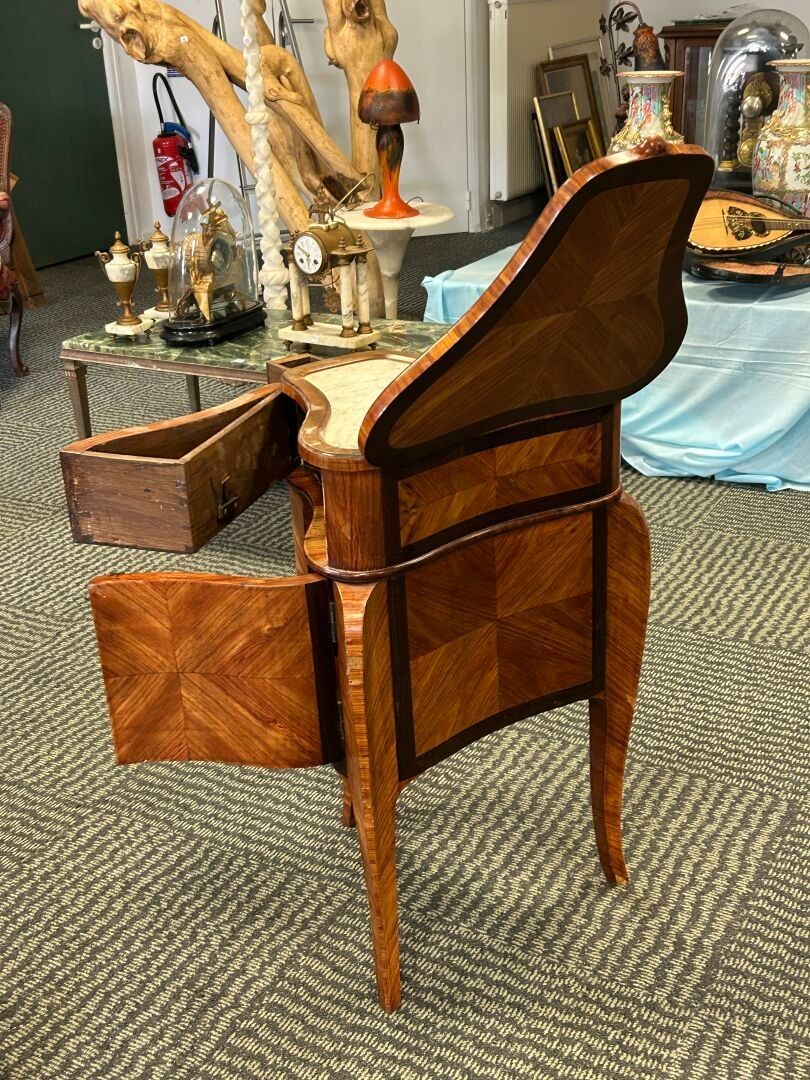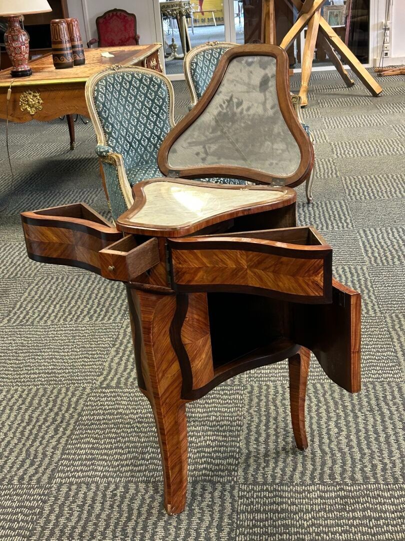 Heart-shaped dressing table in rosewood and violet veneer, opening at the waist of the drawer and two side flaps and a flap at the bottom right by engaging the lock (system to be revised, no key), top opening to reveal a mirror on the reverse and a grey veined white marble top, Work from the late 18th or early 19th century. Dimensions when closed. 77 x 48 x 47 cm (some damage to the veneer, system in need of revision)