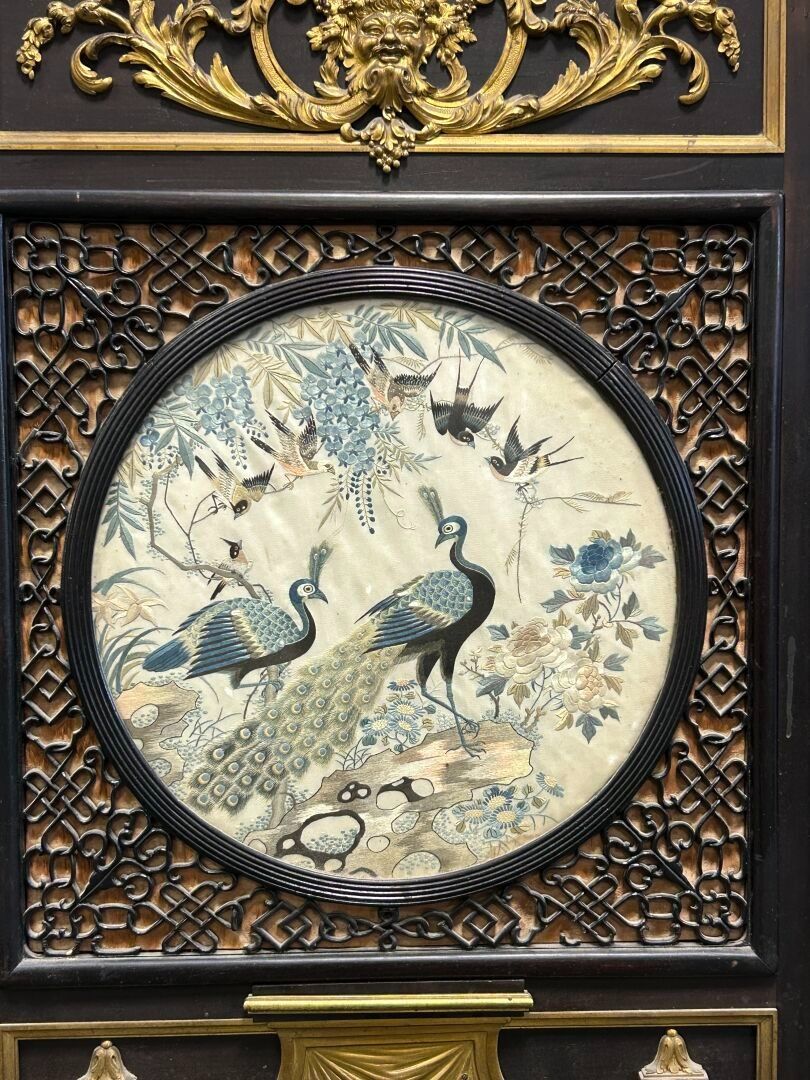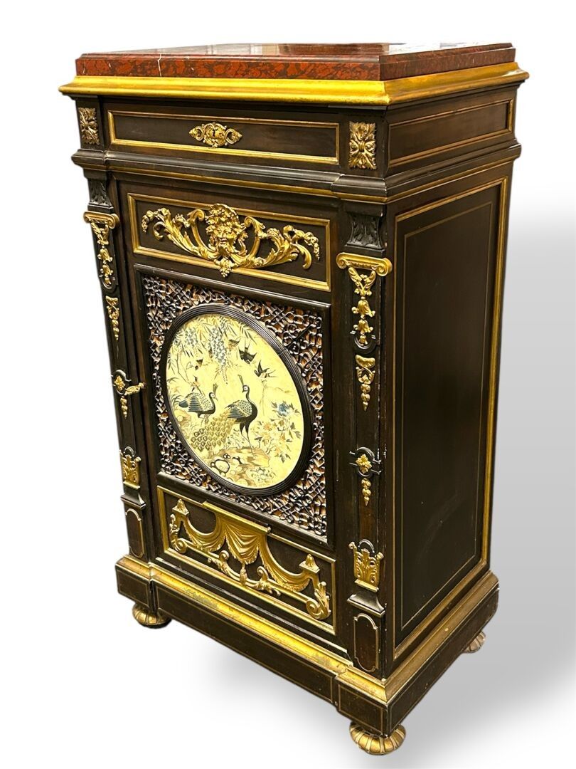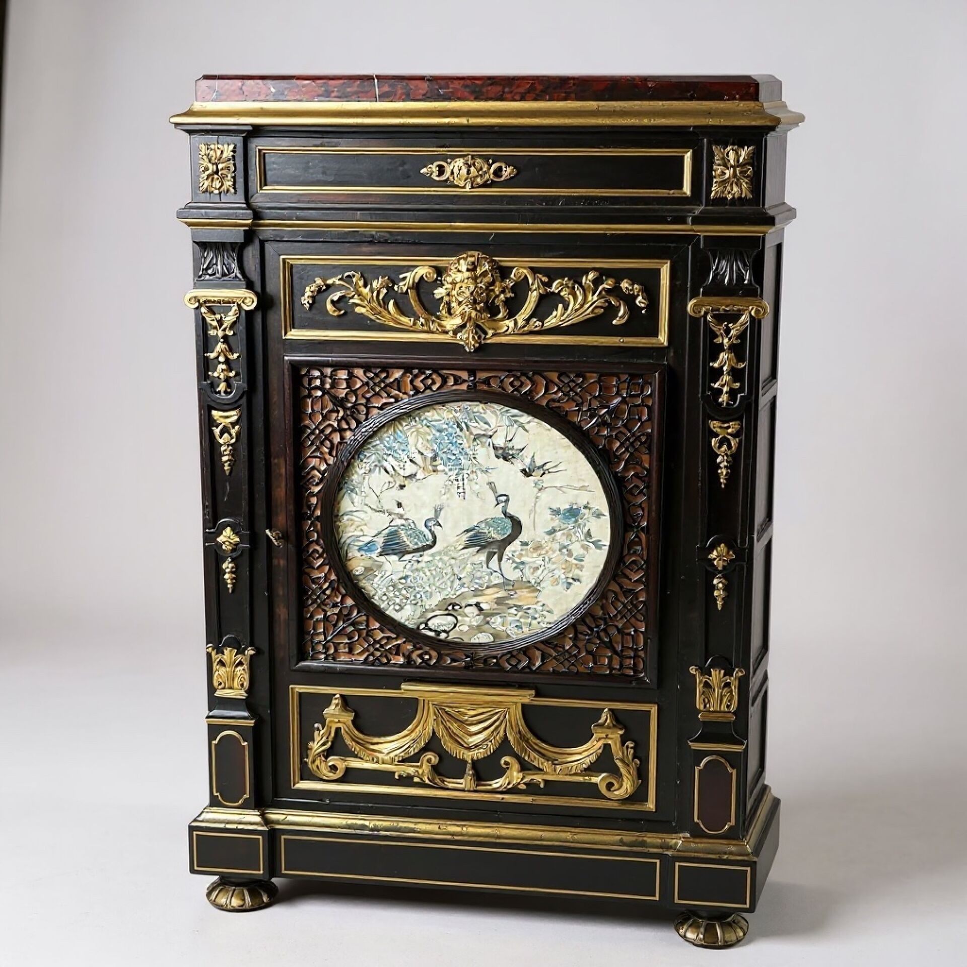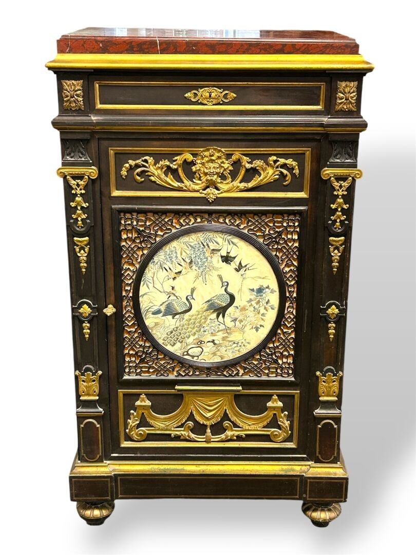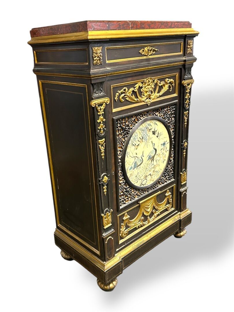 Blackened wood sideboard opening to a drawer and a door with a Japanese décor embellished with a circular silk medallion embroidered with birds, flowers and foliage. Rich ormolu and brass fillet ornamentation. Griotte red marble top. Napoleon III period. H. 77 cm W. 65 D. 40 cm (missing brass fillet on the left side)