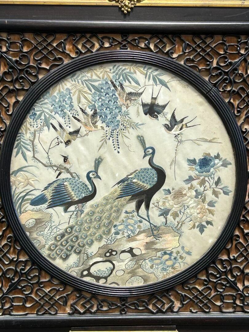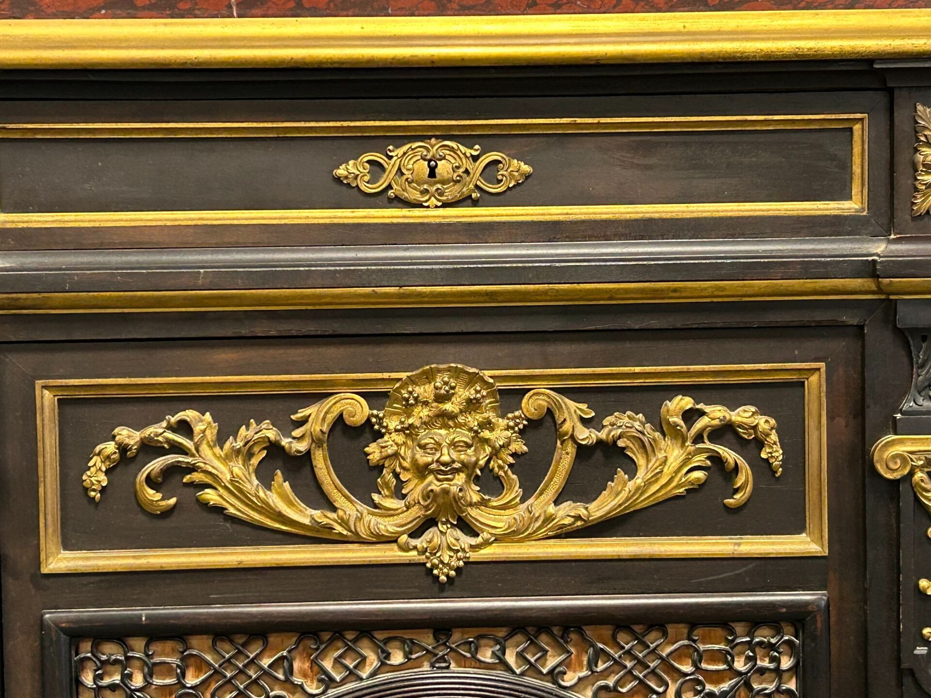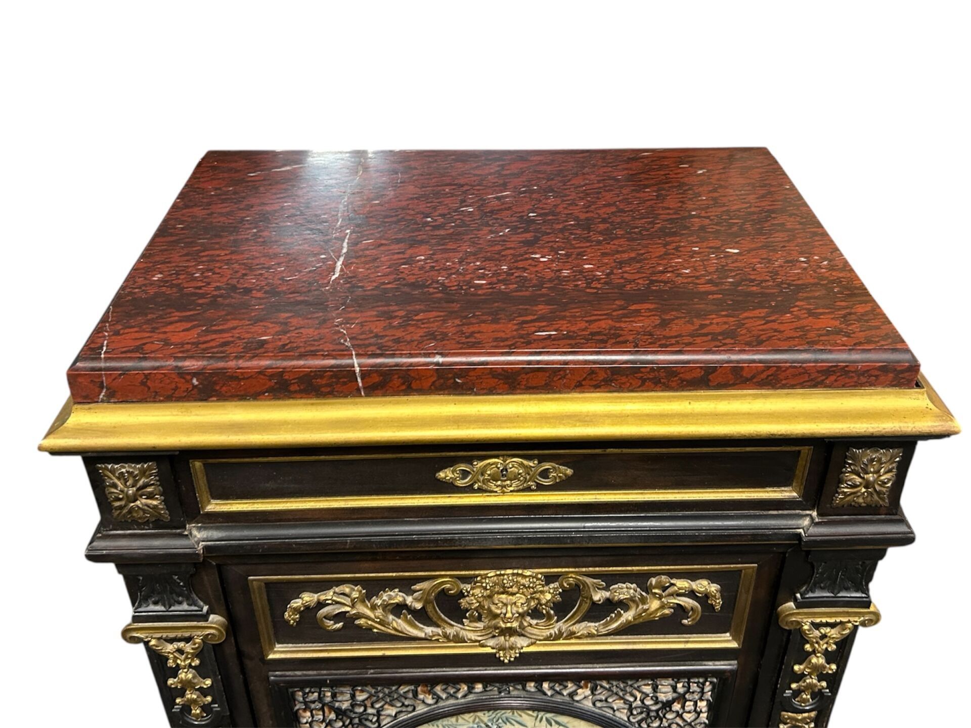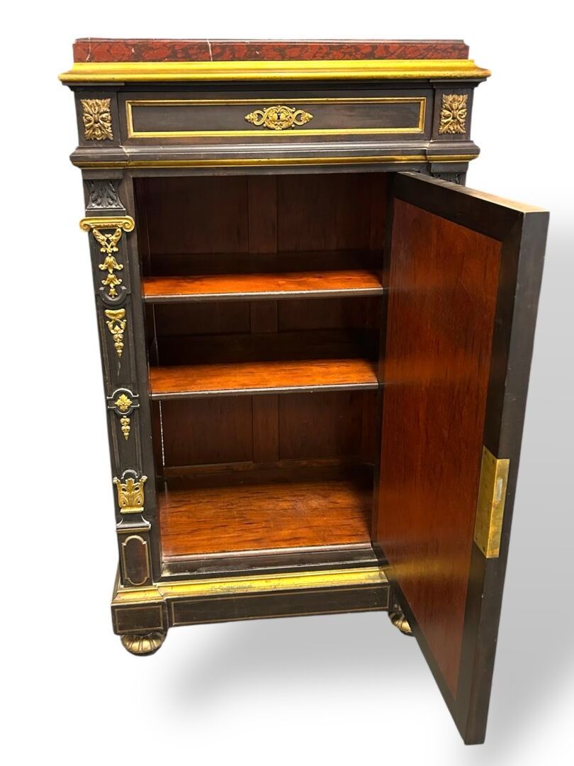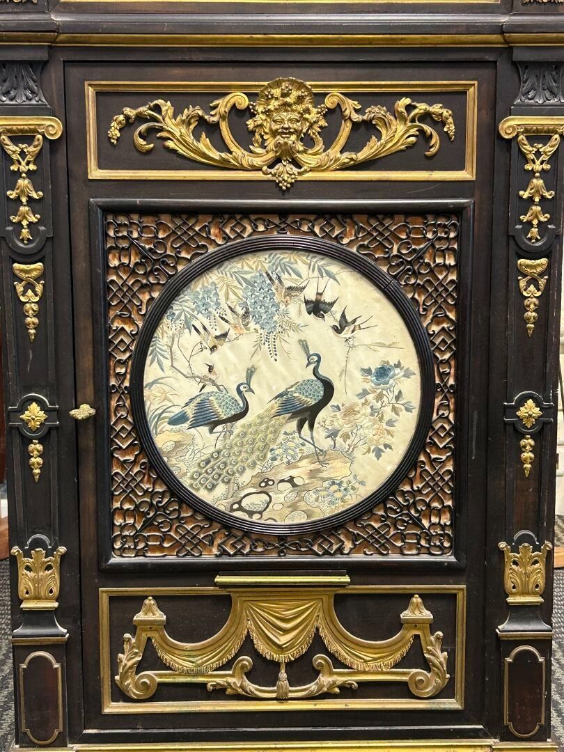 Blackened wood sideboard opening to a drawer and a door with a Japanese décor embellished with a circular silk medallion embroidered with birds, flowers and foliage. Rich ormolu and brass fillet ornamentation. Griotte red marble top. Napoleon III period. H. 77 cm W. 65 D. 40 cm (missing brass fillet on the left side)