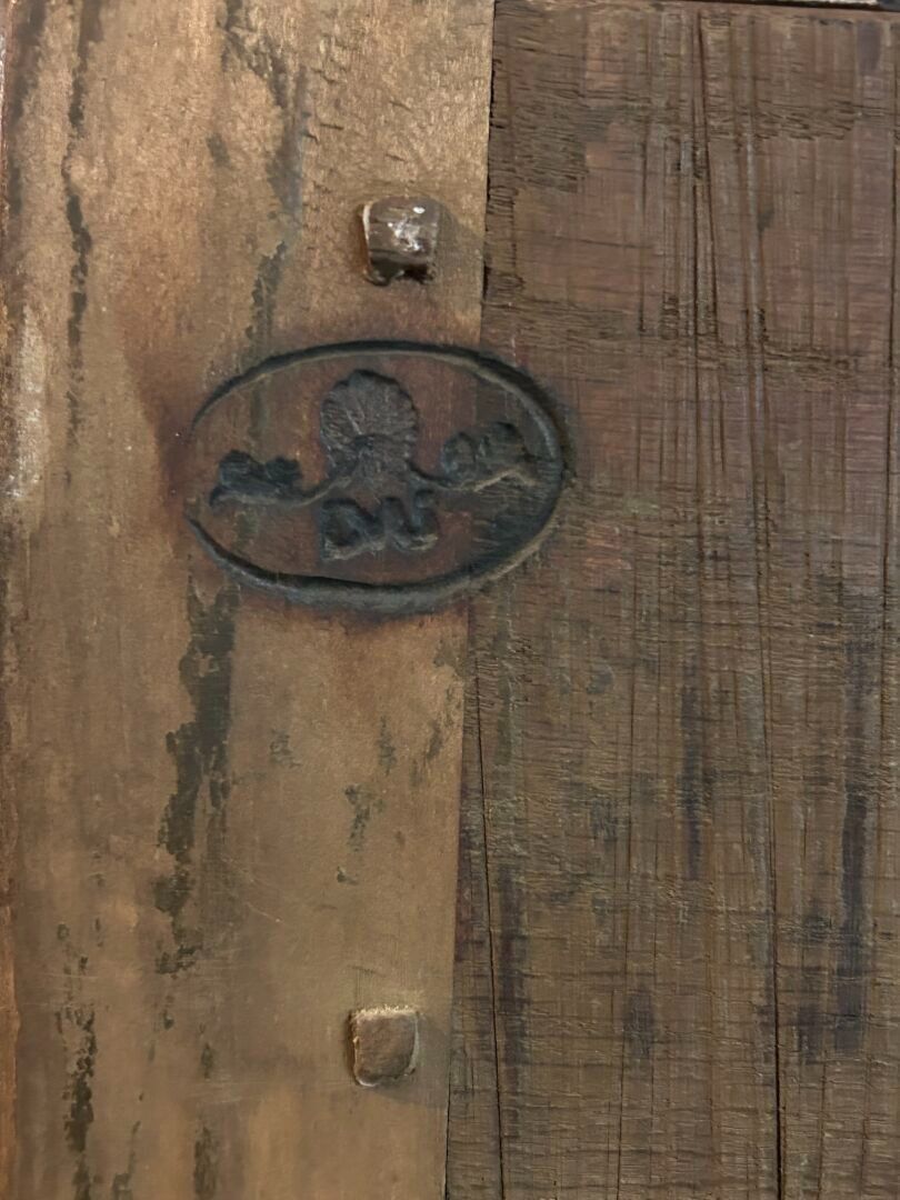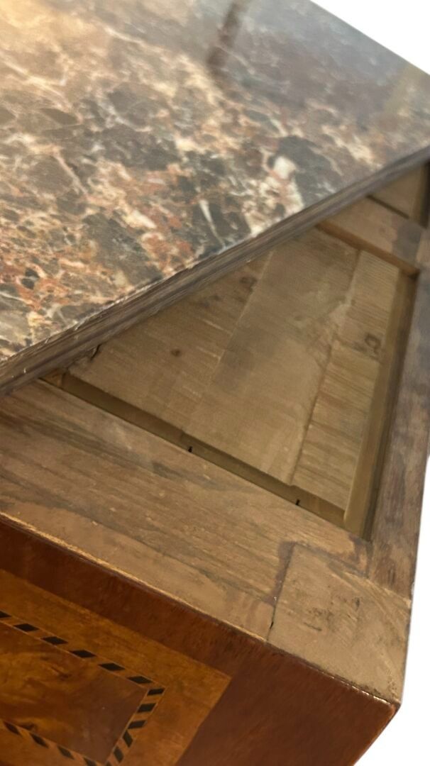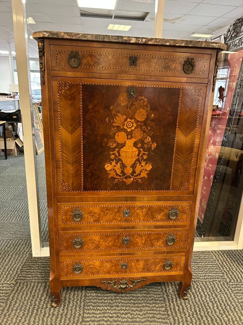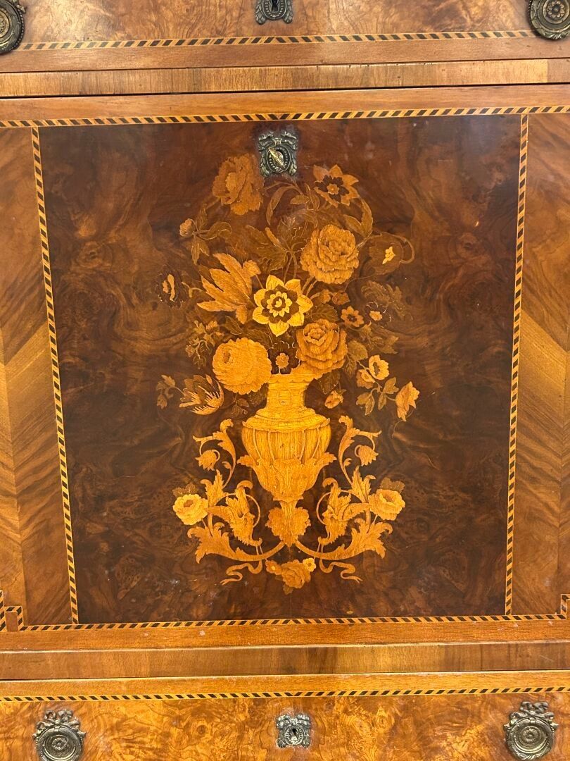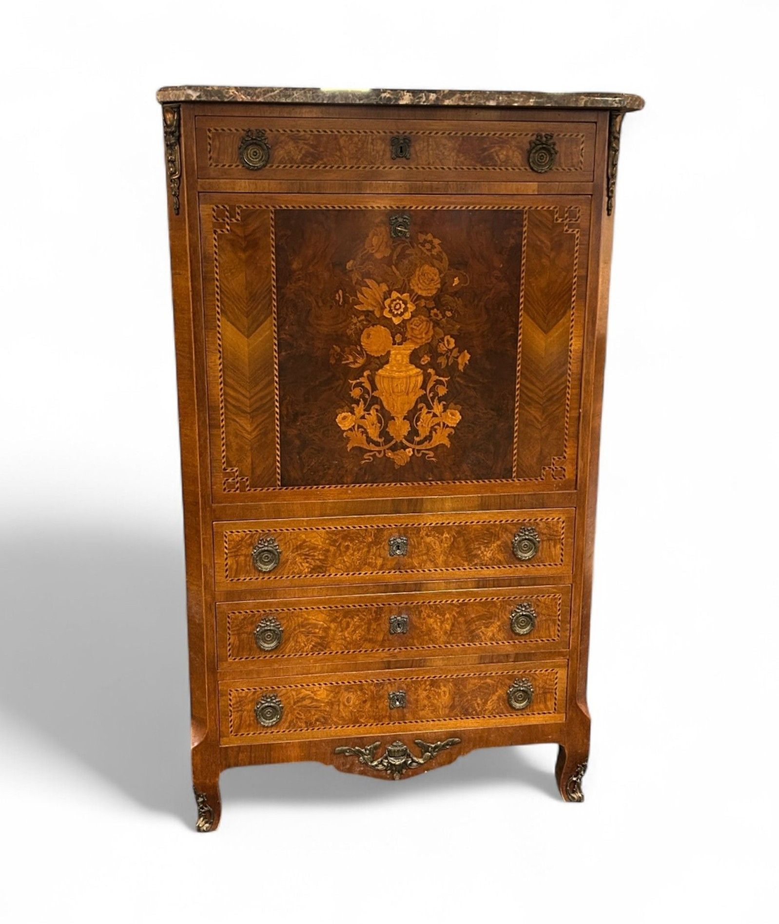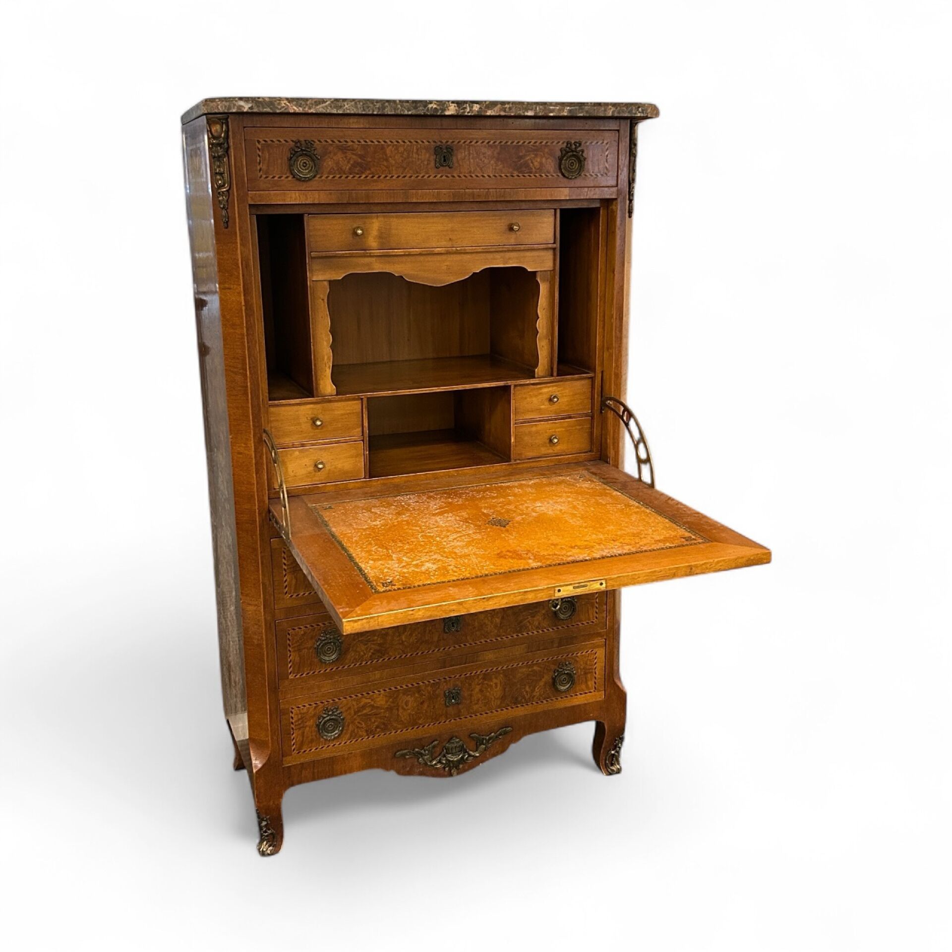 Veneered desk opening to a flap and four drawers, the flap inlaid with a floral composition, the interior concealing 5 drawers and 2 niches including 2 drawers with system opening, stamped on the back, Transition style, Work circa 1920/1930 in the taste of the eighteenth century. 153 x 91 x 44.5 cm