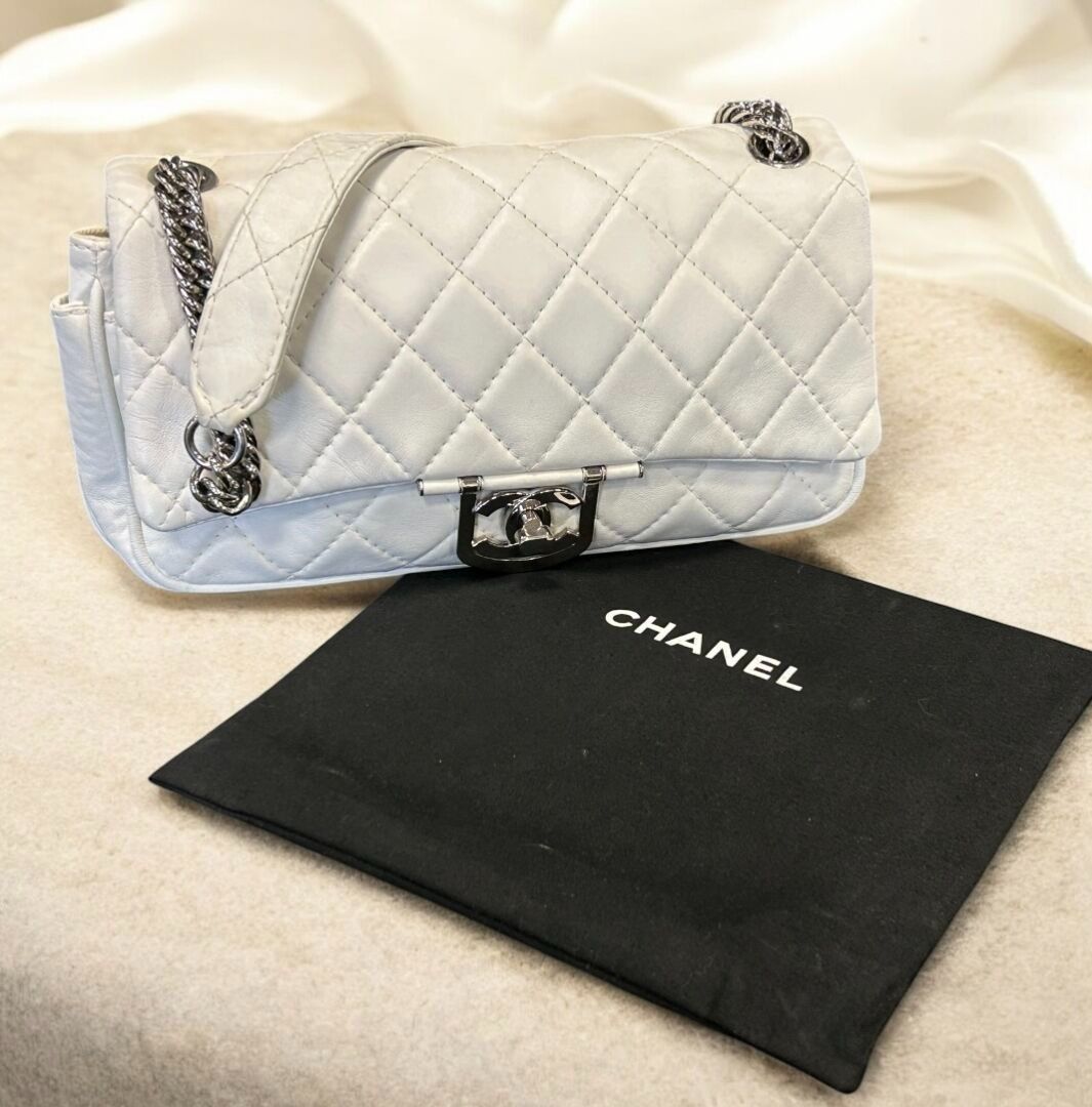 CHANEL White stitched leather flap bag, shoulder strap, palladium-plated metal chain, palladium-plated metal turnlock clasp on double CC. 29 x 16 cm. With dustbag. (Small stain on inner fabric, most likely erasable).