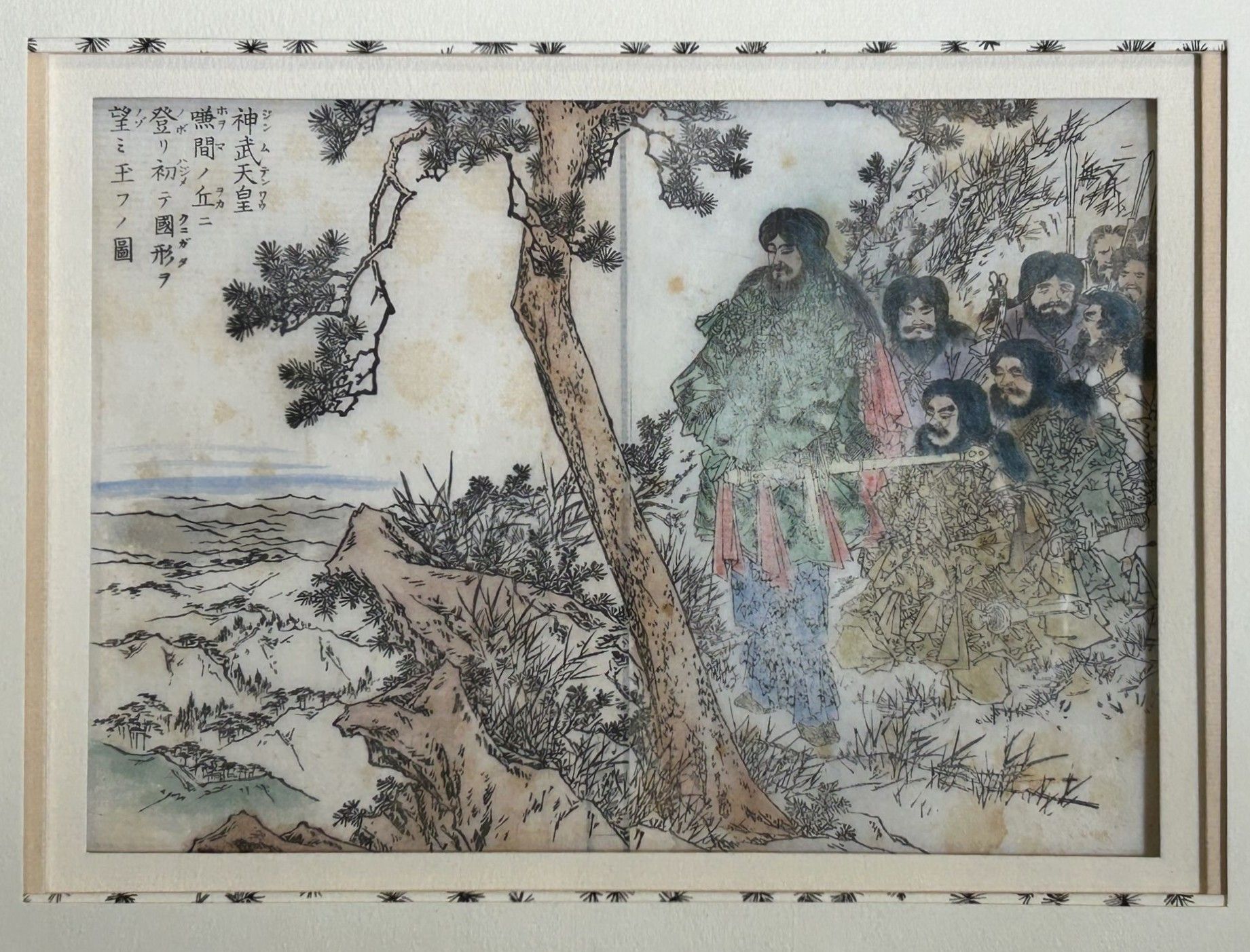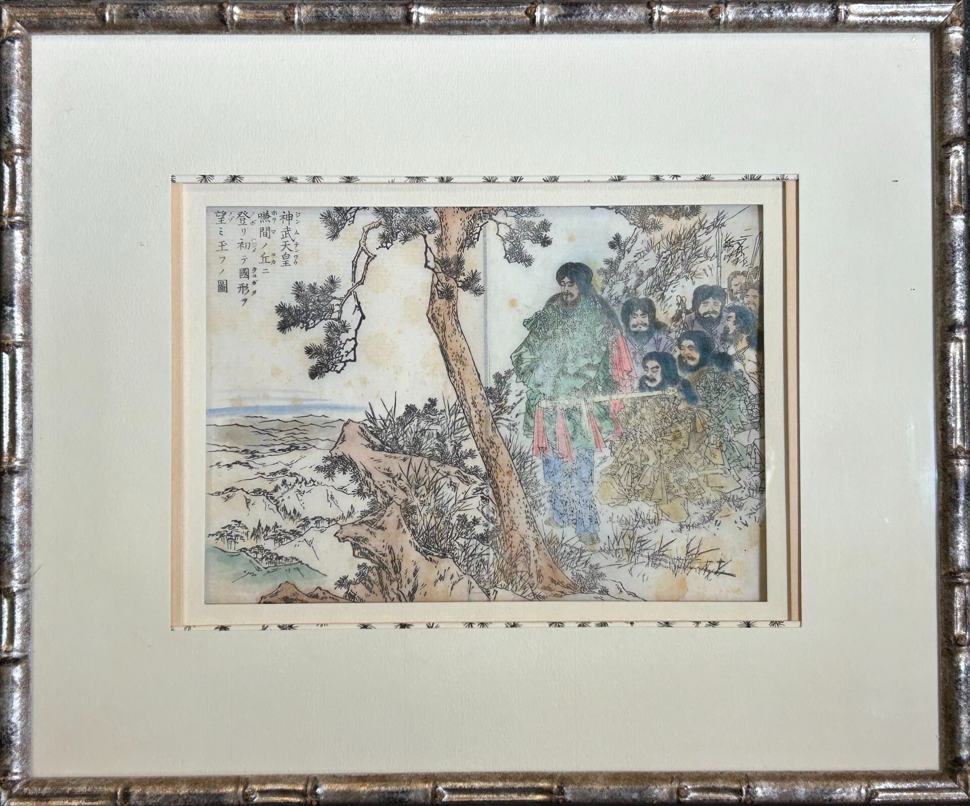 * JAPAN Early 20th century. Samurai on a hillside. Polychrome print framed on paper (pitting) 16.7 x 23.7 cm on view.