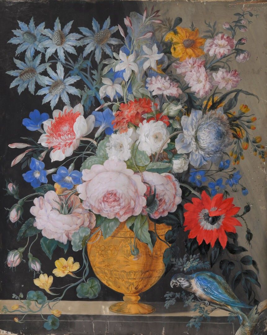 18th century German school, entourage of Barbara Regina Dietsch, "Cut flowers in a bronze vase and parrot on an entablature, gouache on vellum. 47 x 37.3 cm (small accidents)