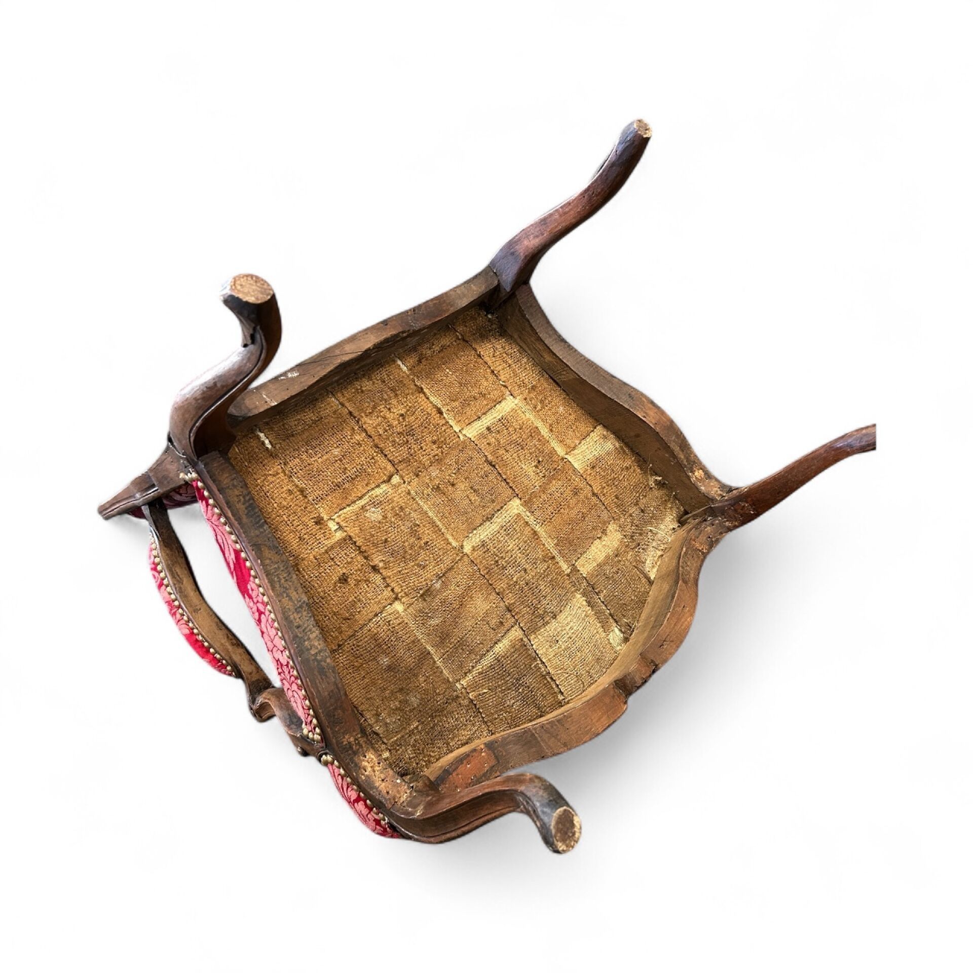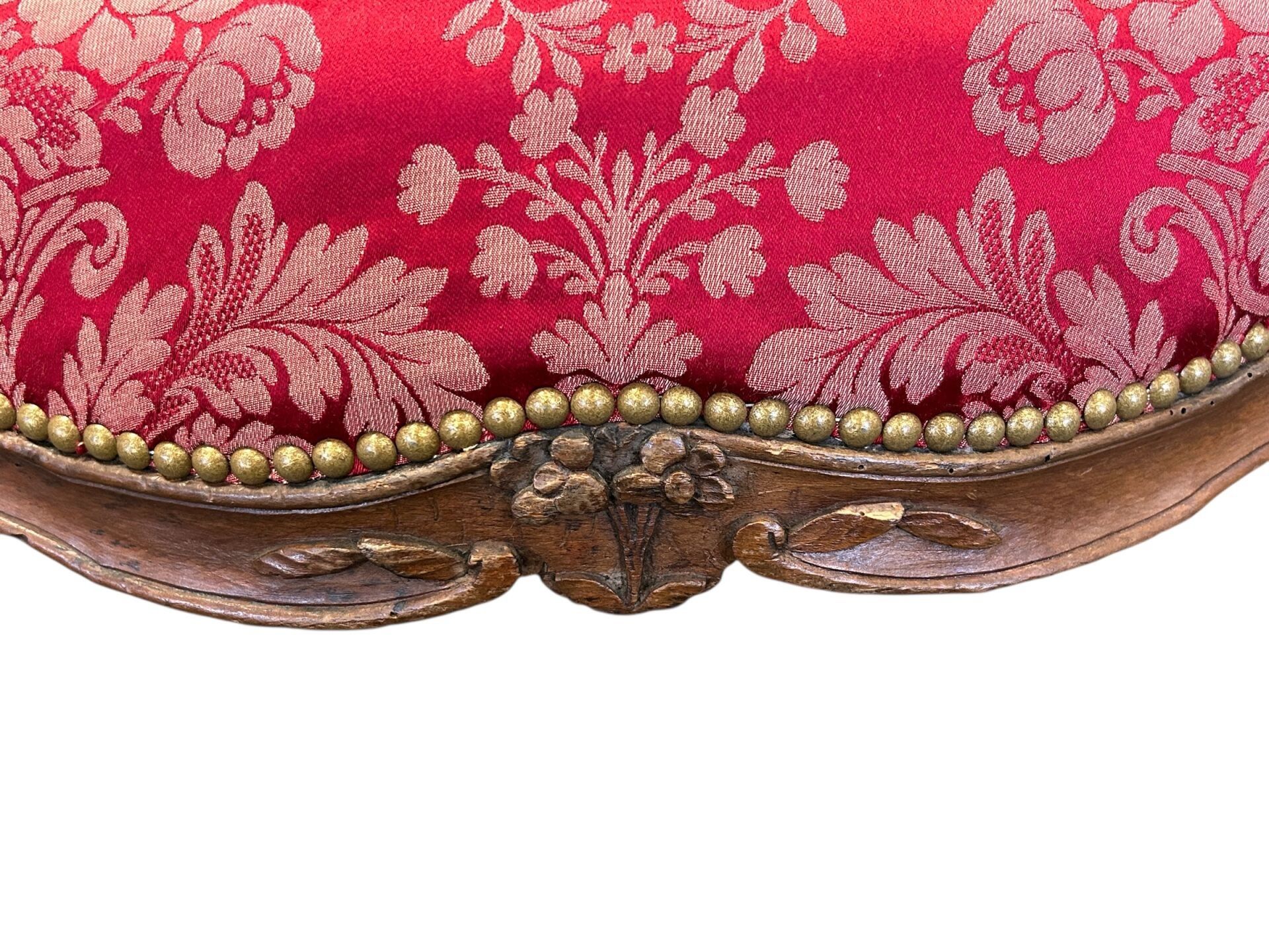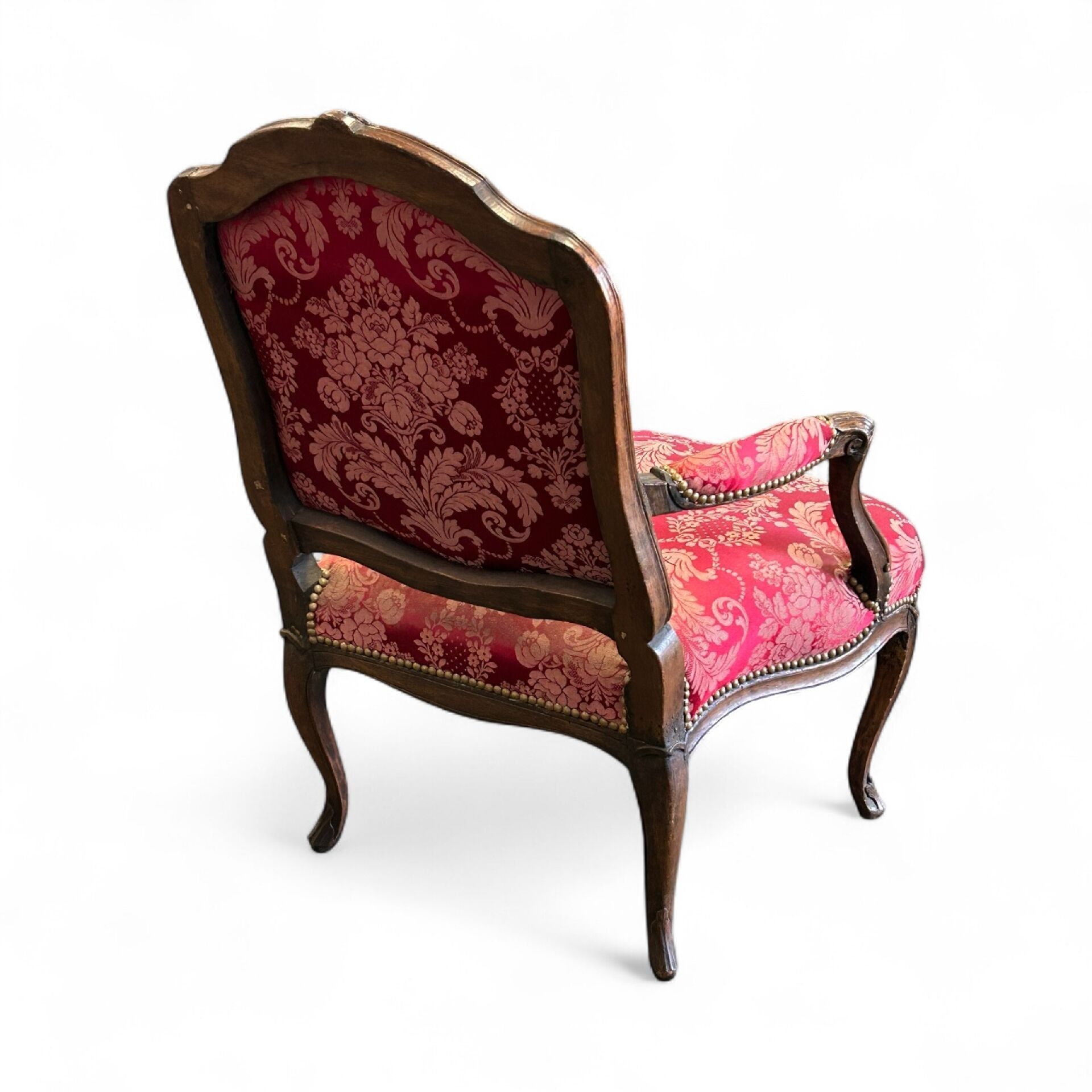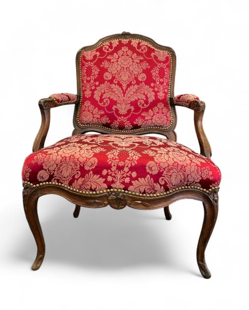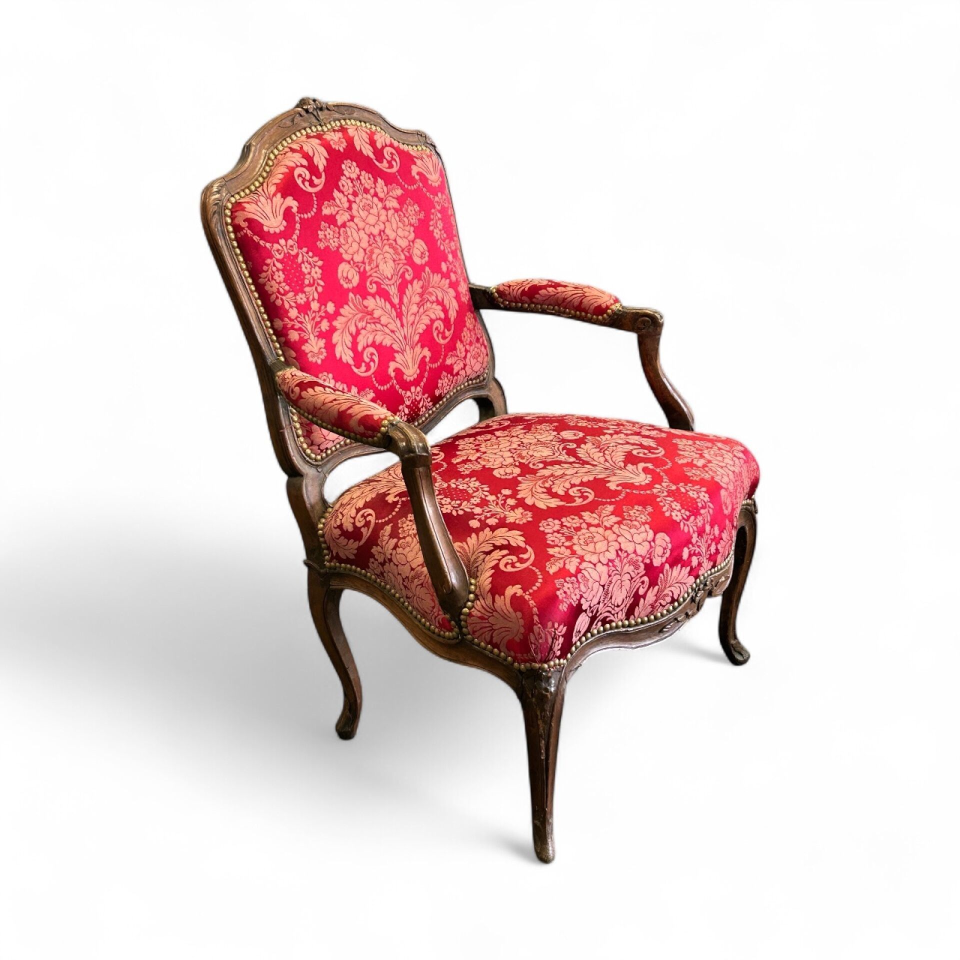 Moulded and carved wooden armchair with floral decoration, Queen's back, curved legs, stamped by Charles DELENONCOURT, received master in 1752, Louis XV period, red silk upholstery with floral motifs. H. 93 cm L. 65 cm (small missing parts on the front)
