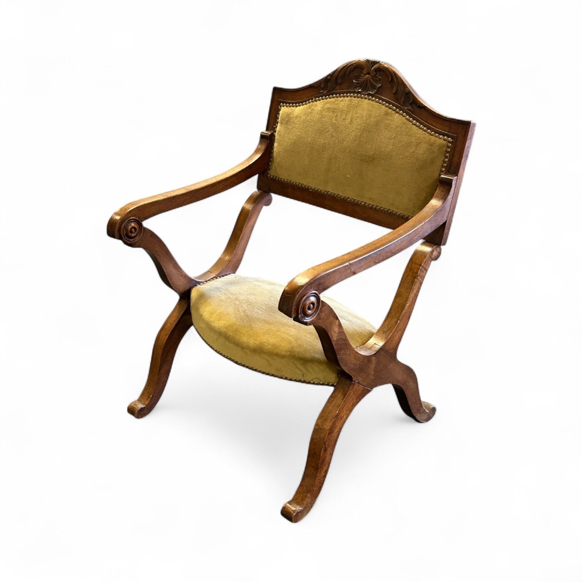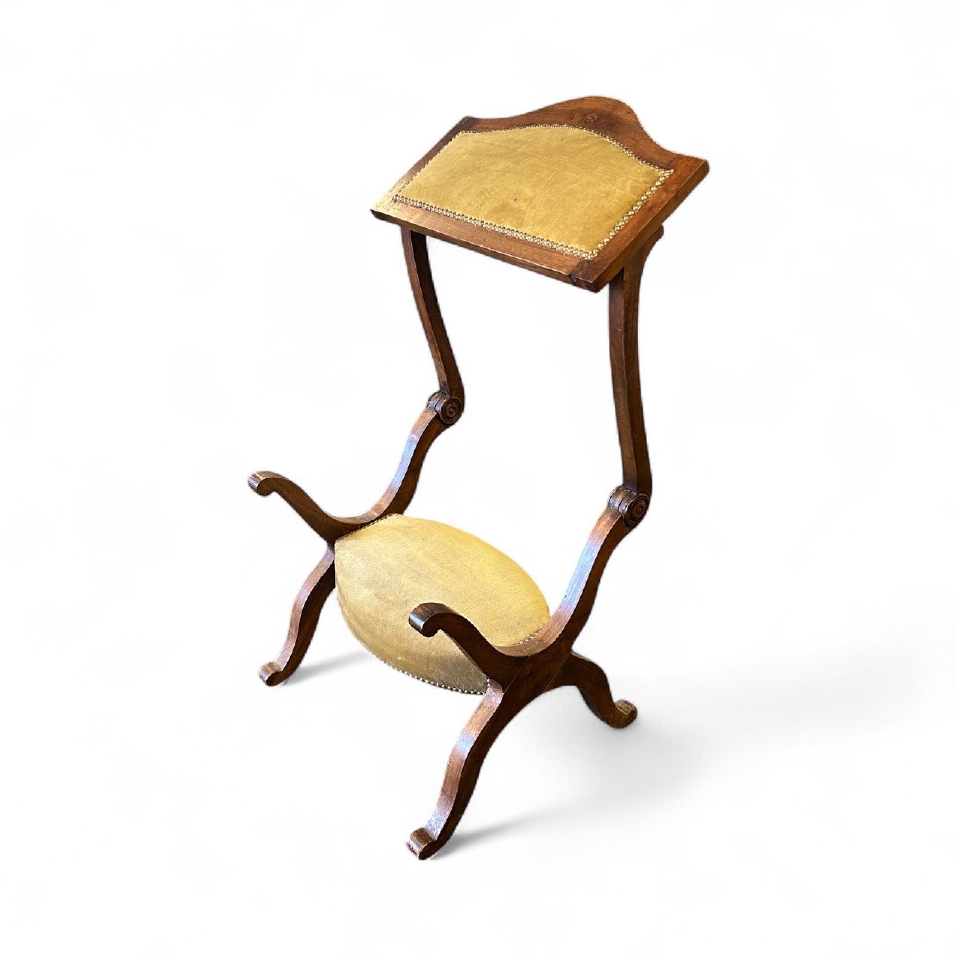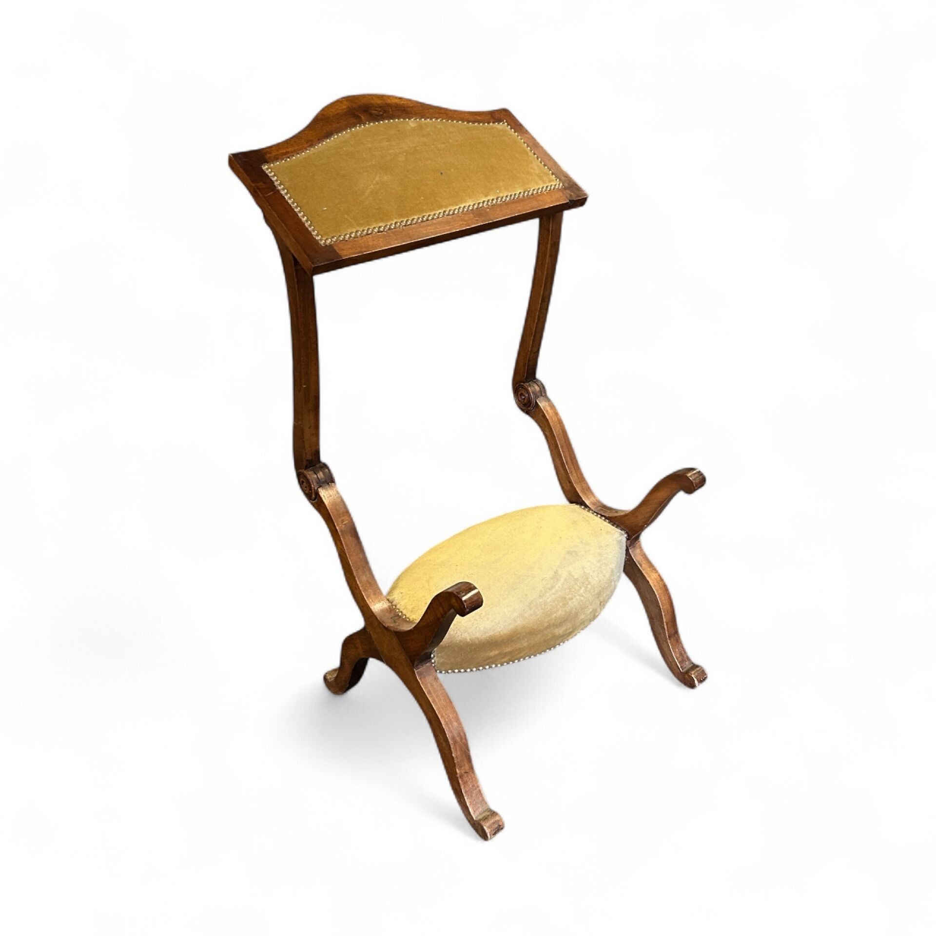 Restoration period walnut prie-dieu armchair with almond green velvet upholstery. Height 80 cm