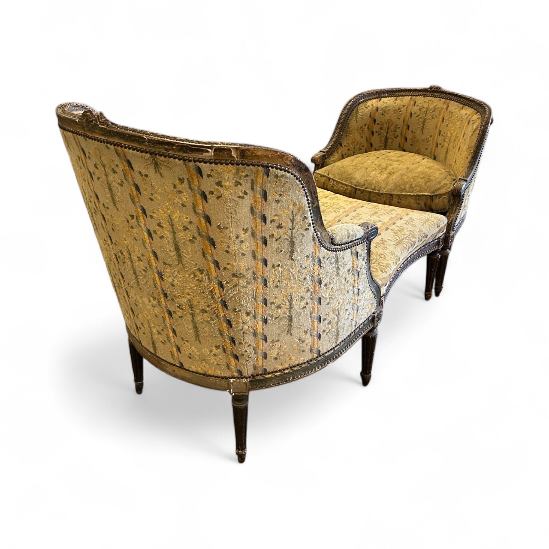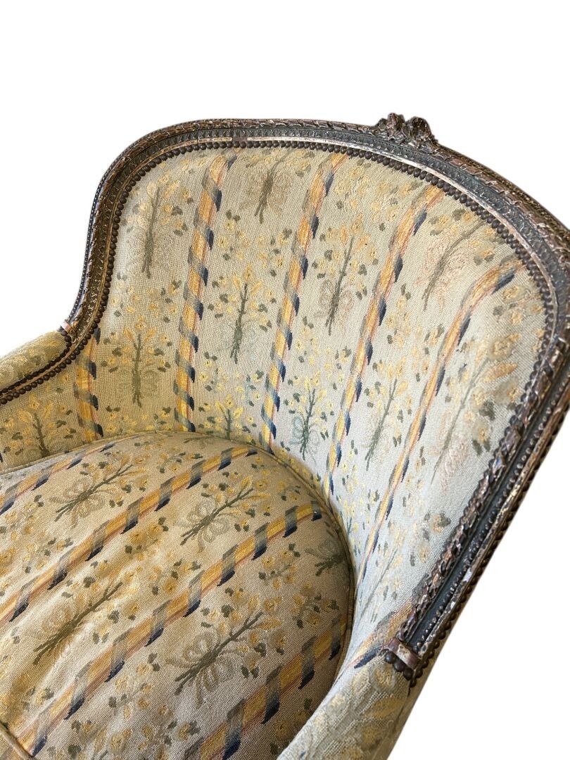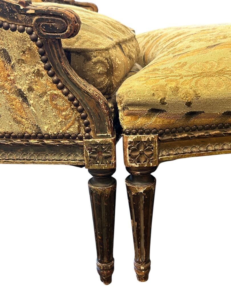 Three-part broken duchesse in carved wood, partly gilded (wear), decorated with ribboned friezes and foliage on the armrests, fluted tapered legs, small point tapestry with stylised floral decoration (very worn), Louis XVI period. L. 191.5 cm