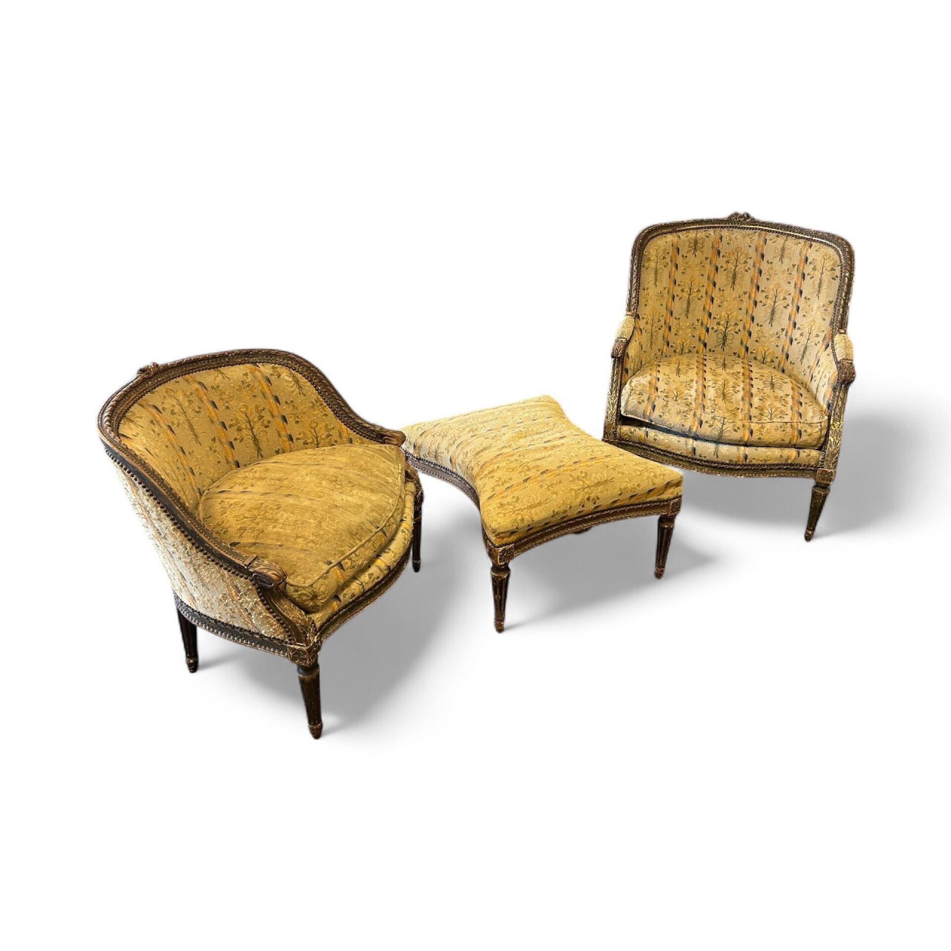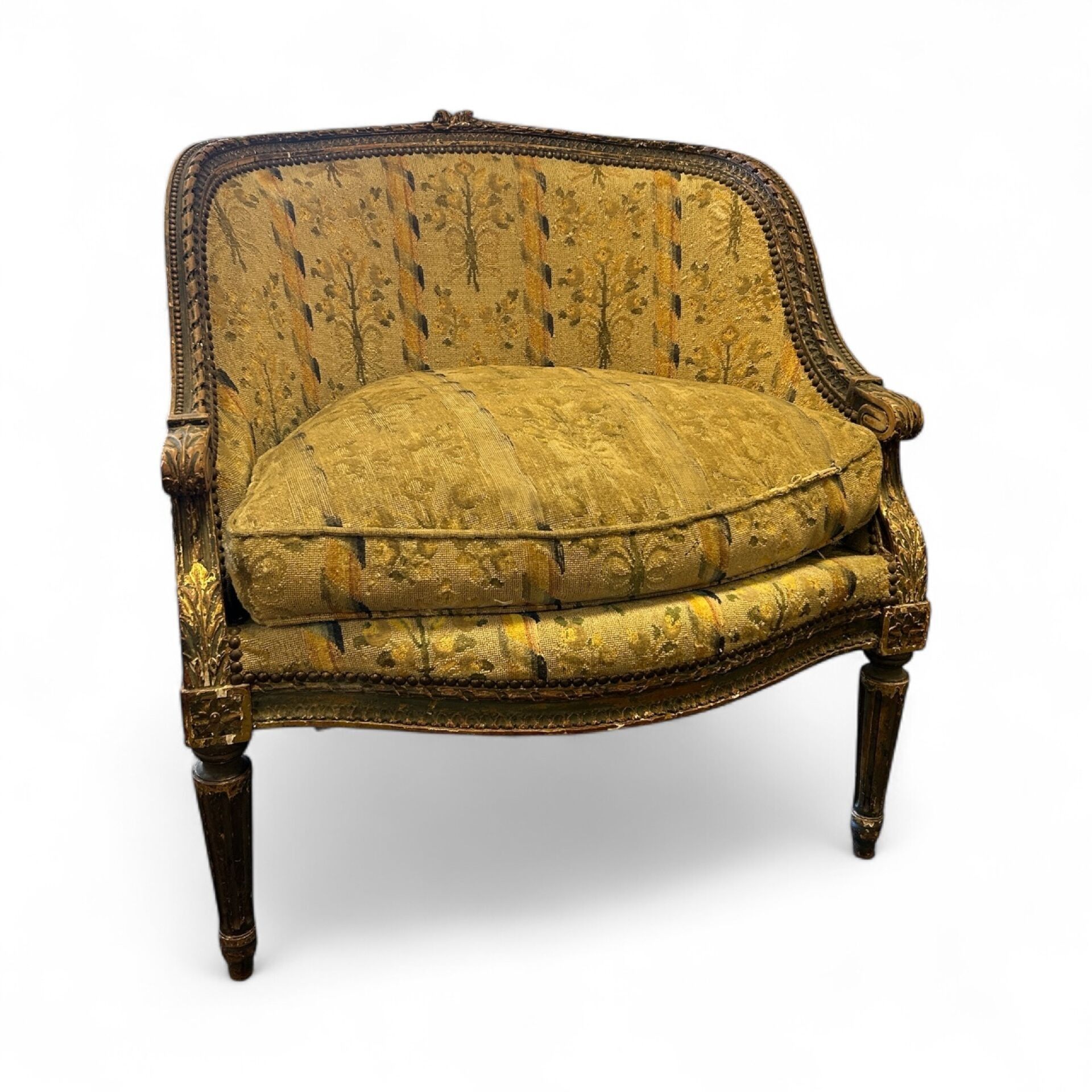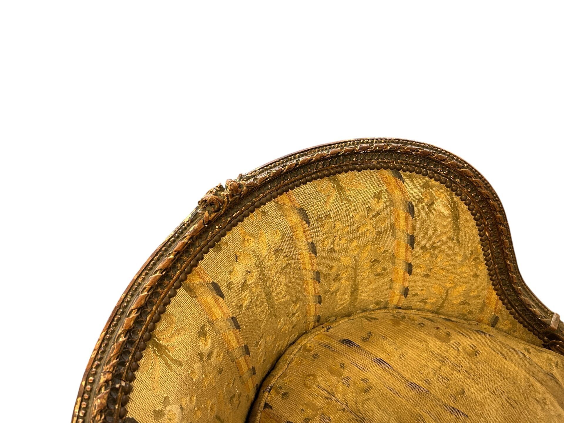 Three-part broken duchesse in carved wood, partly gilded (wear), decorated with ribboned friezes and foliage on the armrests, fluted tapered legs, small point tapestry with stylised floral decoration (very worn), Louis XVI period. L. 191.5 cm