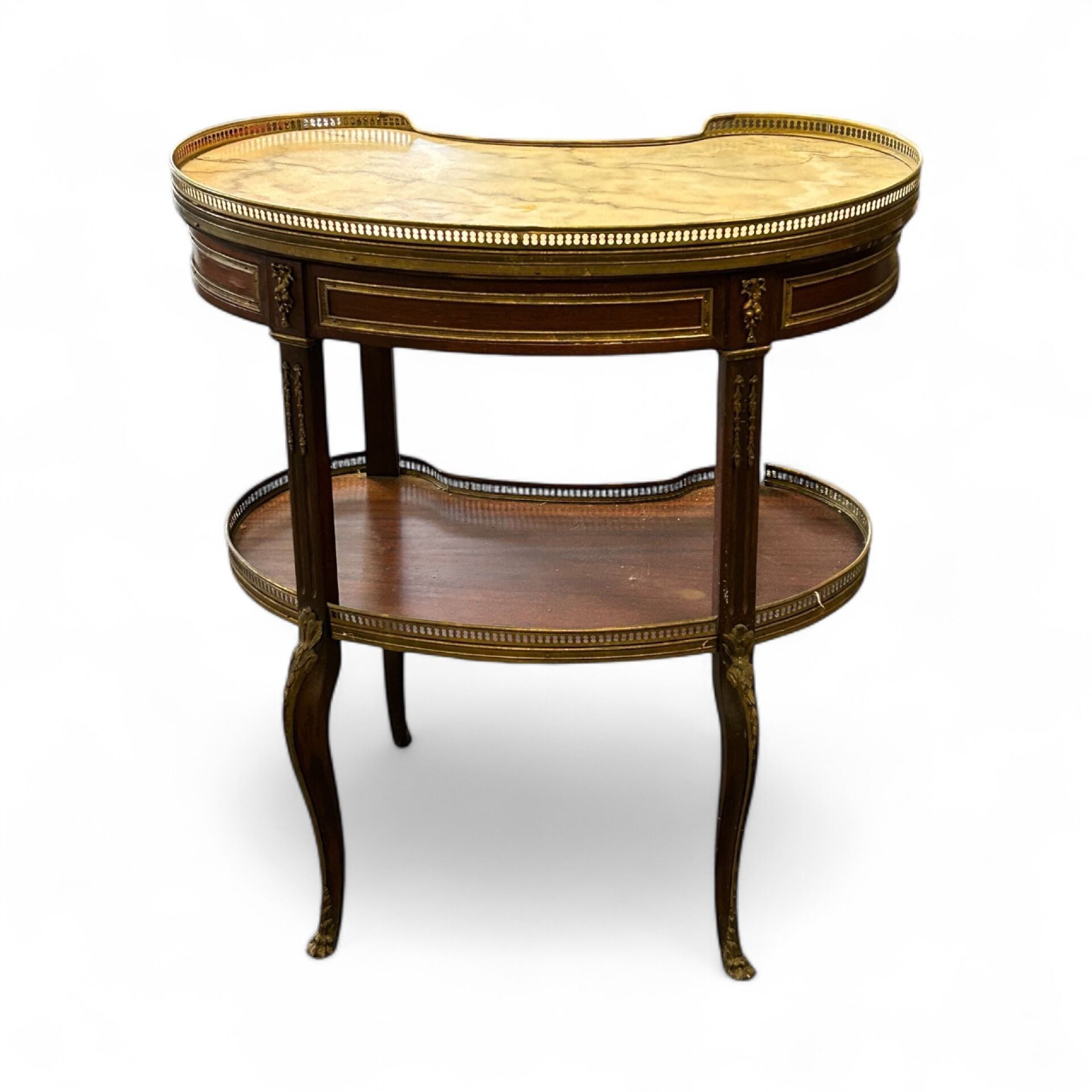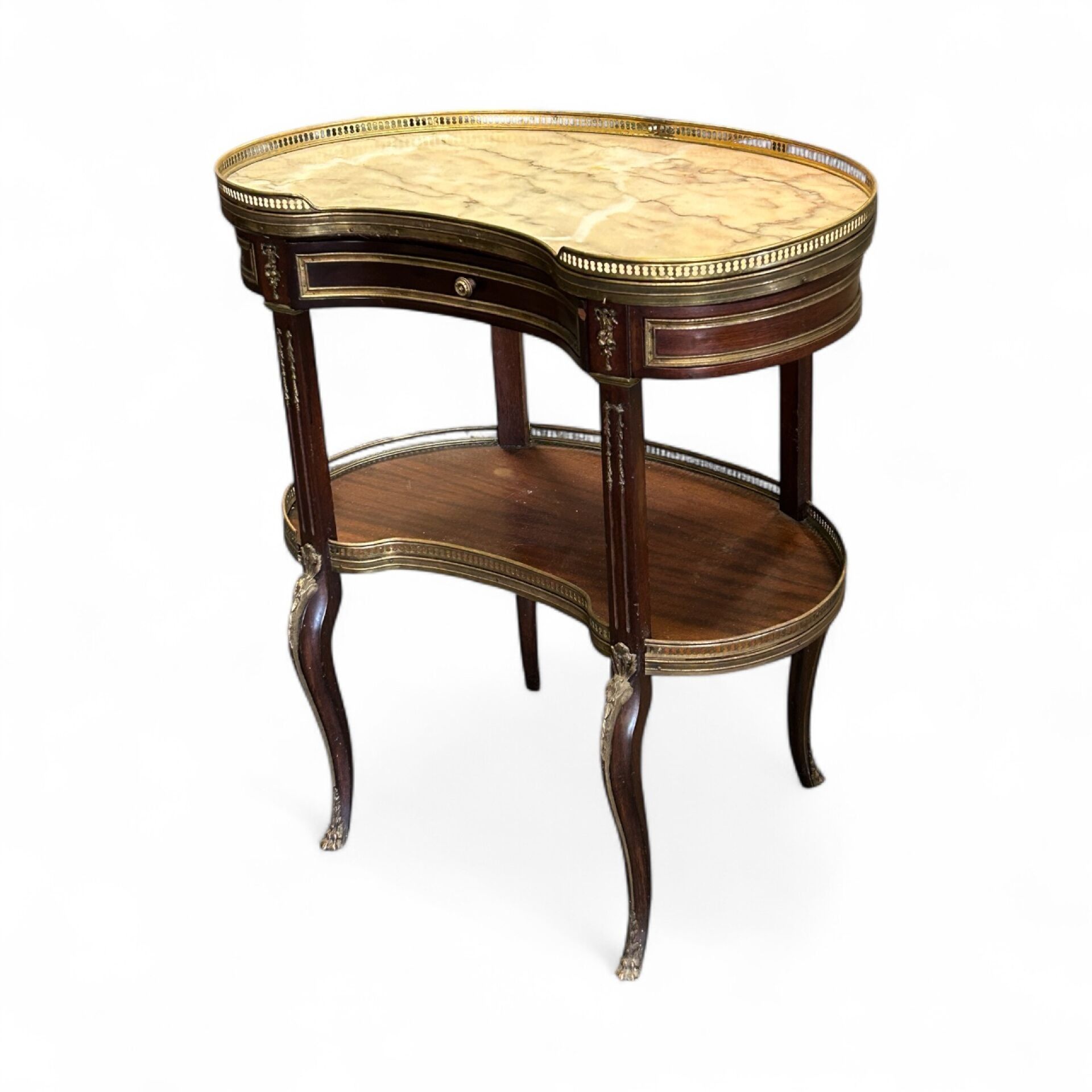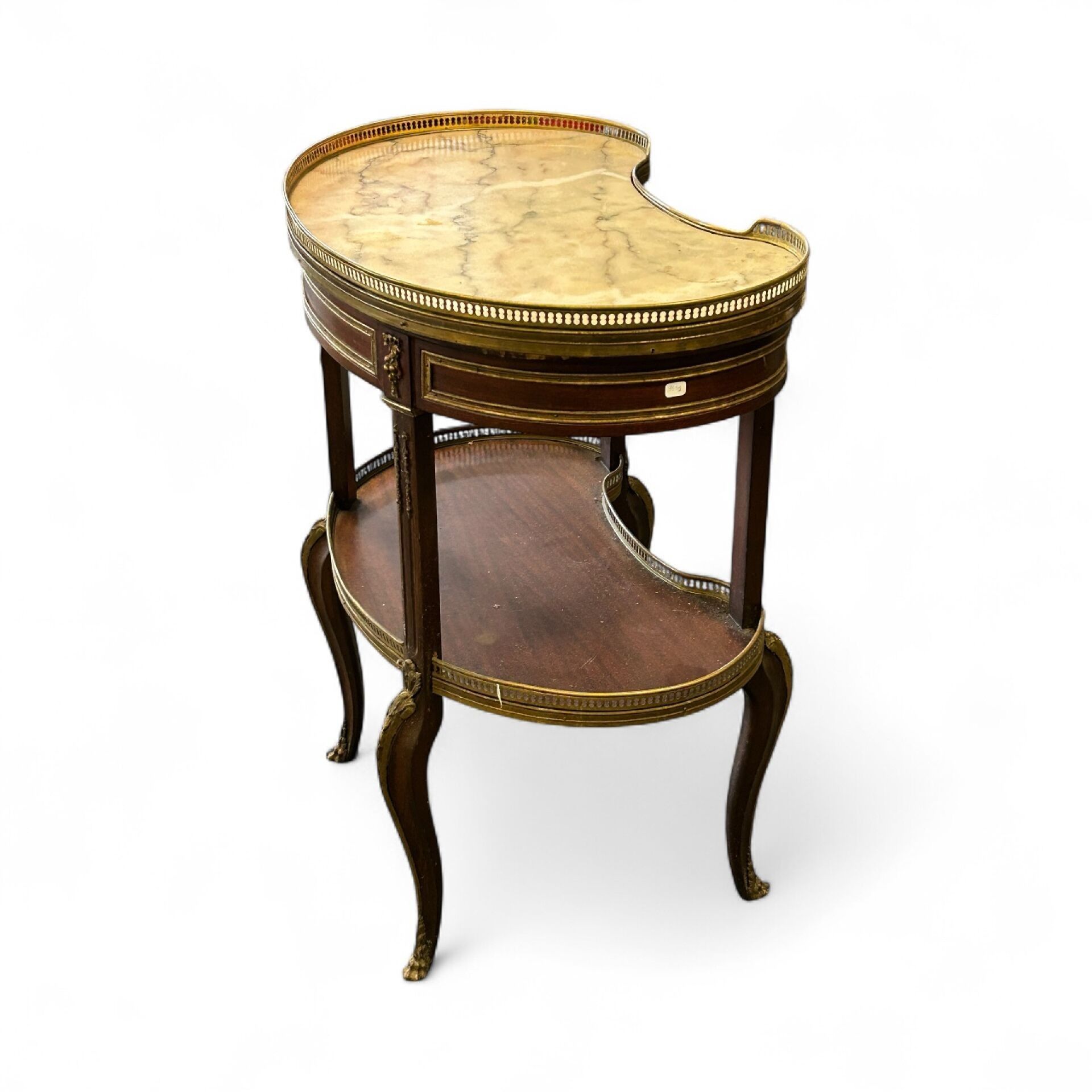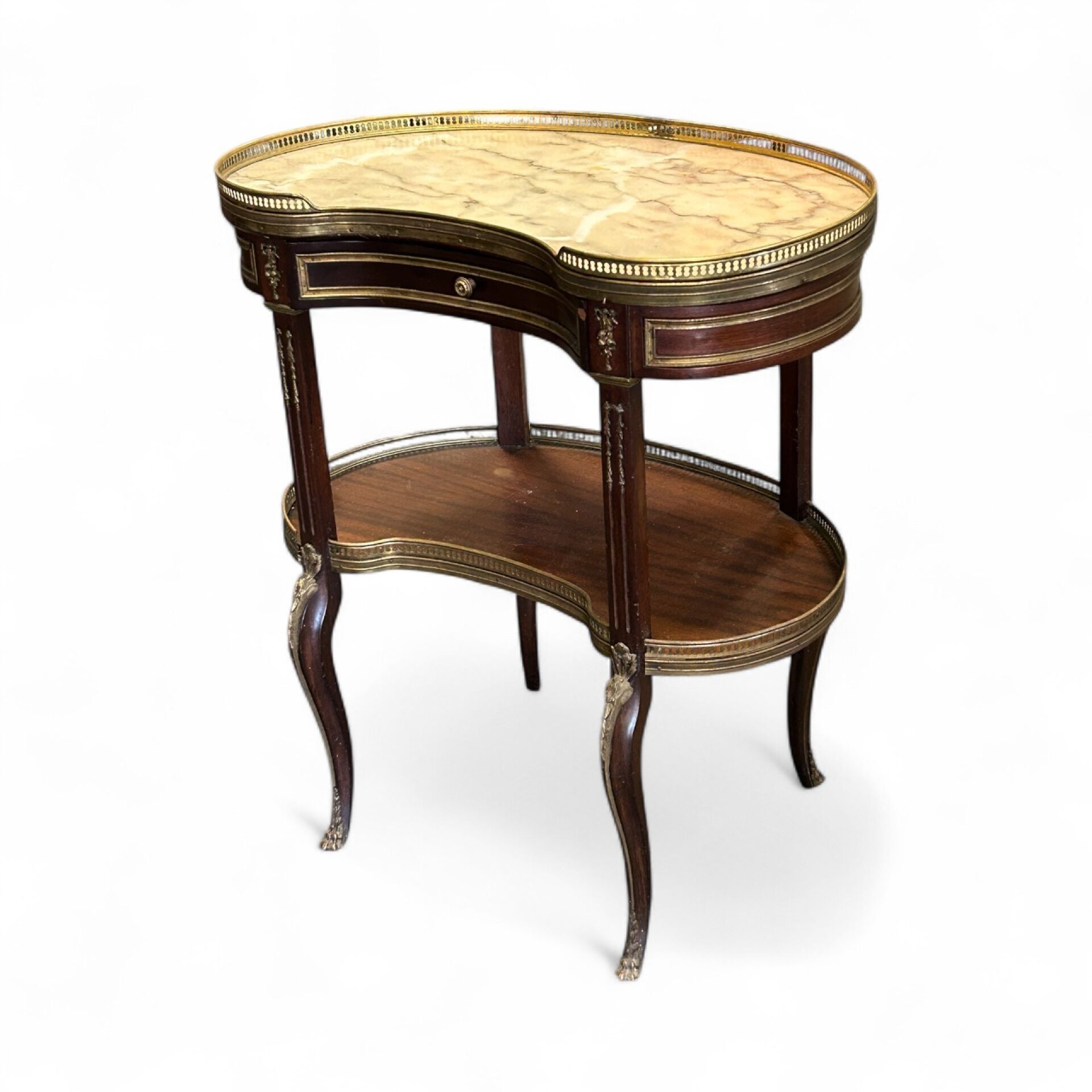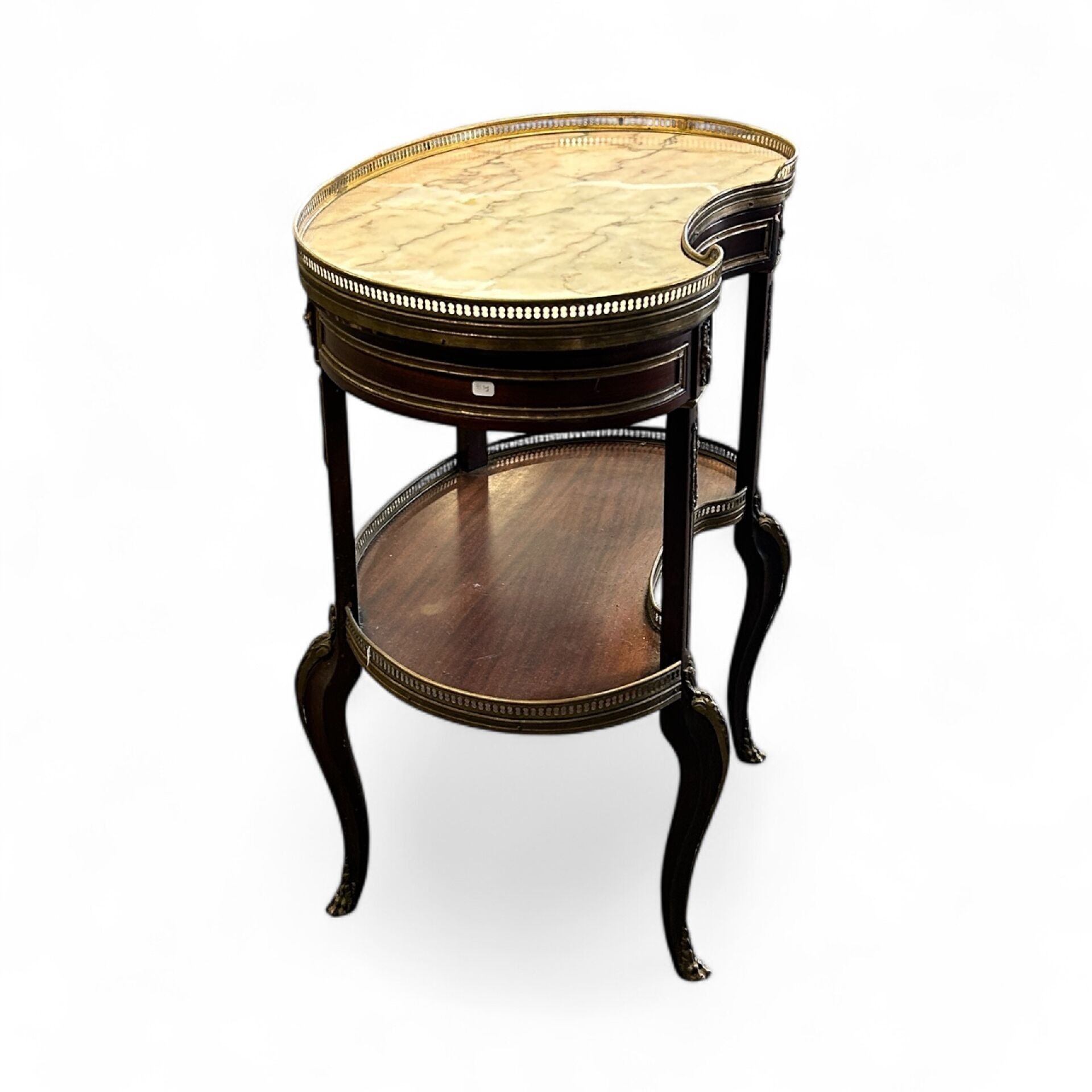 Mahogany kidney-shaped table opening to a drawer, straight then curved uprights ending in claw feet, ornamented with brass and bronze rods, legs joined by a crotch shelf, openwork brass brackets, marble top, 19th century work. Height 76 cm Width 70 cm