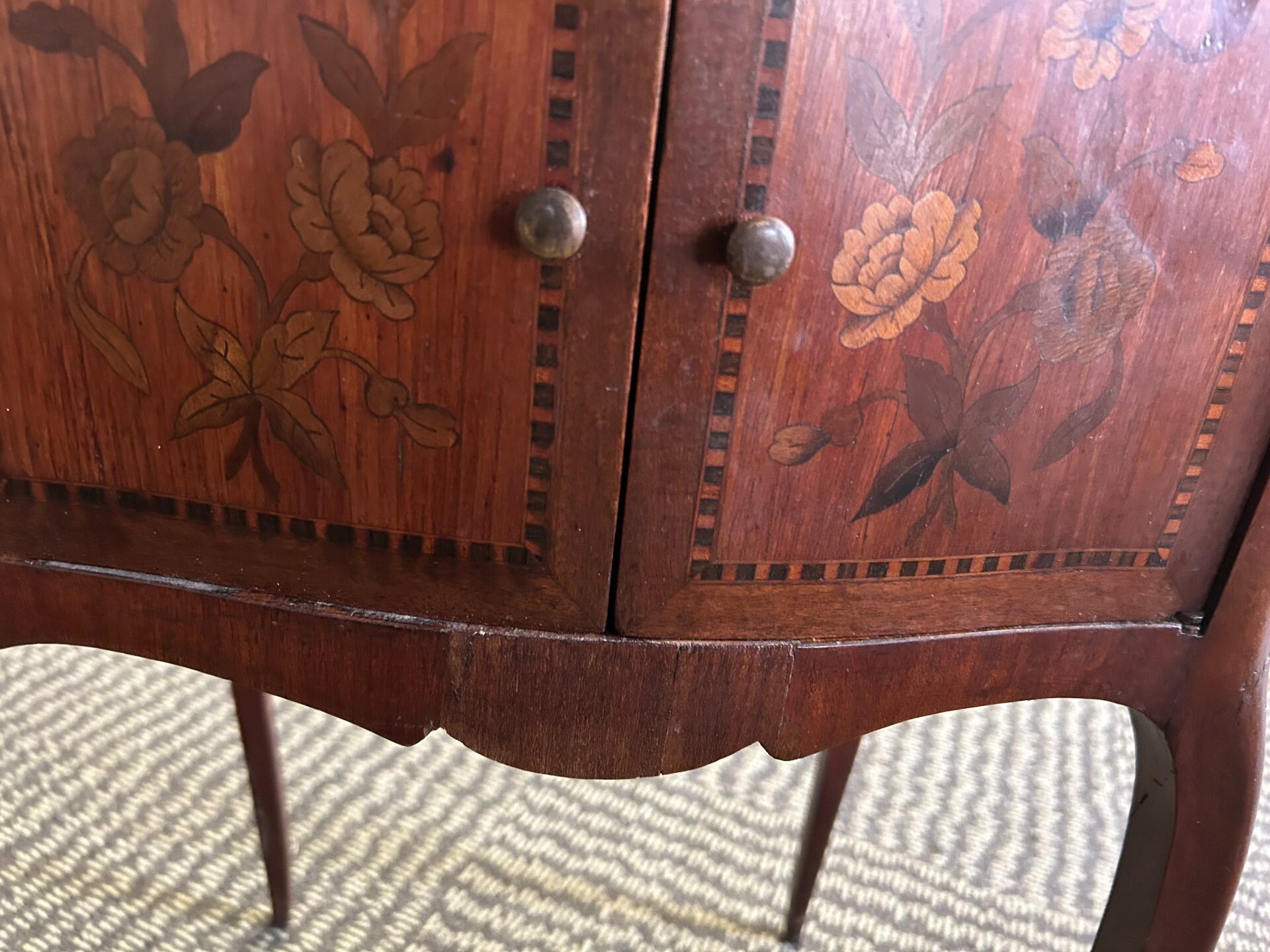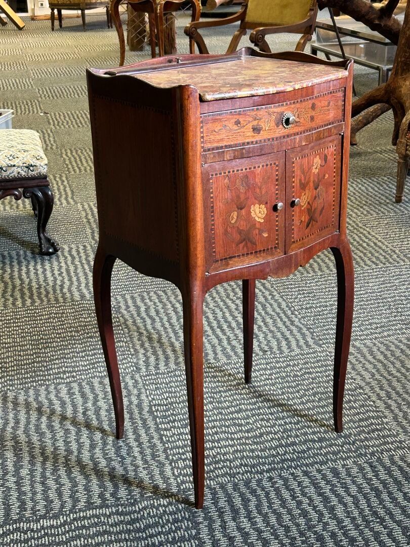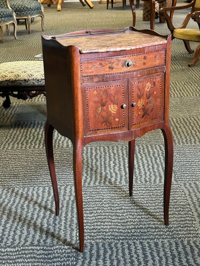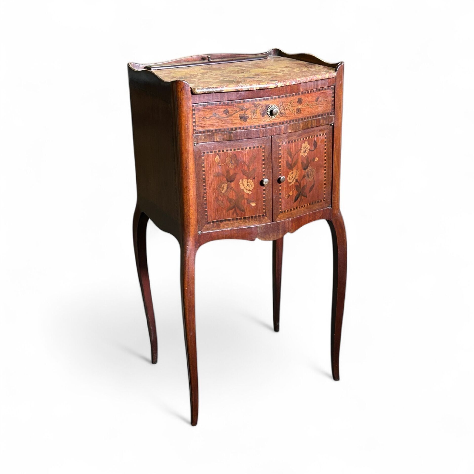 Small dressing table in wood and veneer with floral decoration opening with a drawer in the waist and two flaps, top with a shelf to be lifted revealing a mirror and top in breche marble, curved legs, Louis XV style, 19th century work. 78 x 40 x 33.3 cm (restorations)