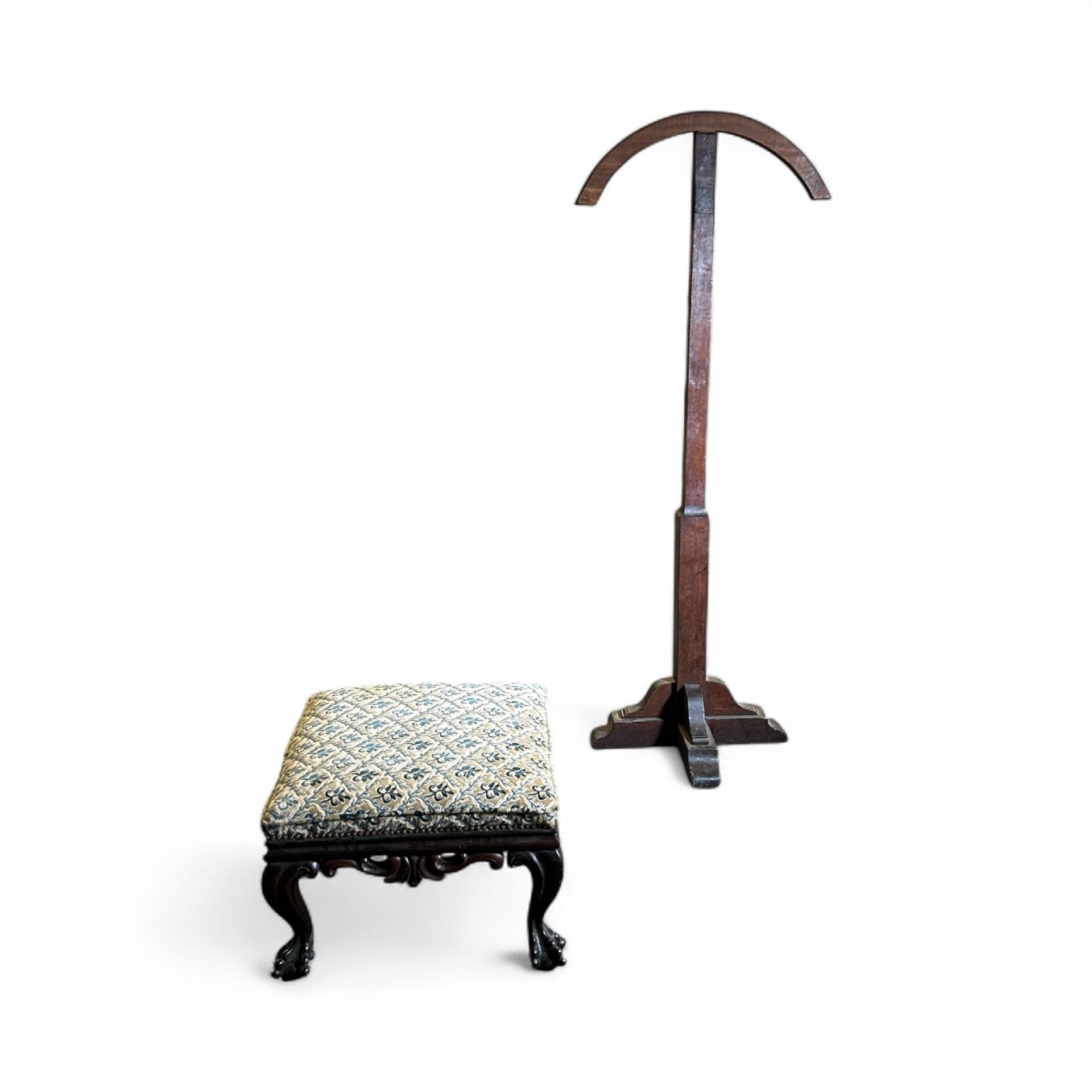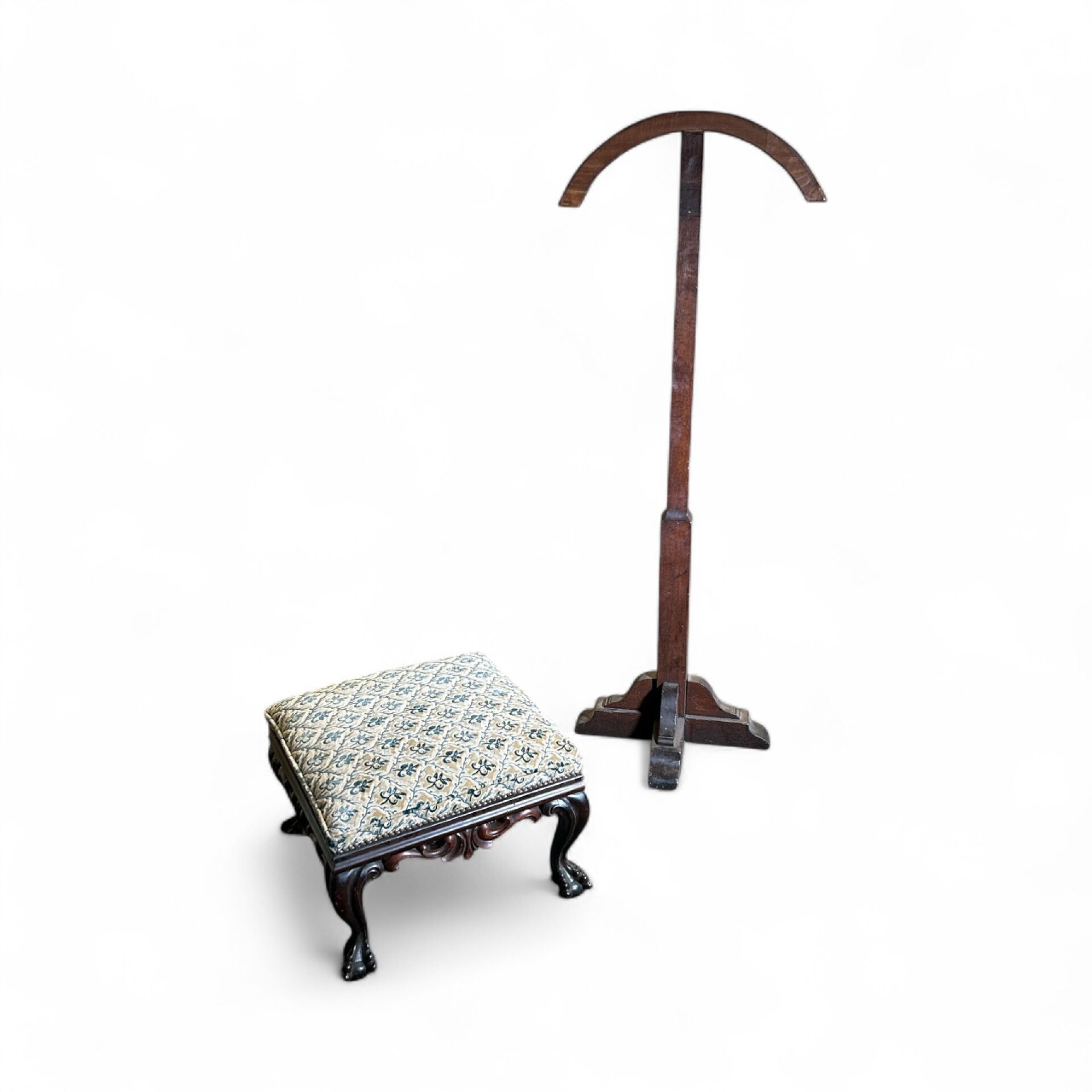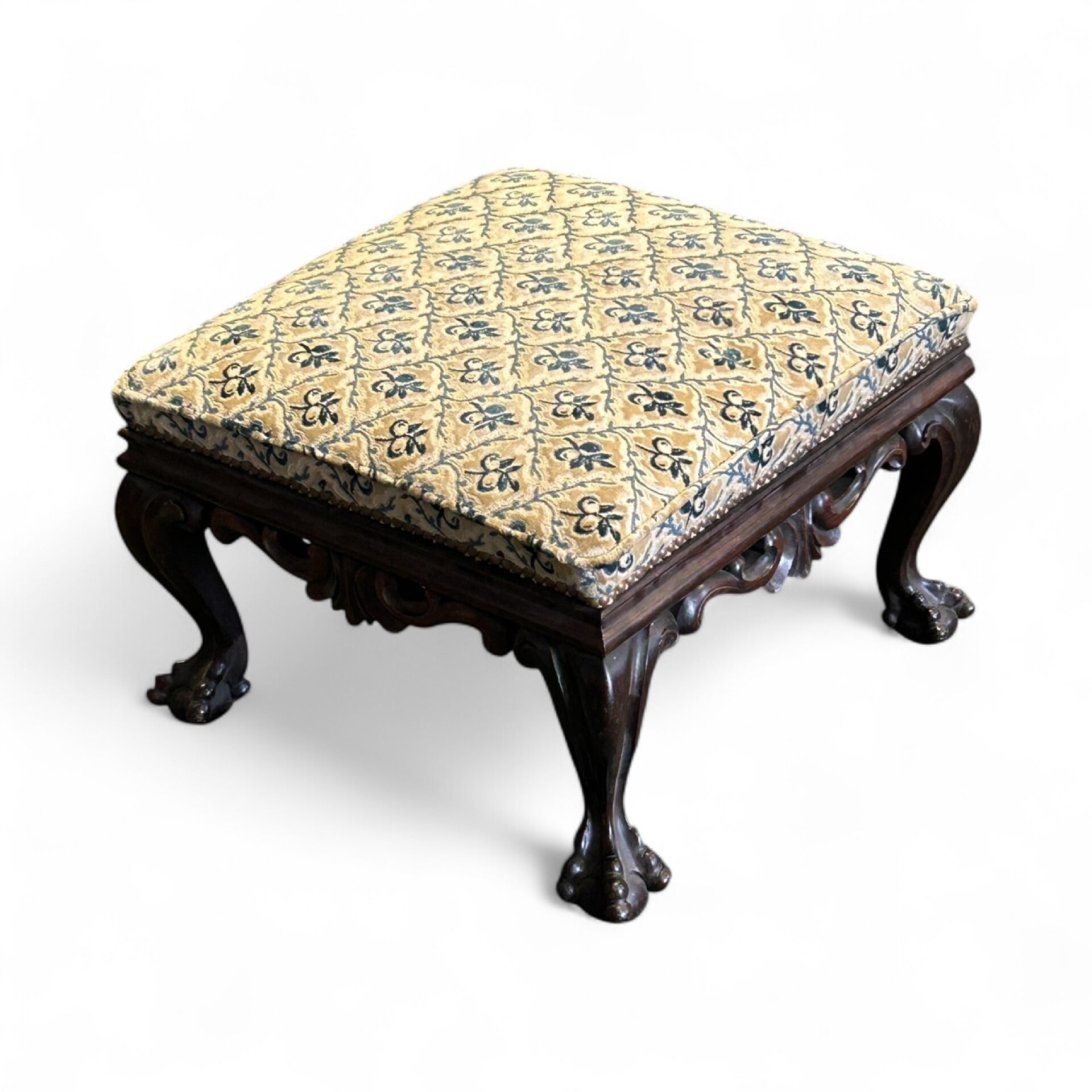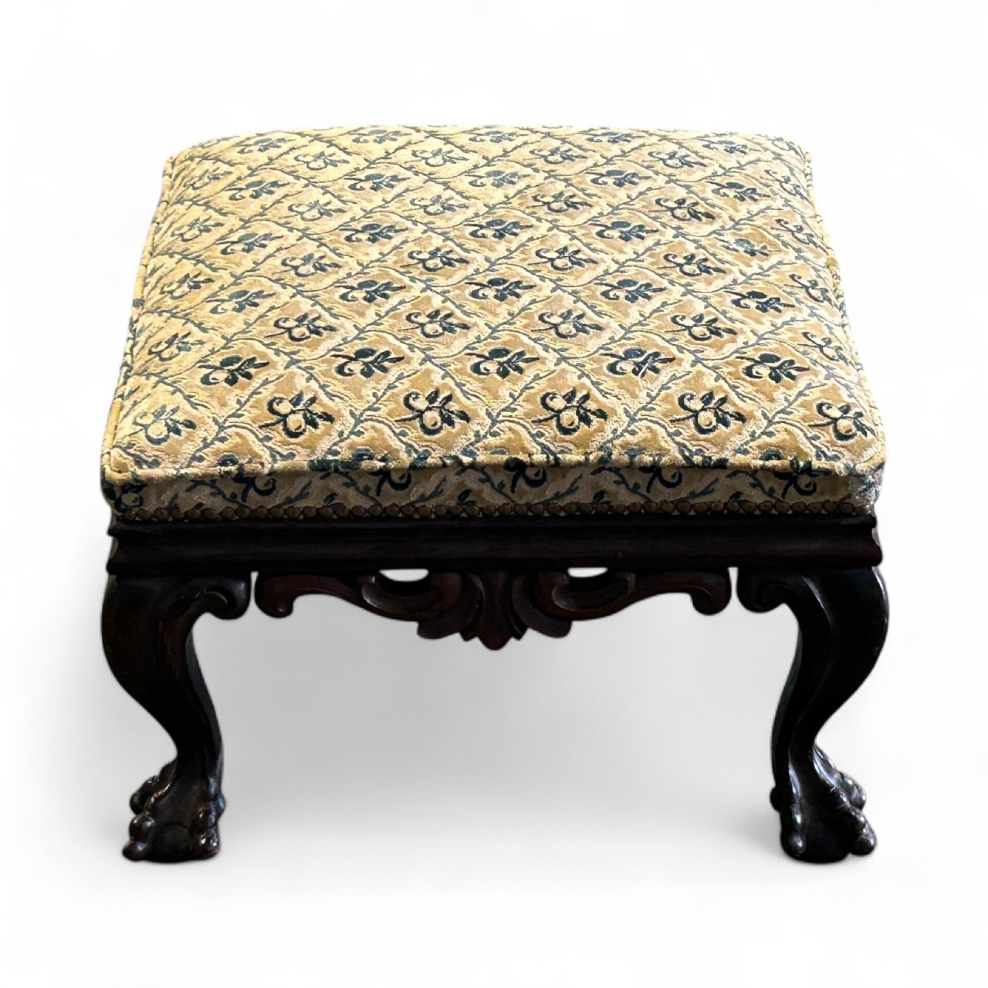A rosewood stool with claw feet, Chippendale style, later velvet upholstery. Height 34cm