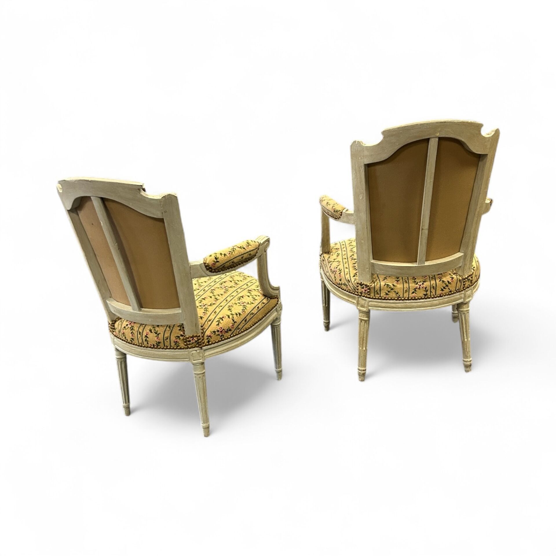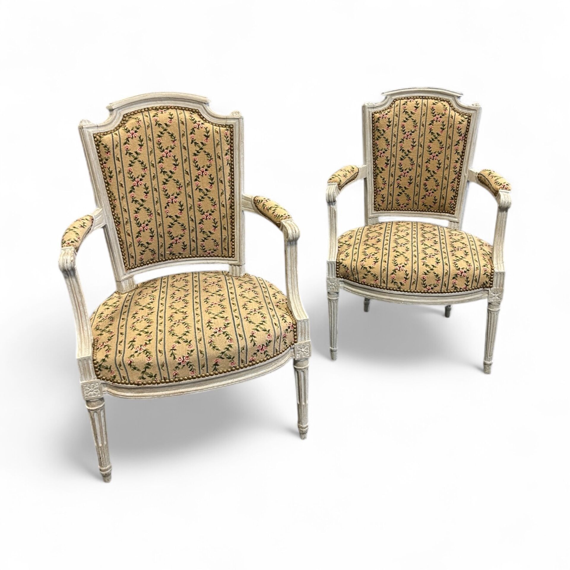 Two armchairs in moulded and carved wood with white rechampi, gendarme hat back, fluted tapered legs, floral fabric upholstery, Louis XVI style, 19th century work (cracks in the armrests).