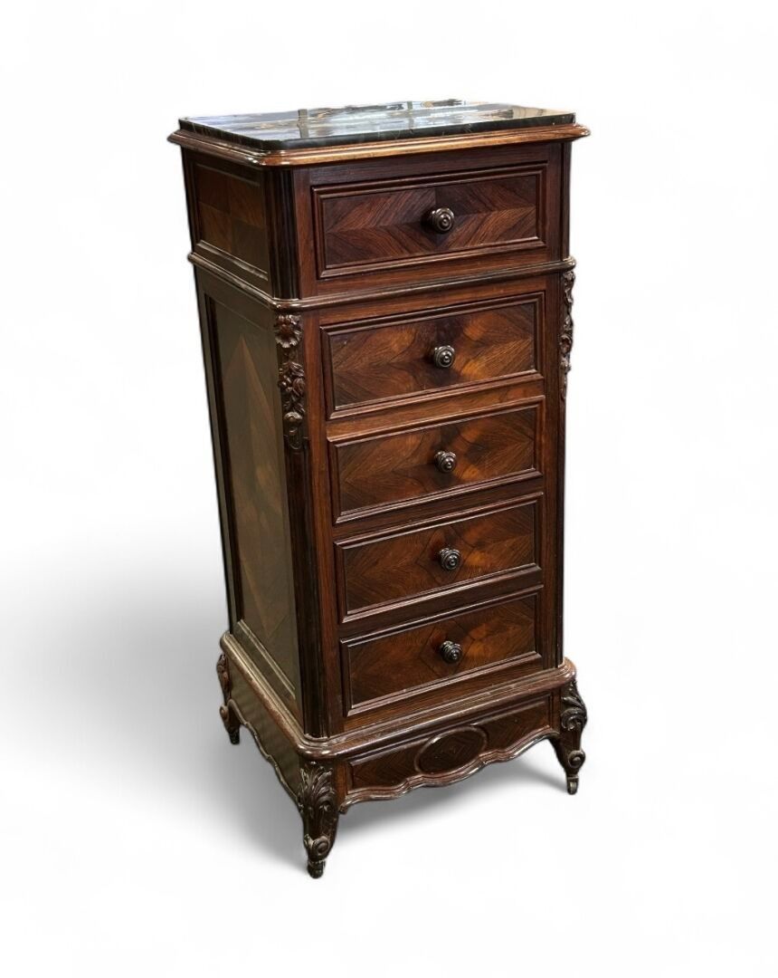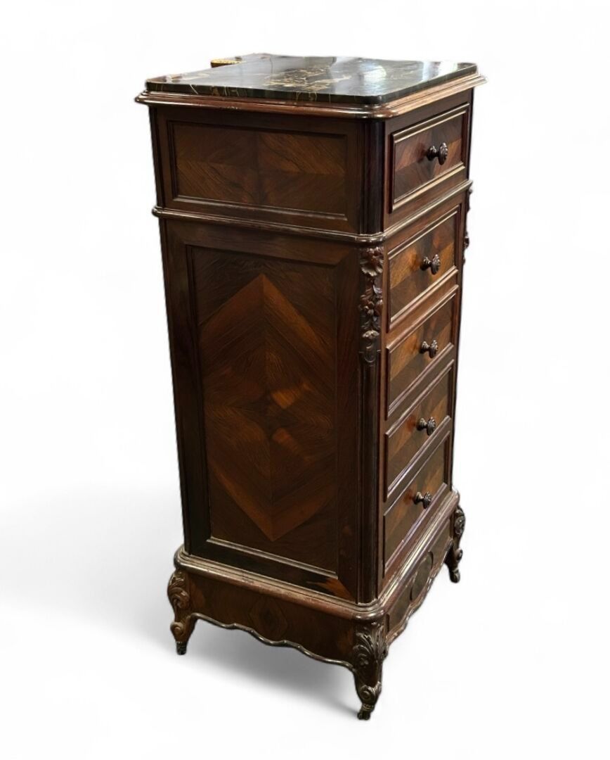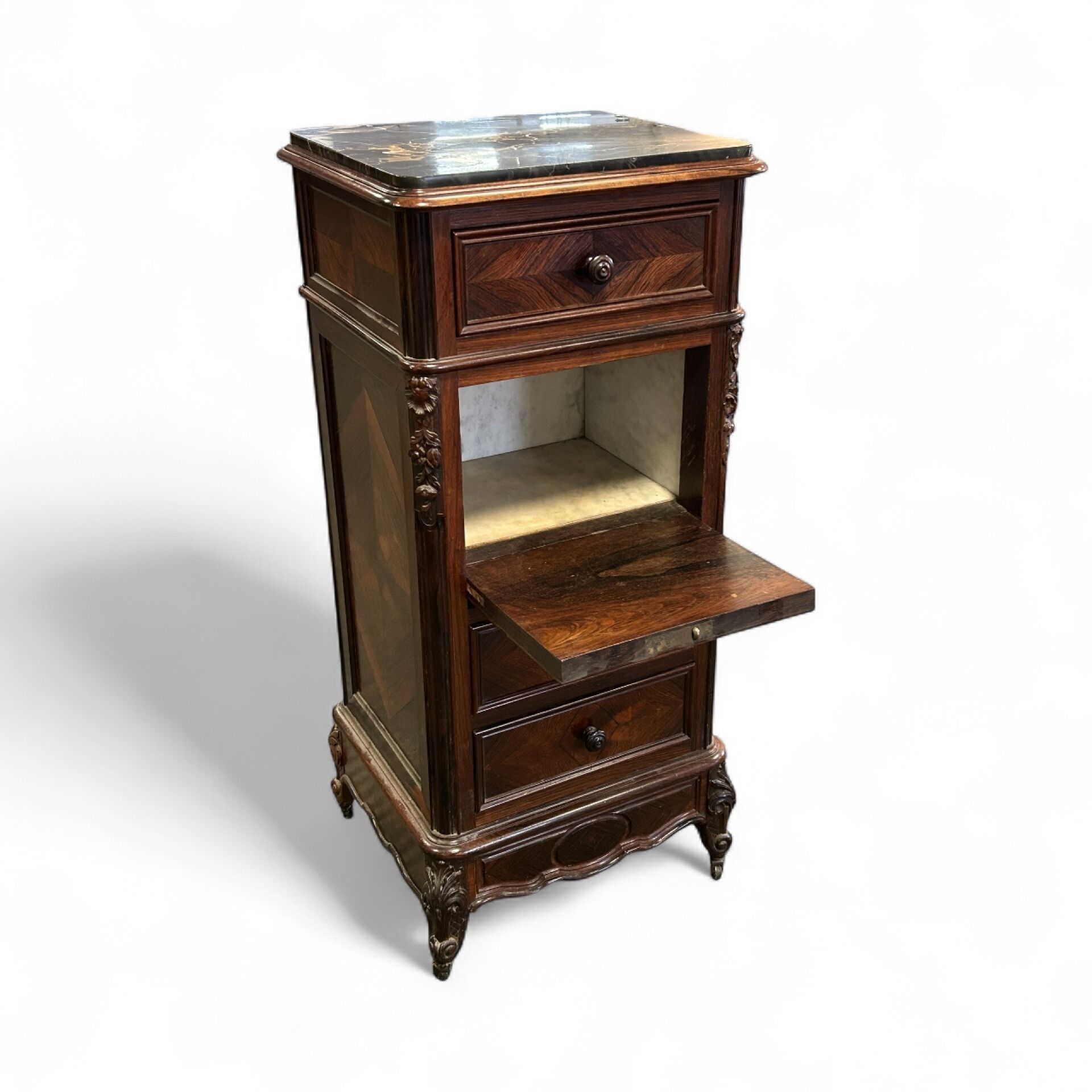 High bedside table in wood and rosewood veneer opening with three drawers and a flap decorated with two false drawers revealing a niche, uprights with carved floral decoration, black marble top with white veining, Work circa 1900. 97 x 43 x 37 cm