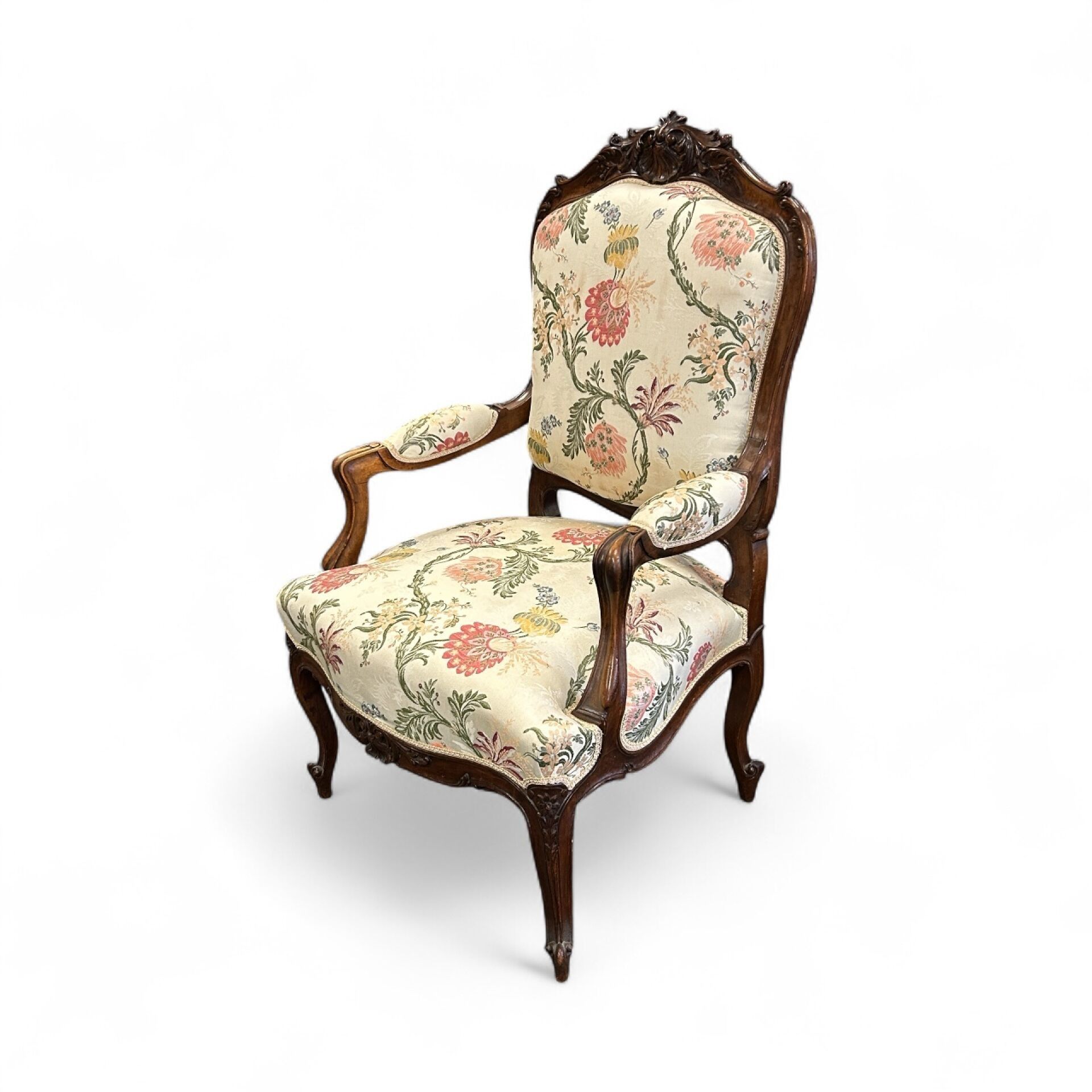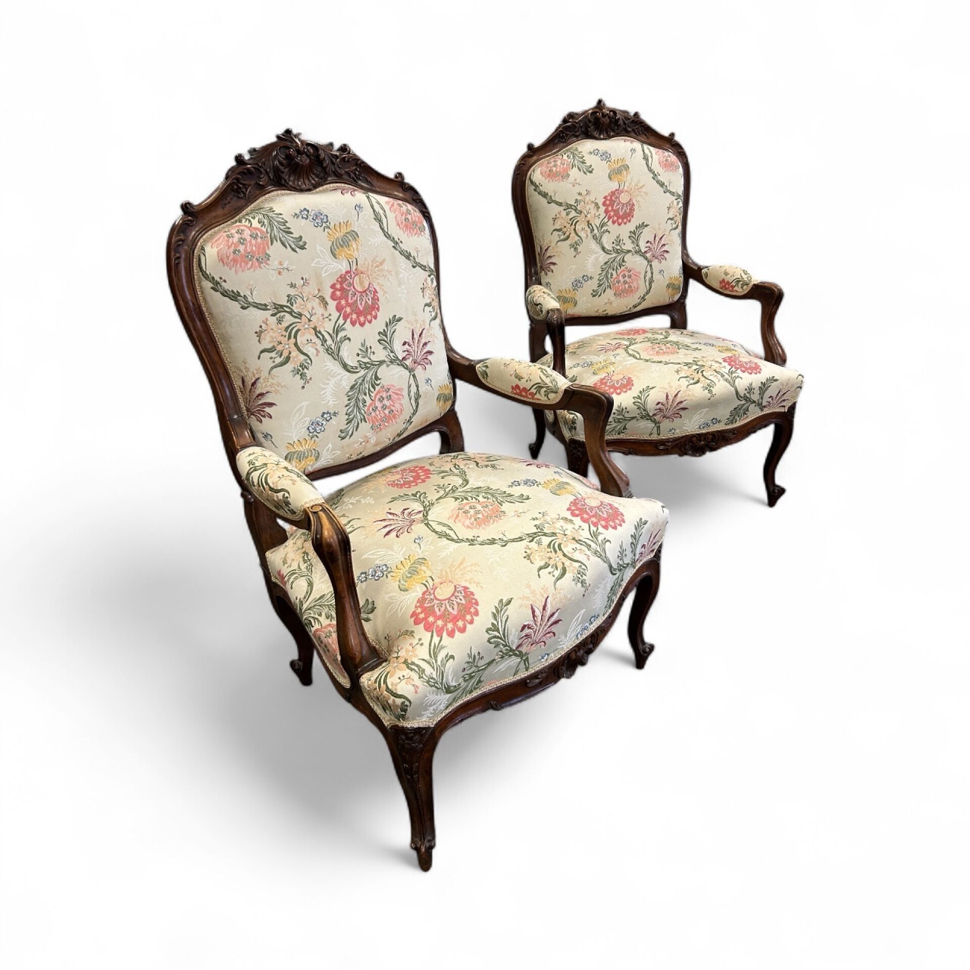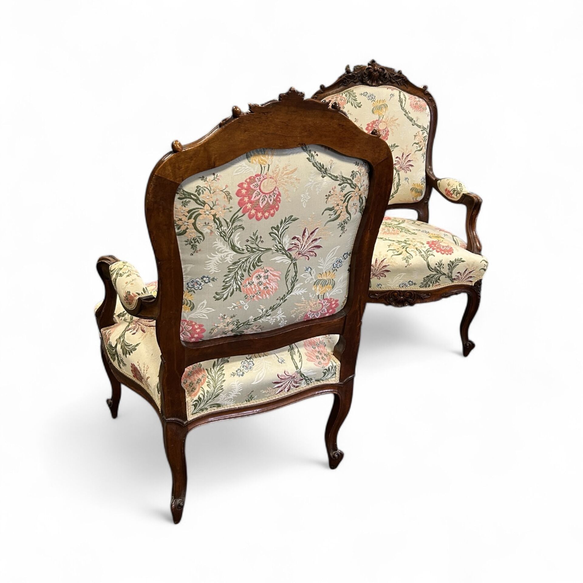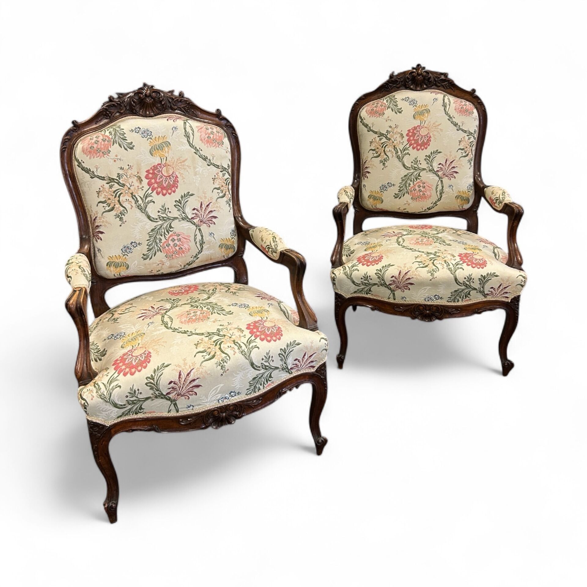 Pair of moulded and carved walnut armchairs decorated with shells, whiplash armrests, curved legs, floral fabric upholstery, Louis XV style, Work circa 1900. H. 107 cm L. 69.5 cm