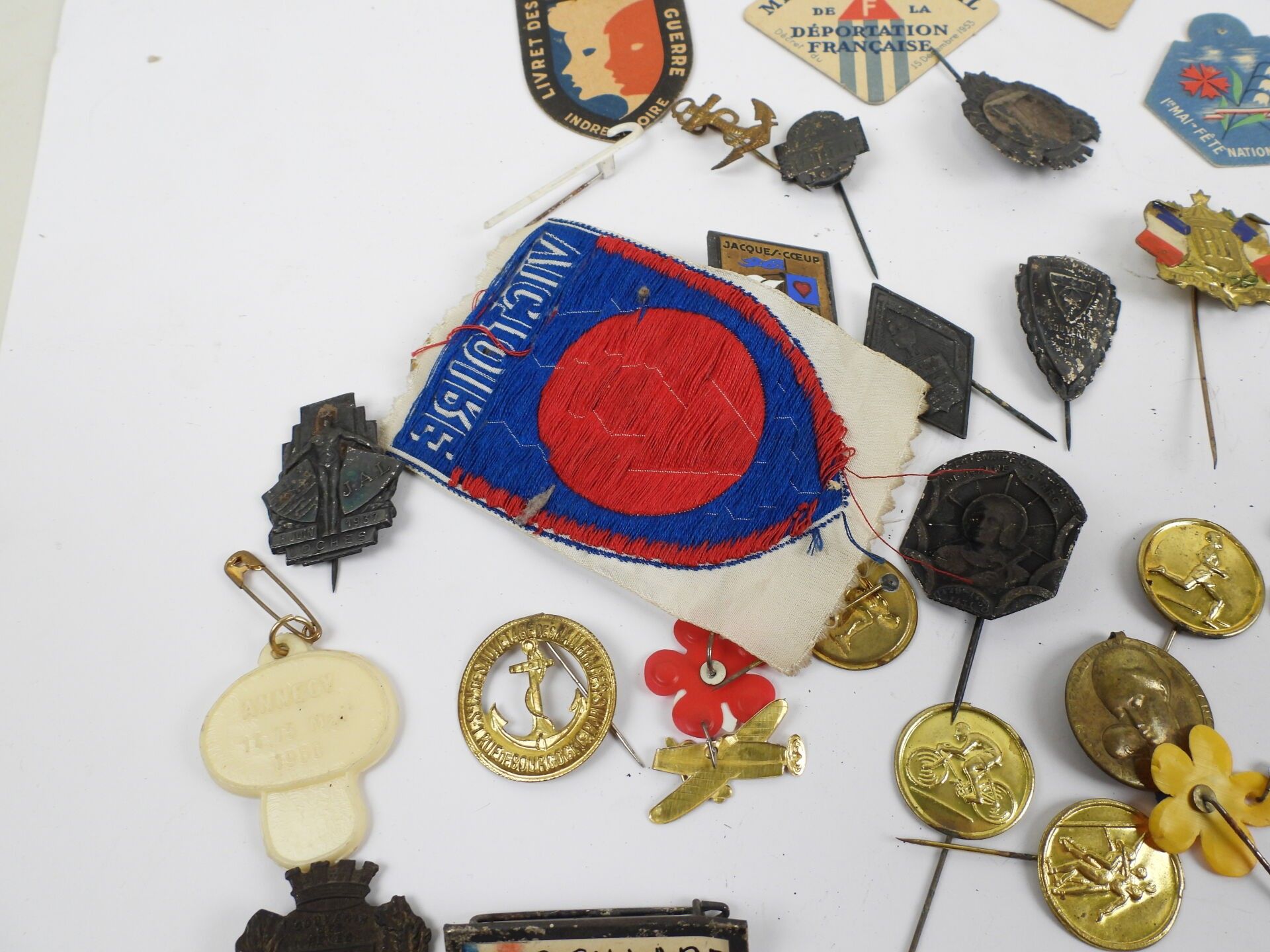 - Cardboard buttonhole insignia 1er Mai period État Français (x 2), Moustique France Libre, C.F.I. (centre de formation International), Mémorial National STRUTHOF de la Déportation Française, LIVRET DES ORPHELINS DE GUERRE Indre et Loire, Semaine Nationale de l'Enfance.