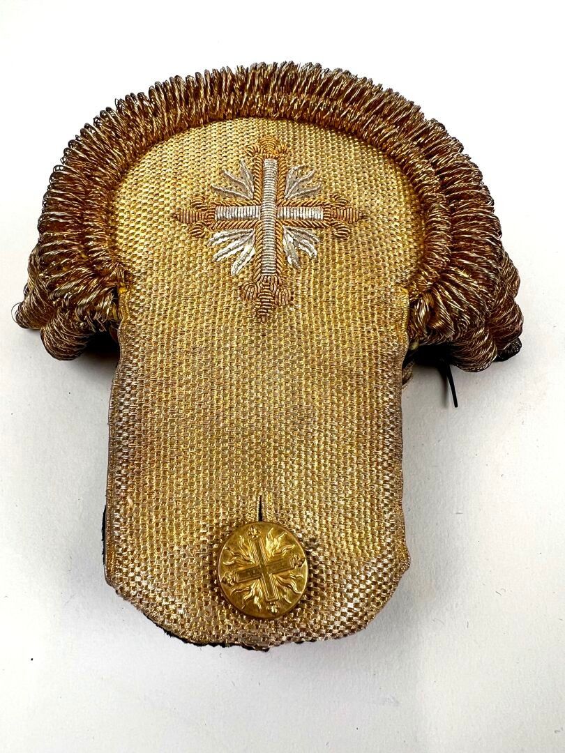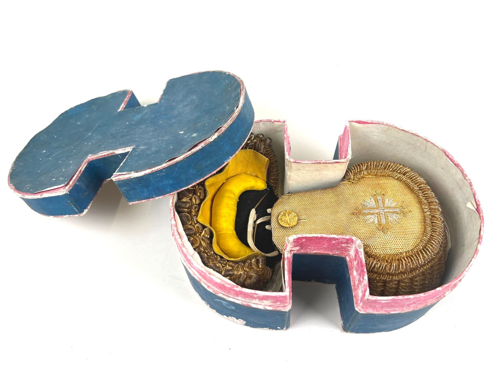 three gilt spun twirls with a double row of gold twisted fringes known as "spinach seeds" in gilt cannetille. The small module uniform buttons (Diam. 1.7 cm) in gilt stamped brass mounted on brass are present, as are the metal hooks for fixing to the uniform, present on the underside of the body. They come in a blue paper-covered cardboard box.