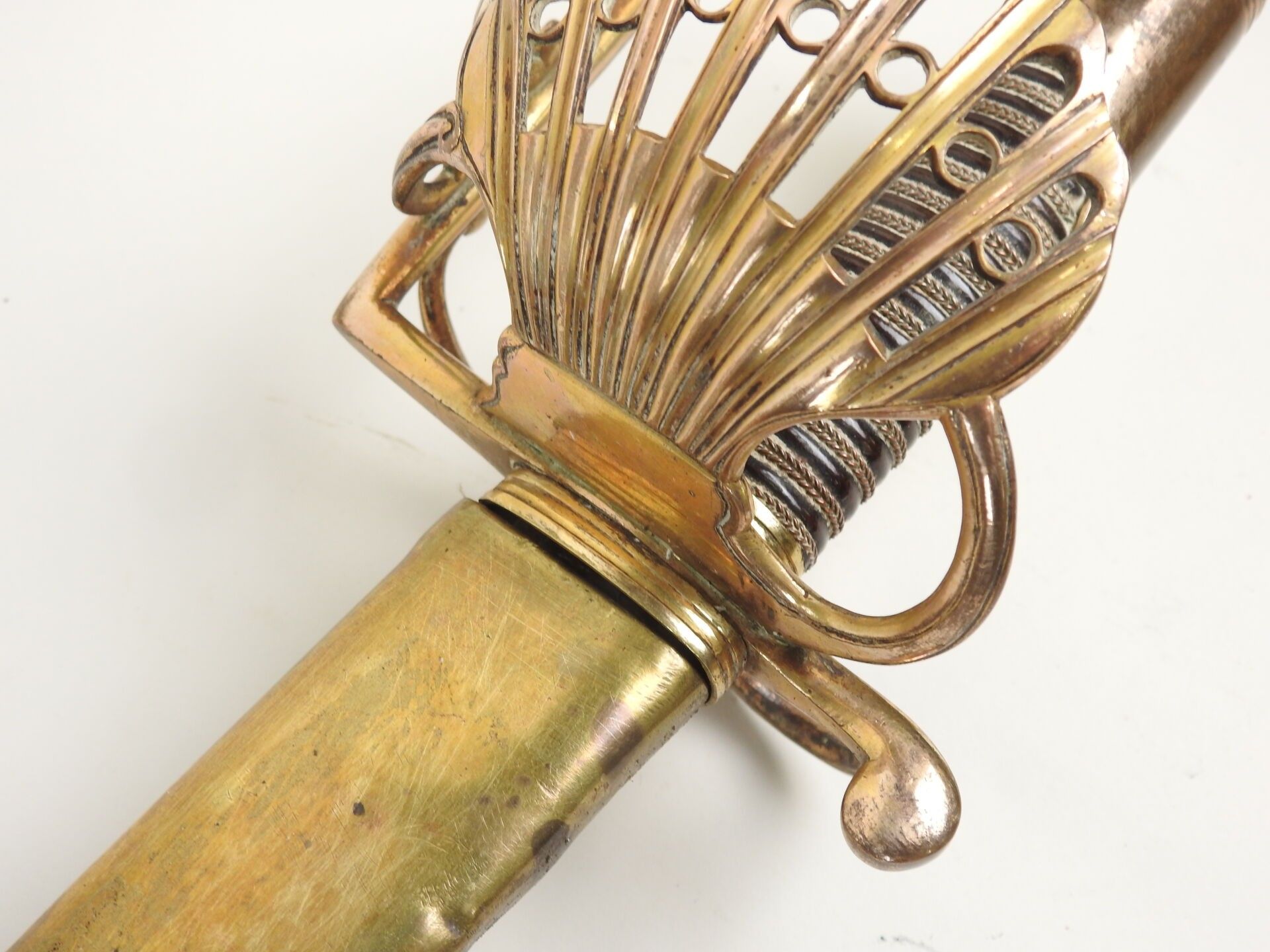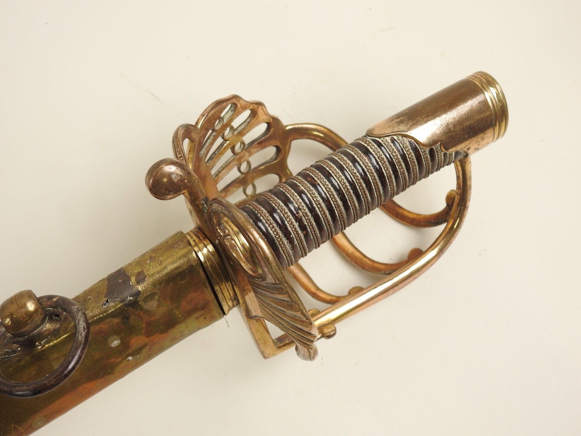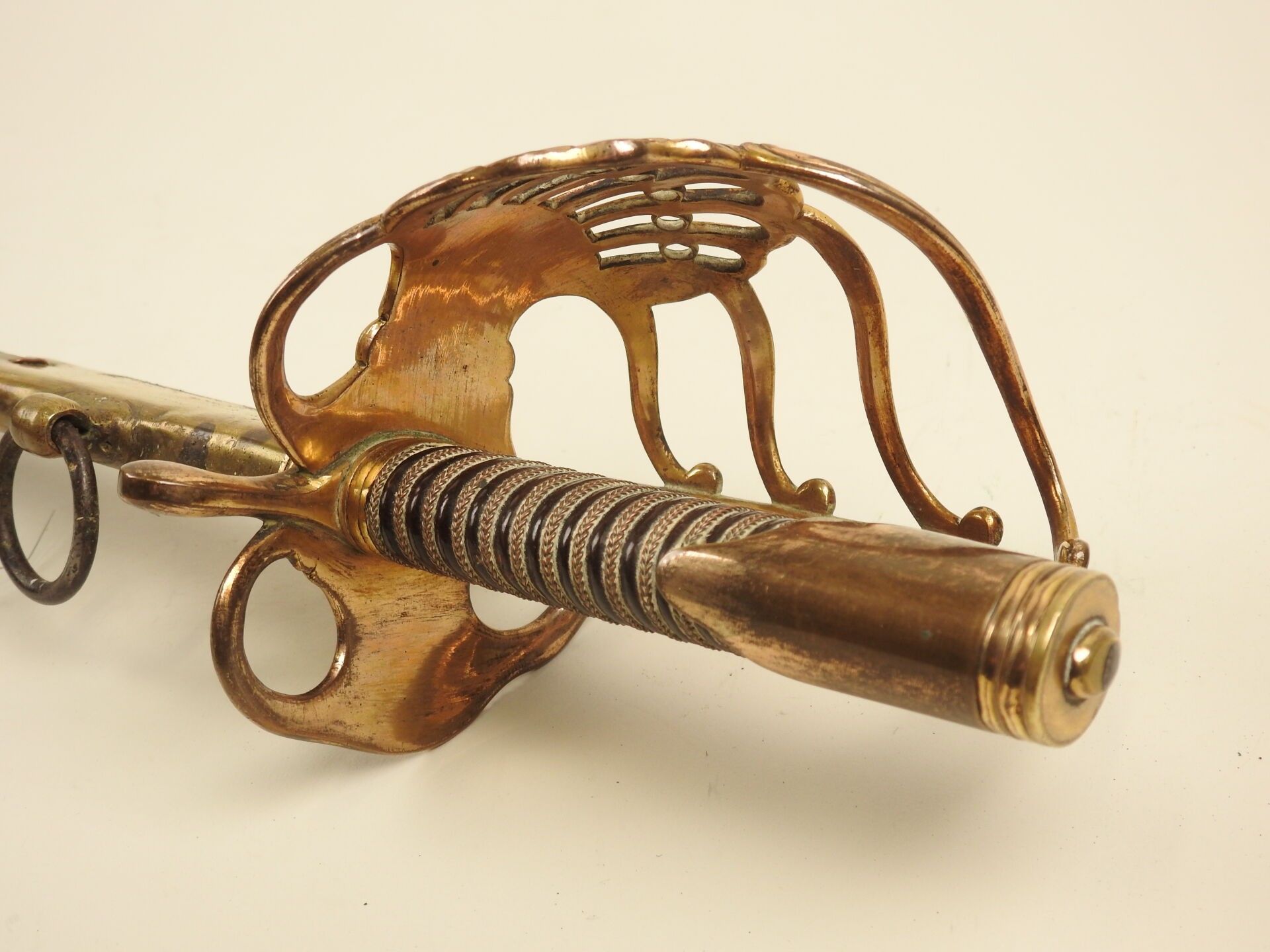 Gilt cast brass mounting, five-point guard forming a palmette-shaped openwork shell known as a "battle guard". Cut-out cap with short tail, line-decorated with a diamond-shaped rivet knob. Wooden handle covered in basane and filigree with double filigree of braided brass wire. Scabbard with leather tie under the frame. Beautiful, slightly curved, flat-backed blade, original blued and gold, one-third etched with trophies of arms, floral motifs and crowned imperial eagles. Signature in gold cartouches on the 1st third "Coulaux frères" on one side and "Manufacture de Klingenthal" on the other side. Black leather scabbard with three brass accolades and two steel suspension rings, asymmetrical brass stinger.