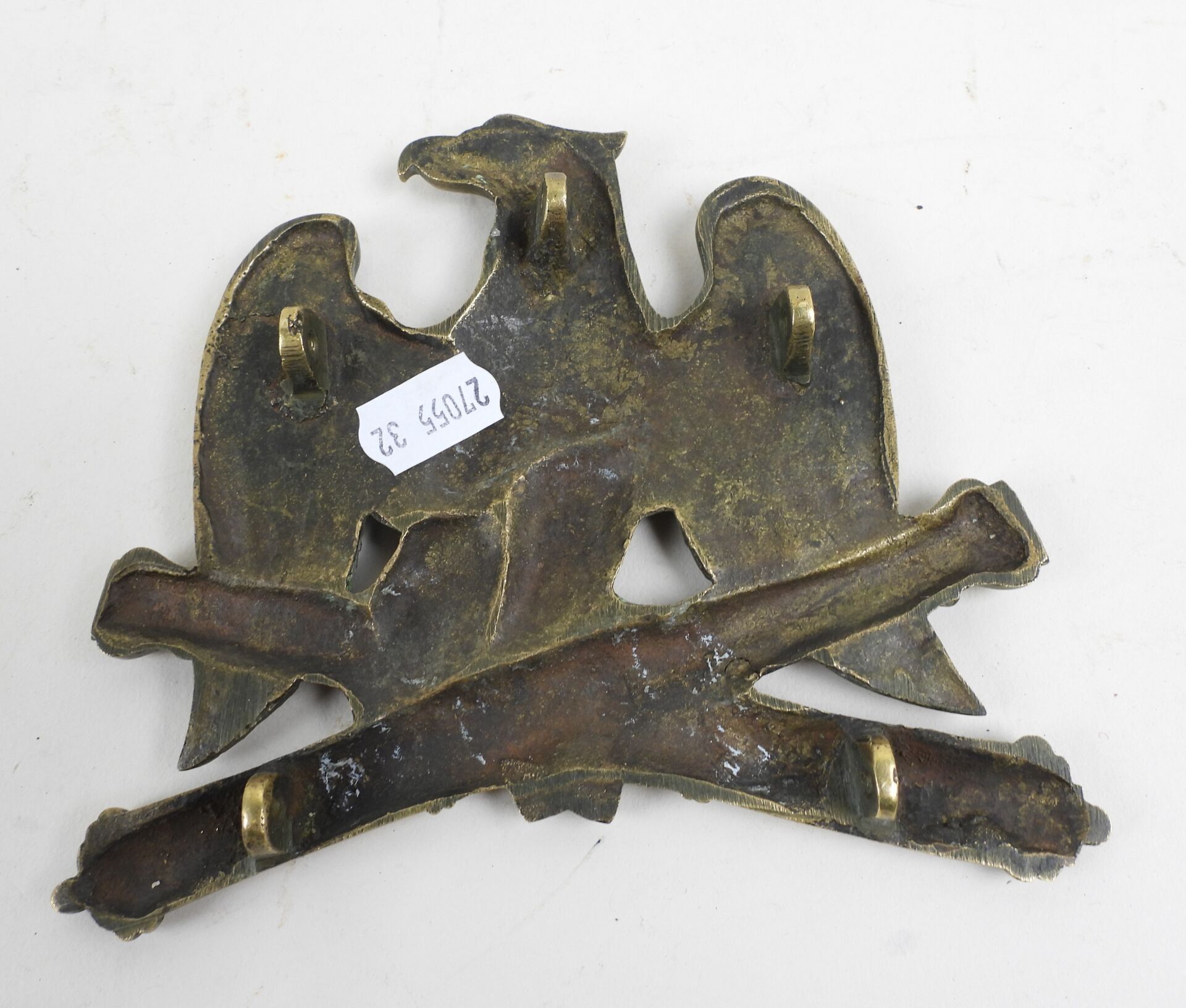 Cast brass representing an uncrowned eagle resting on two crossed barrels.