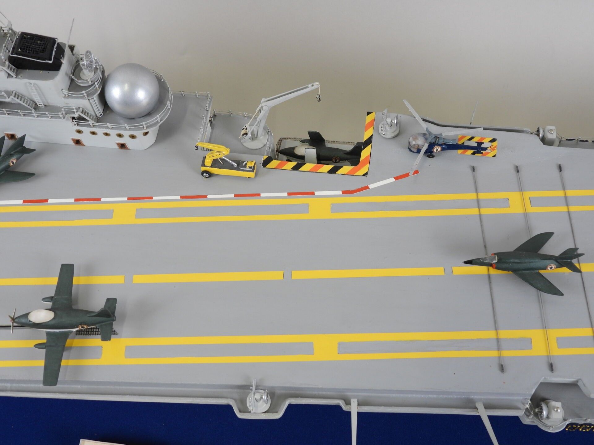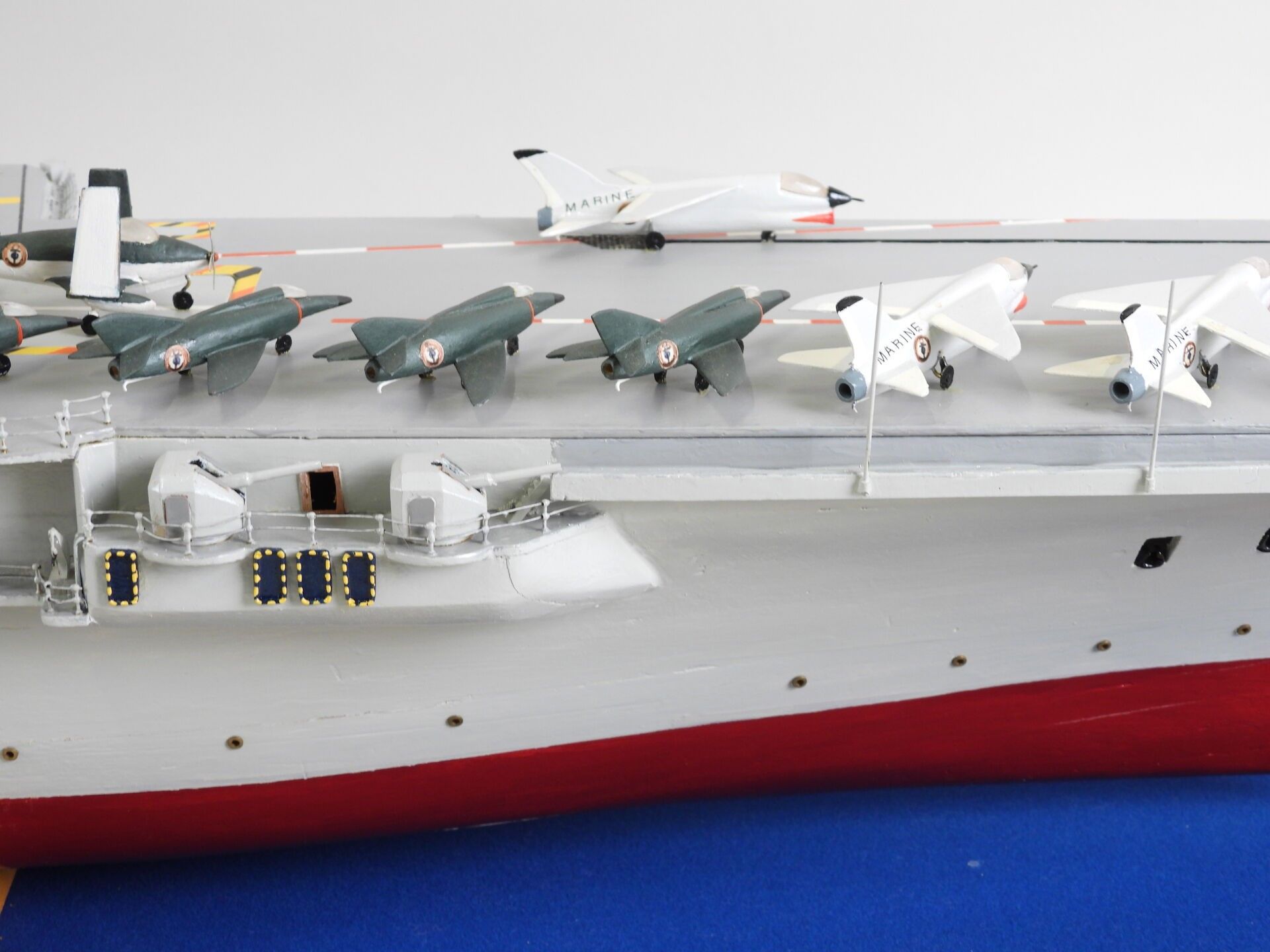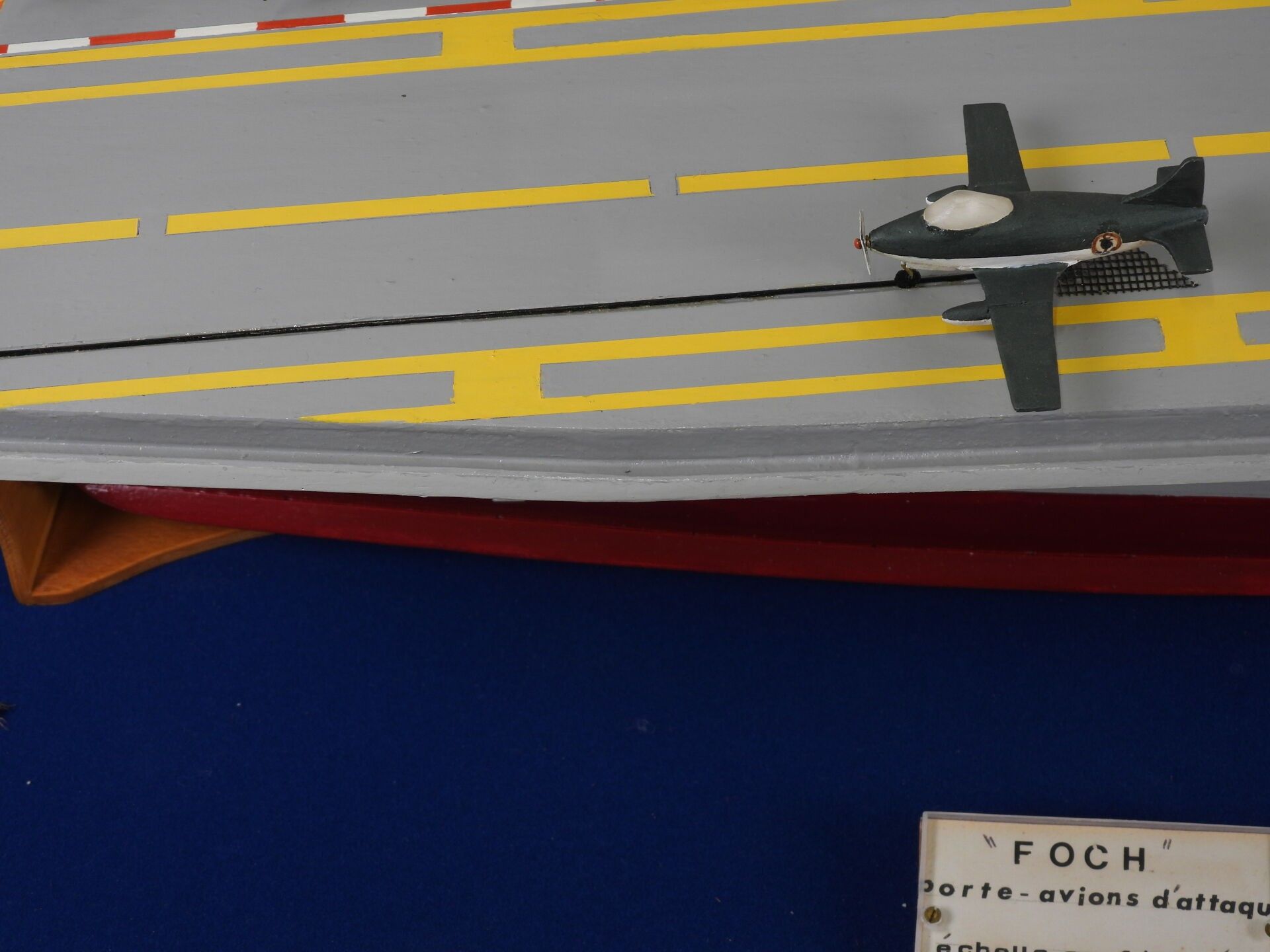 Large painted wood, metal and plastic model of the French Navy's "FOCH" attack aircraft carrier. In service from 1963 to 2000.