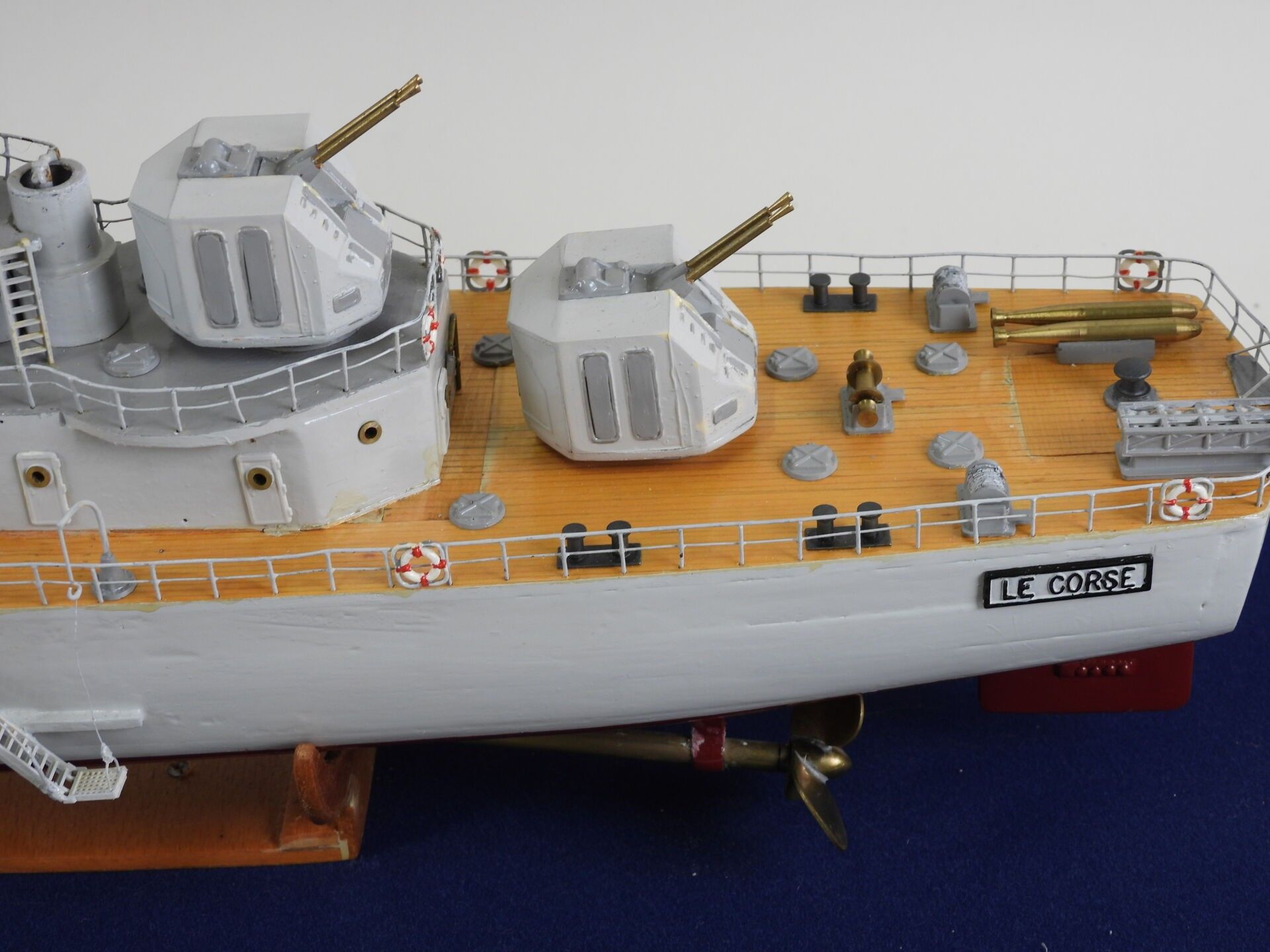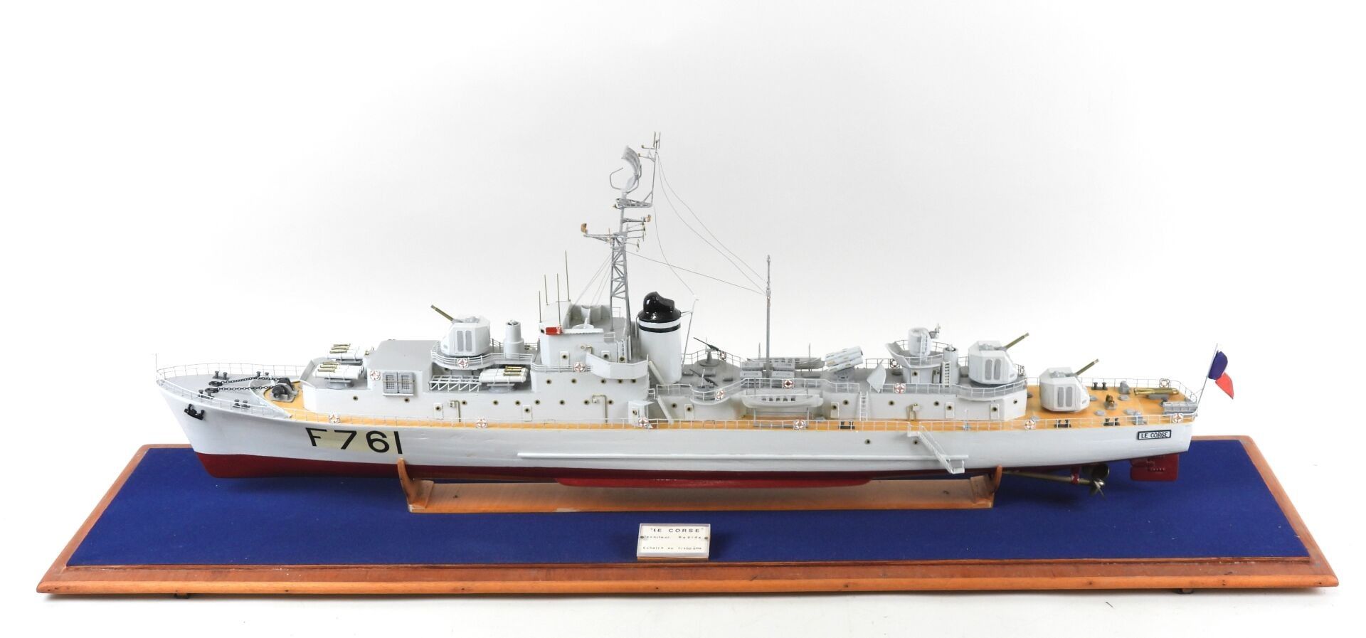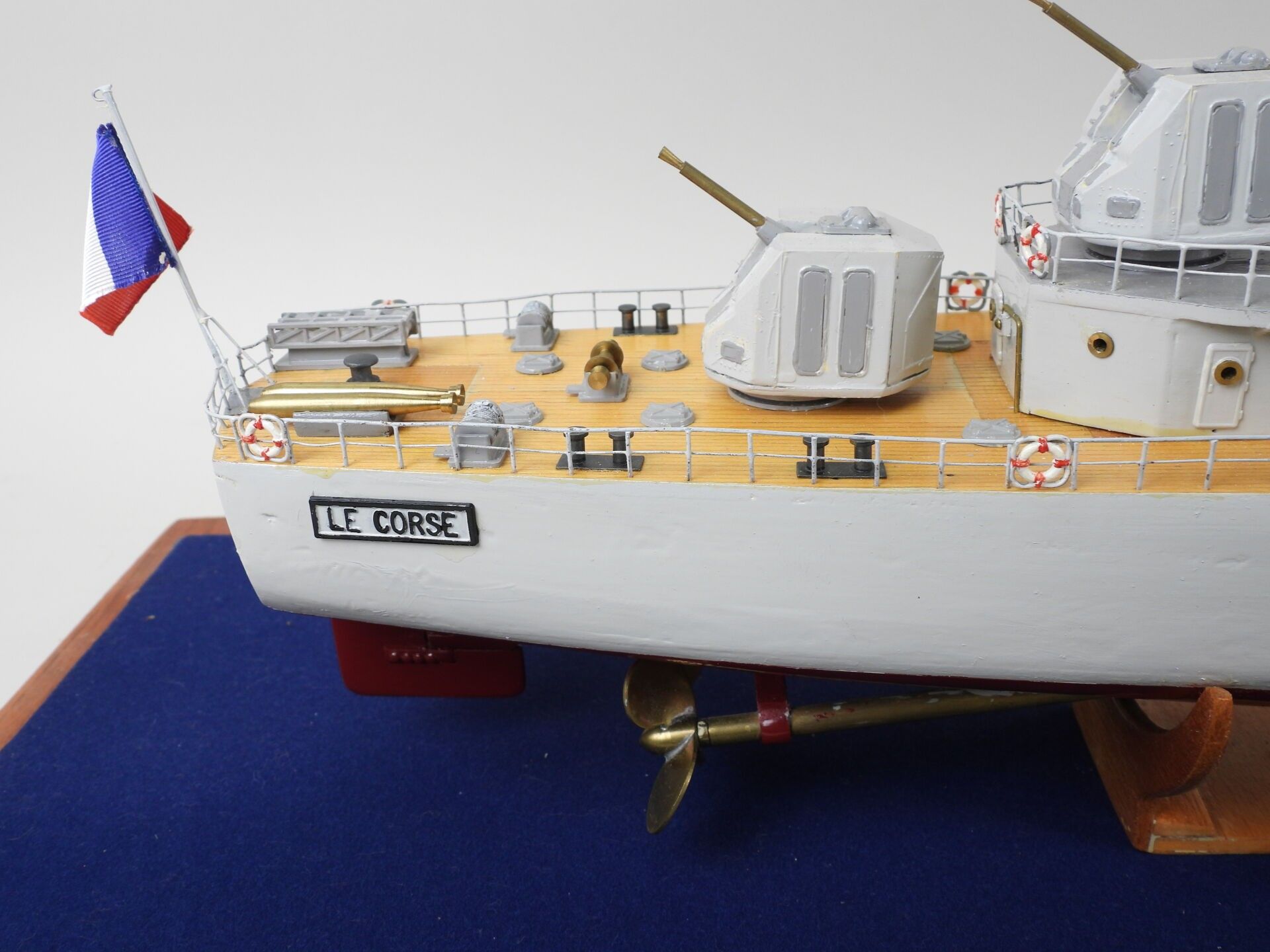 Large painted metal and wood model of the French Navy's fast escort ship "Le Corse". In service from 1952 to 1975.