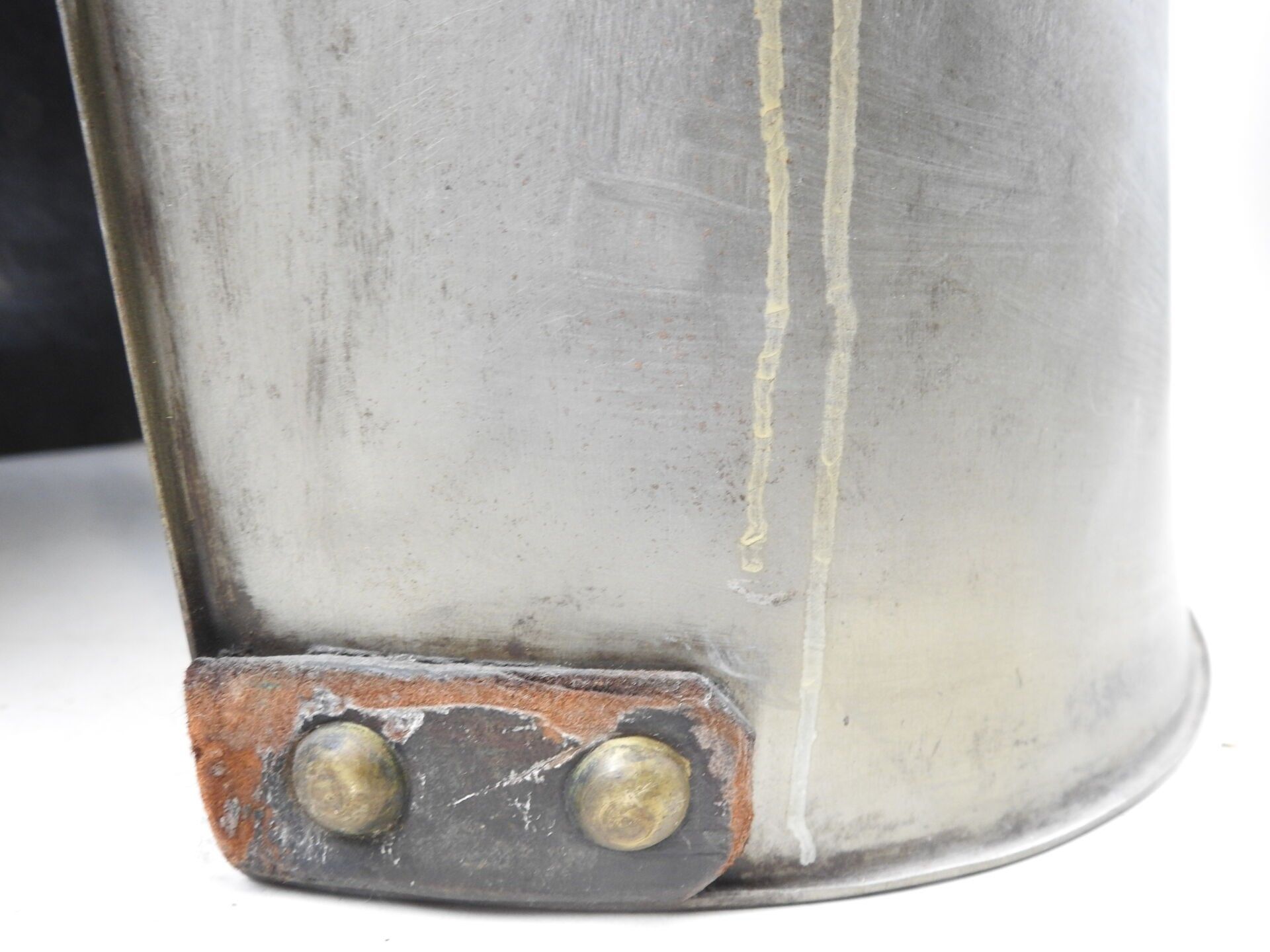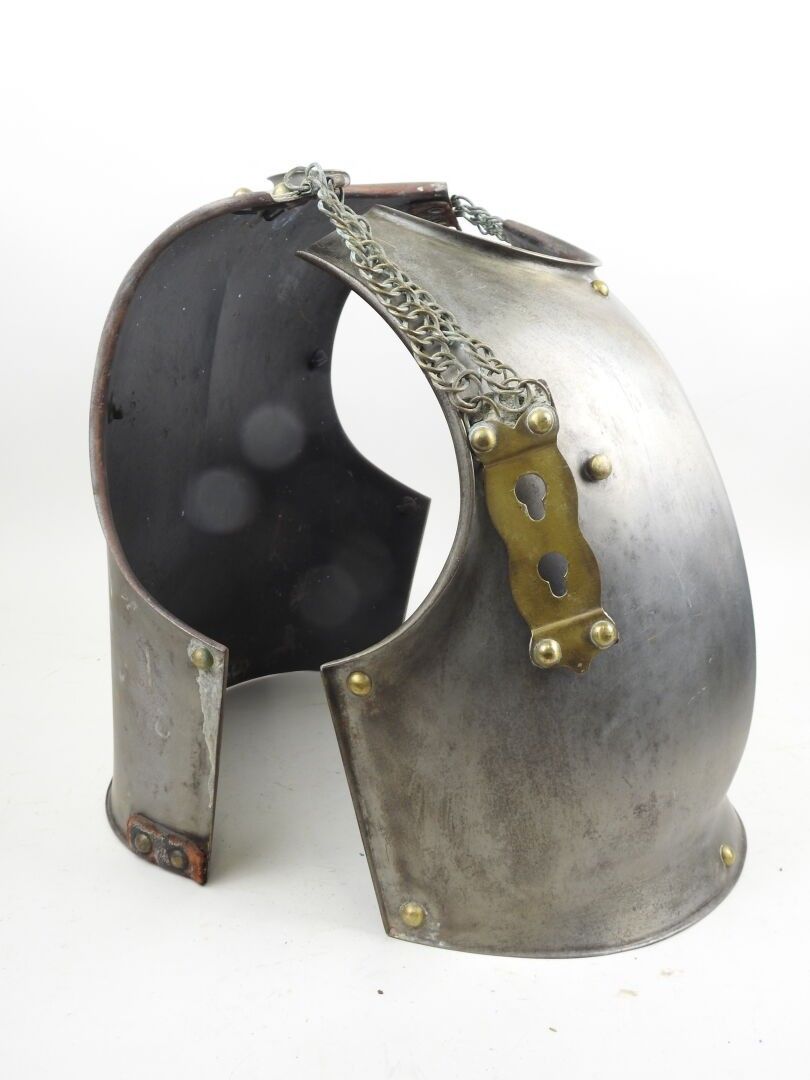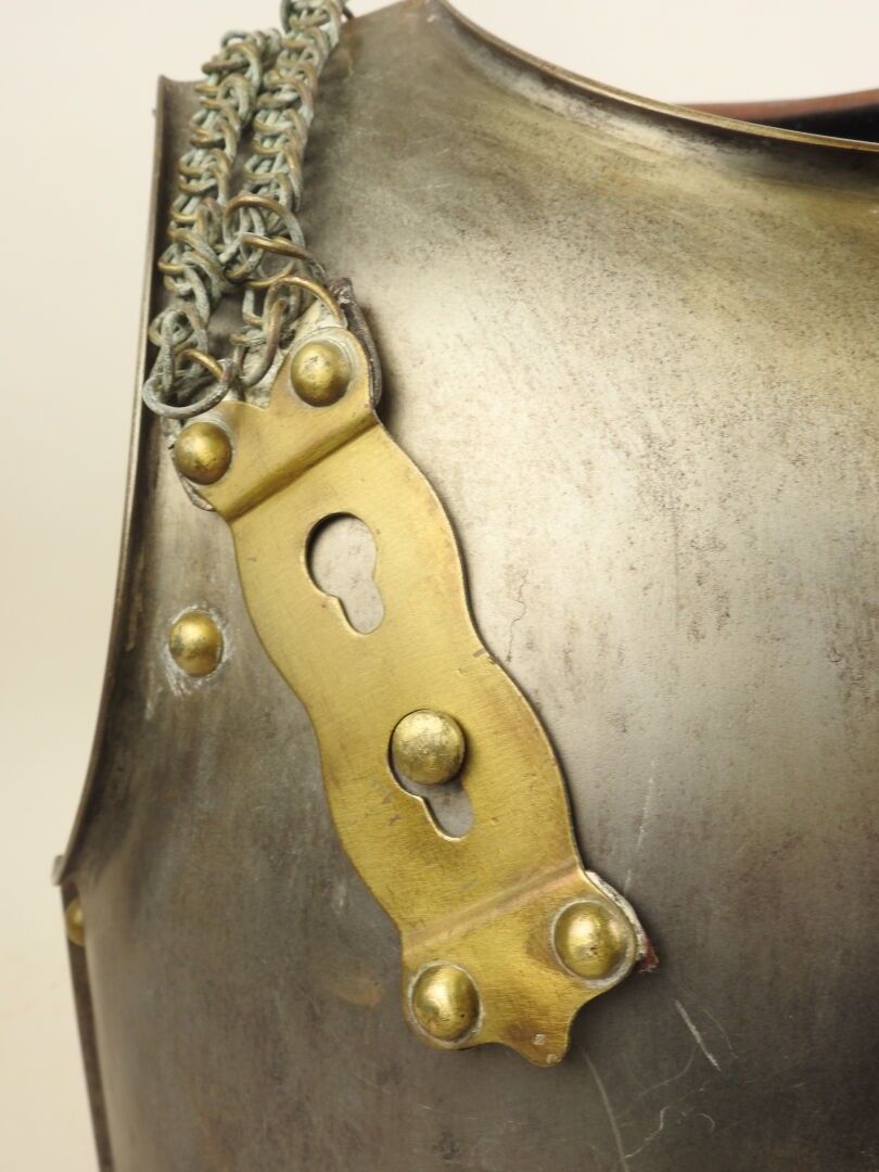 Plastron and dossière in steel with a small stained grey patina, each edged with eight brass rivets. They are stamped on the outer edges at the level of a shoulder pad "1106". Leather straps with ring chains, brass buttonhole plates and leather ties. Leather belt missing. The interiors have been repainted black with minor traces of rust oxidation. The breastplate is marked "Manufacture Royale de Klingenthal Août 1829" and "3e T. 1e L. N°4933". The backrest is marked "Manufacture Royale de Klingenthal Septembre 1828" and "3e T. 1e L. N°3148". The hooks for the interior padding are present.