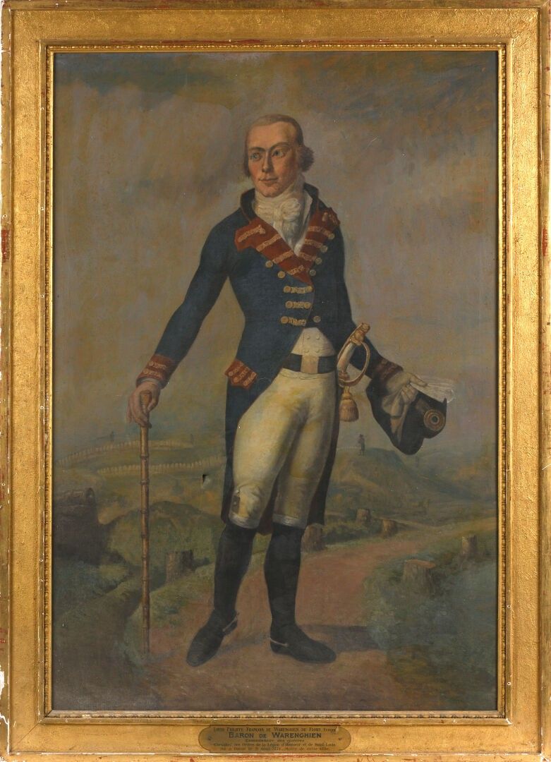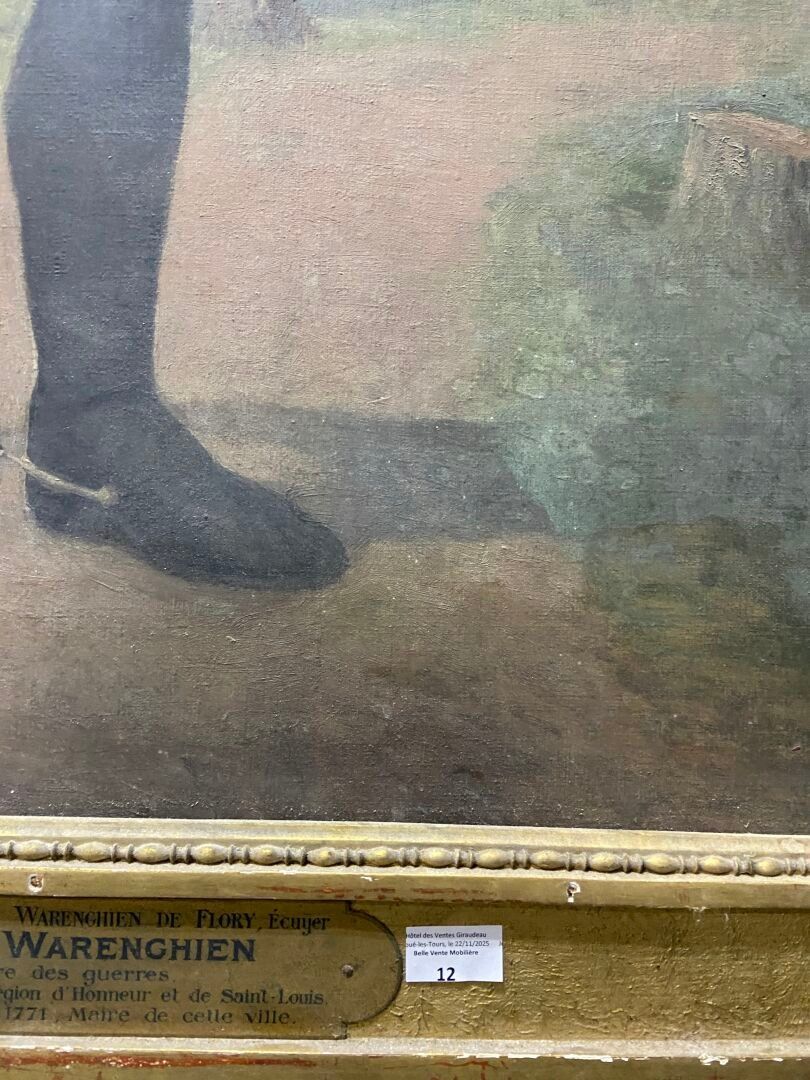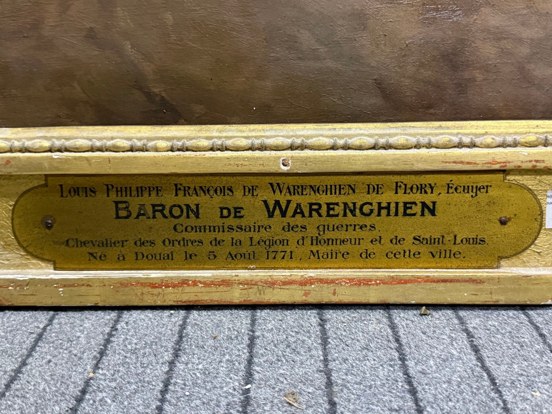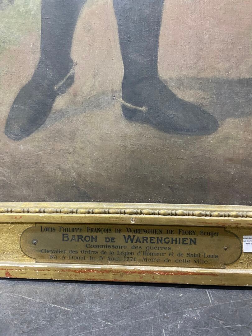 Large oil on canvas with a cartouche on the frame stating: "Louis Philippe François de WARENGHIEN de FLORY, Écuyer, Baron de WARENGHIEN, Commissaire des Guerres, Chevalier de la Légion d'Honneur et de Saint-Louis, né à Douai le Août 1771, Maire de cette ville".