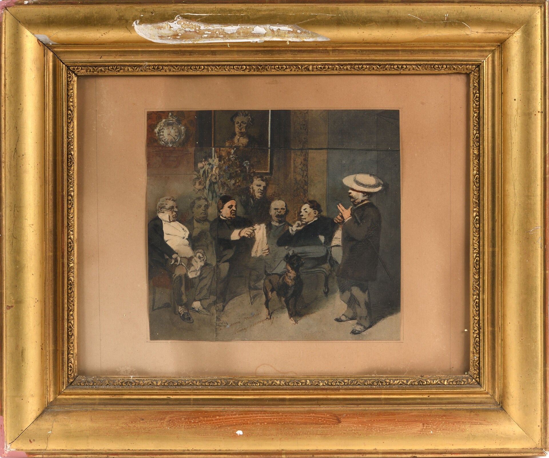 Note: Gift from Henry MONNIER to his friend Charles VERNIER (1813-1892), a draughtsman and caricaturist like himself. The artist is shown here on the left of the assembly in his usual attire, that of his caricatured character Monsieur PRUD'HOMME.