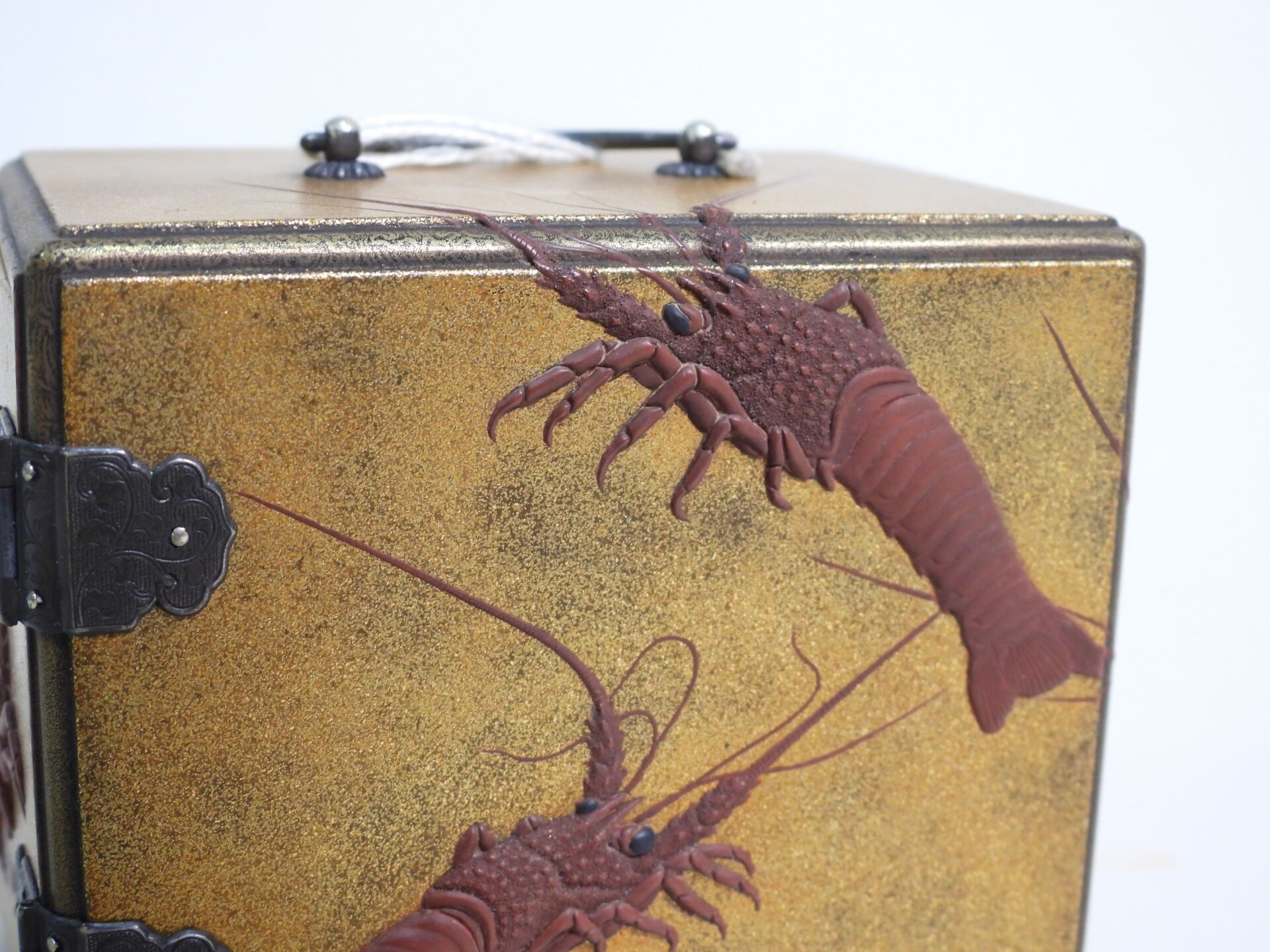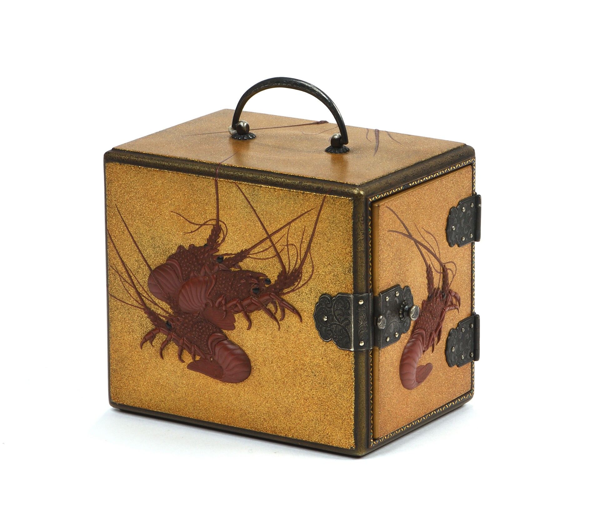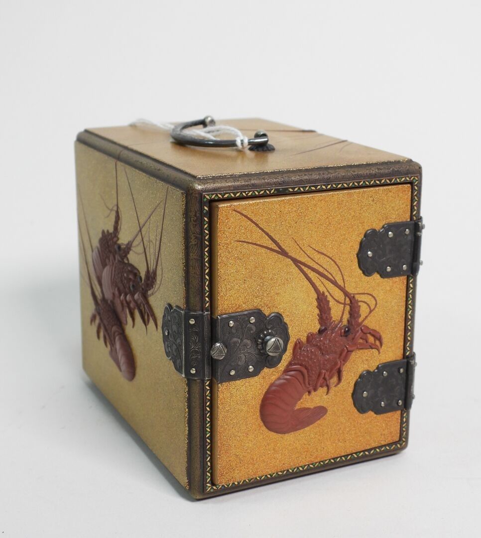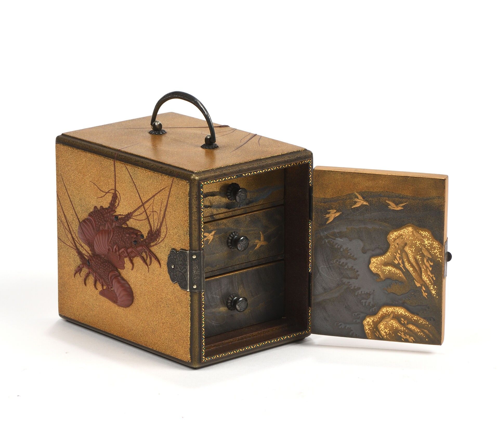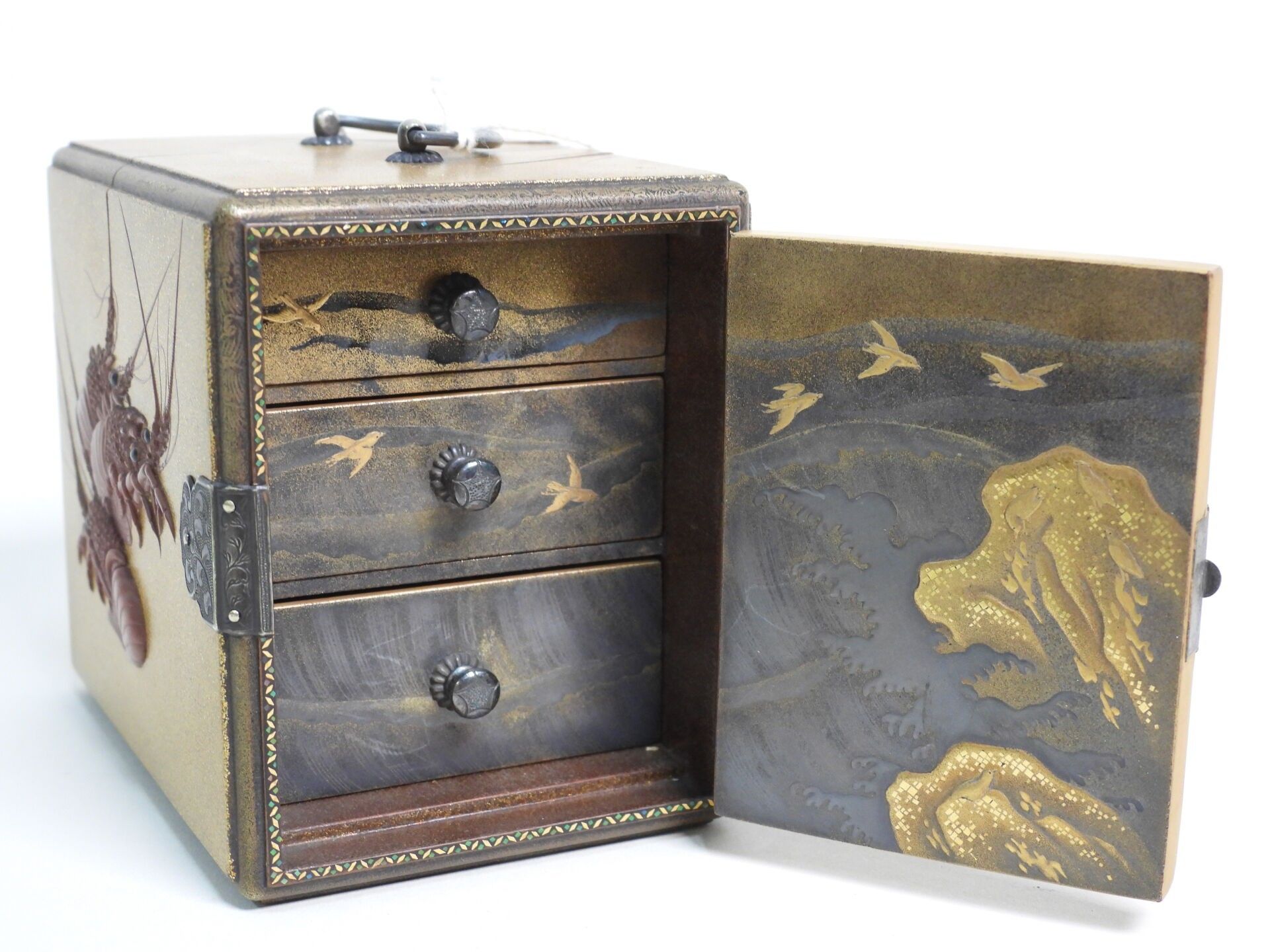 Kabako box in gold powder lacquer opening through a small door revealing 3 drawers. Red lacquer decoration of crayfish and birds in takamaki-e enhanced with gold.