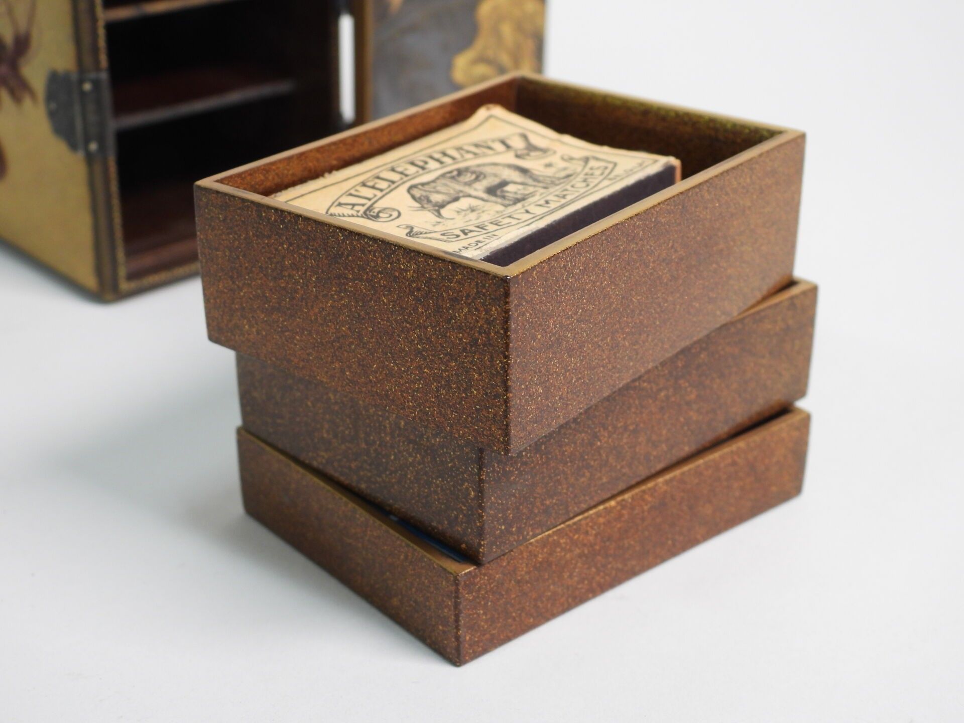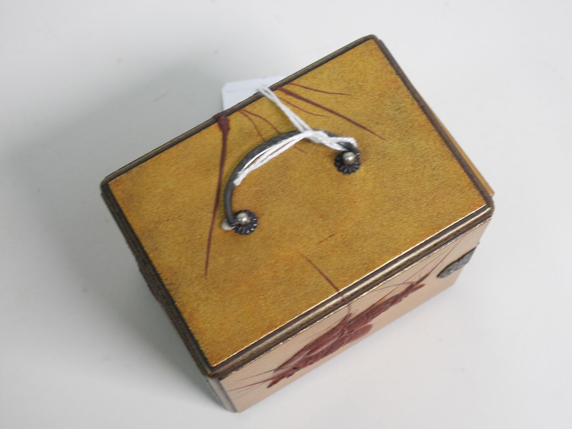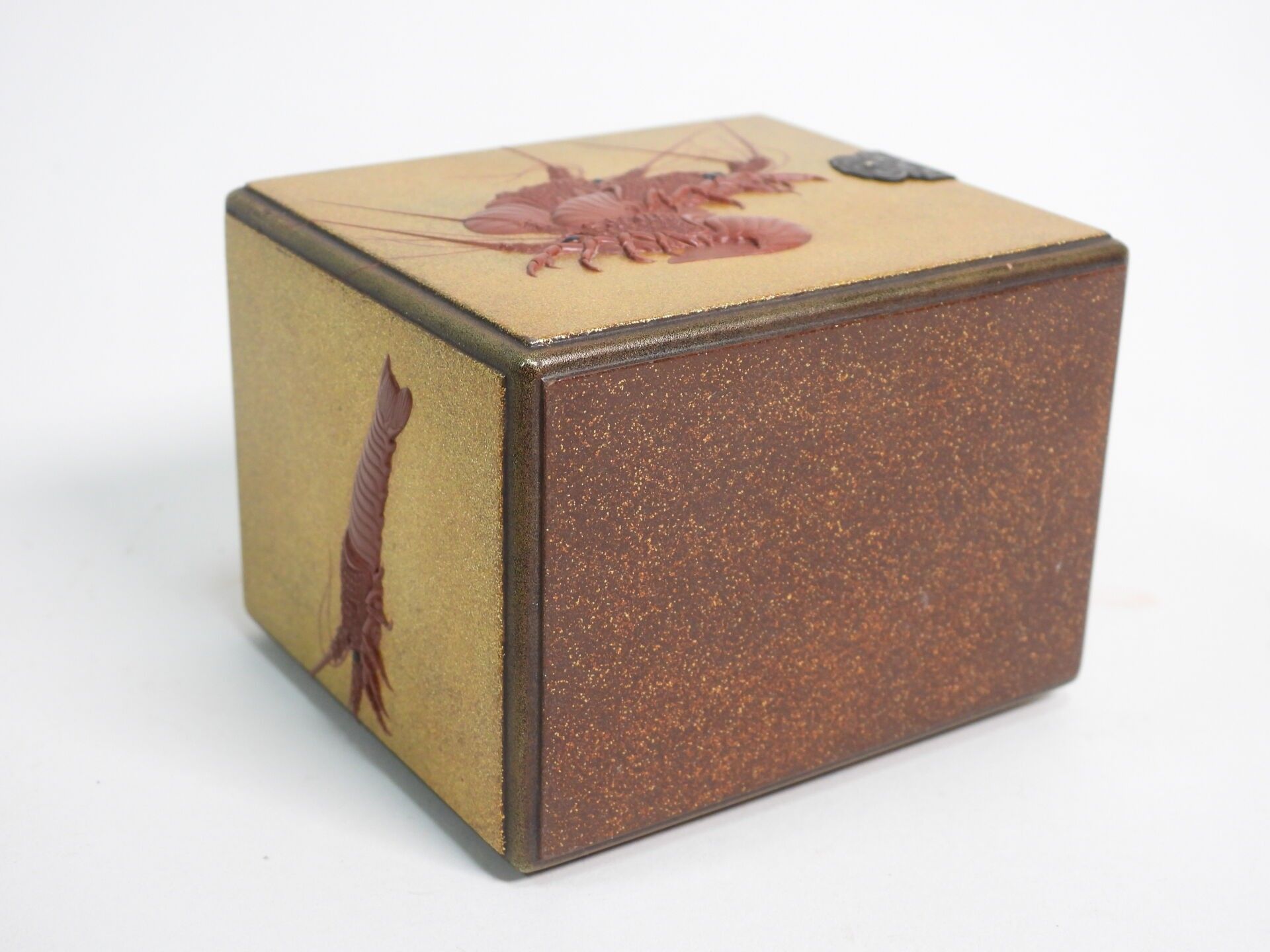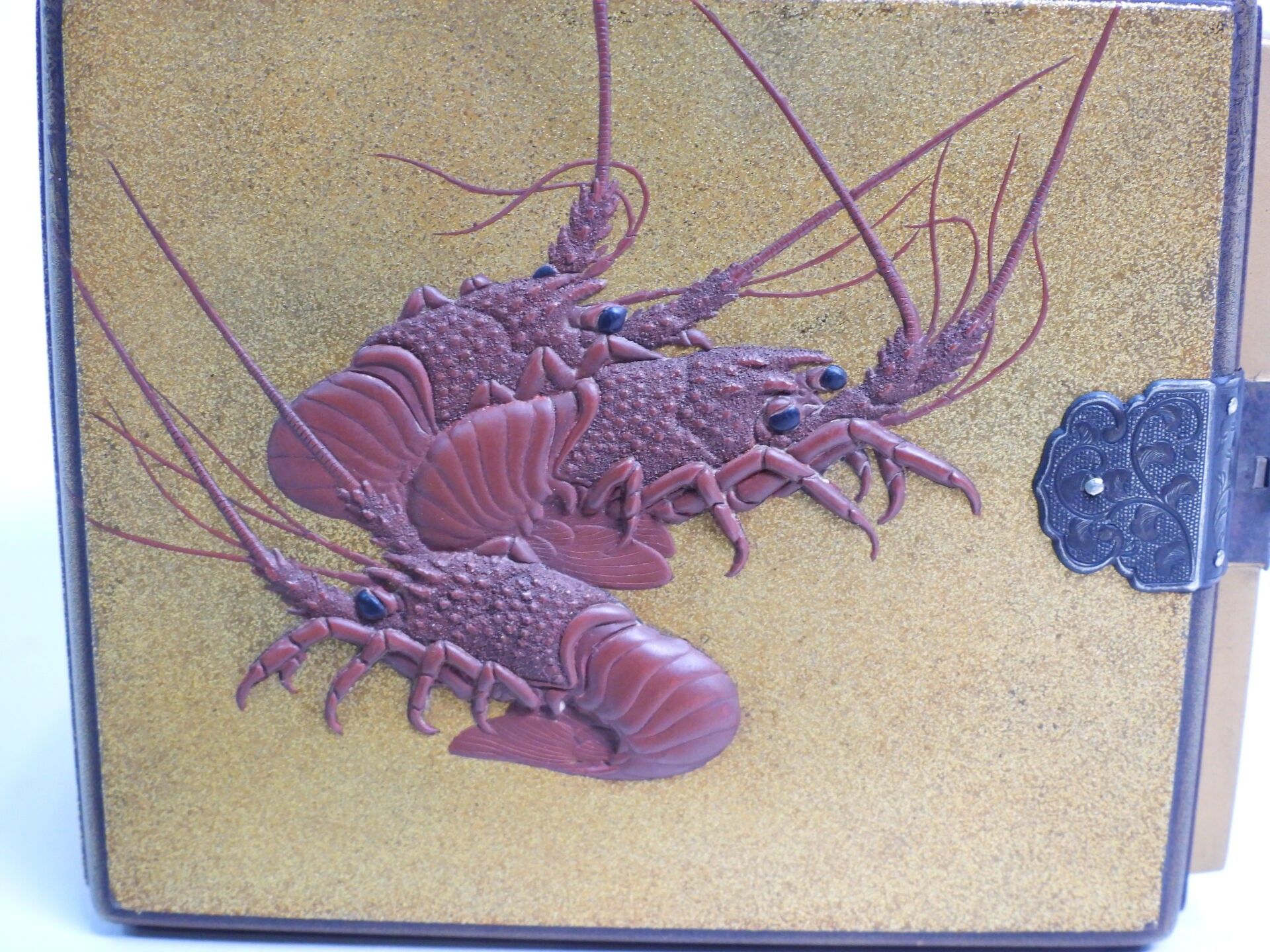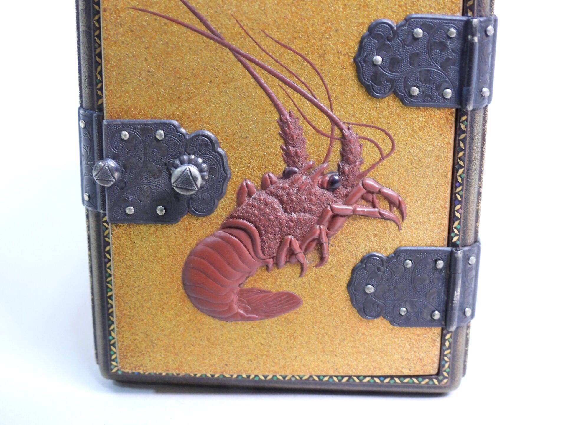 Kabako box in gold powder lacquer opening through a small door revealing 3 drawers. Red lacquer decoration of crayfish and birds in takamaki-e enhanced with gold.