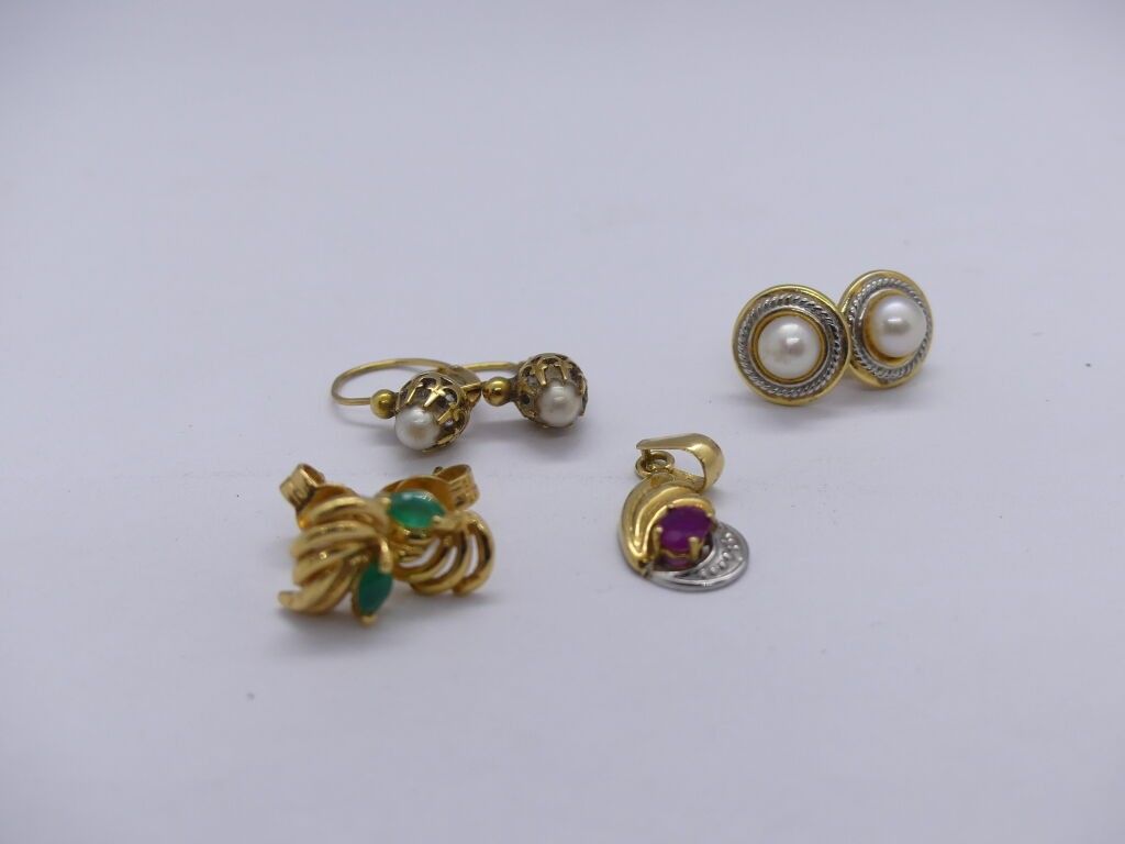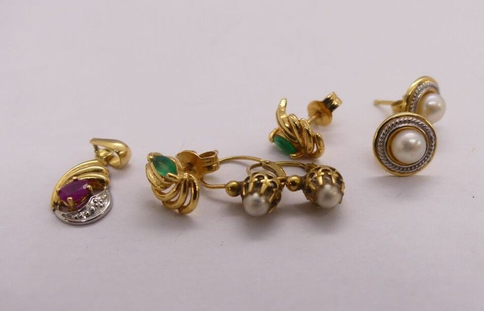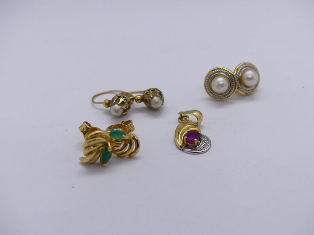 Gold lot comprising 2 pairs of earrings with emeralds and pearls, pair of children's dormeuses, ruby or pink sapphire pendant