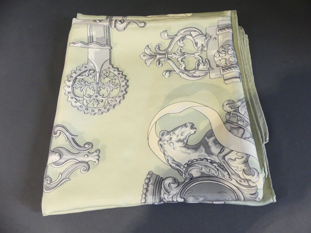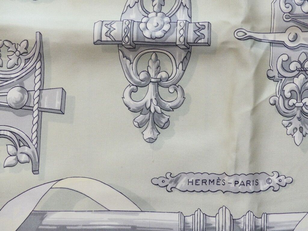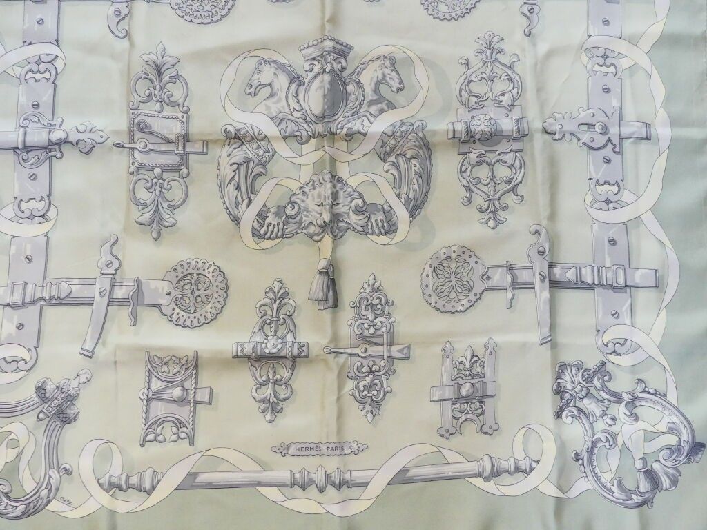 Printed silk square on a white background decorated with keys, locks and trimmings on an almond green background.